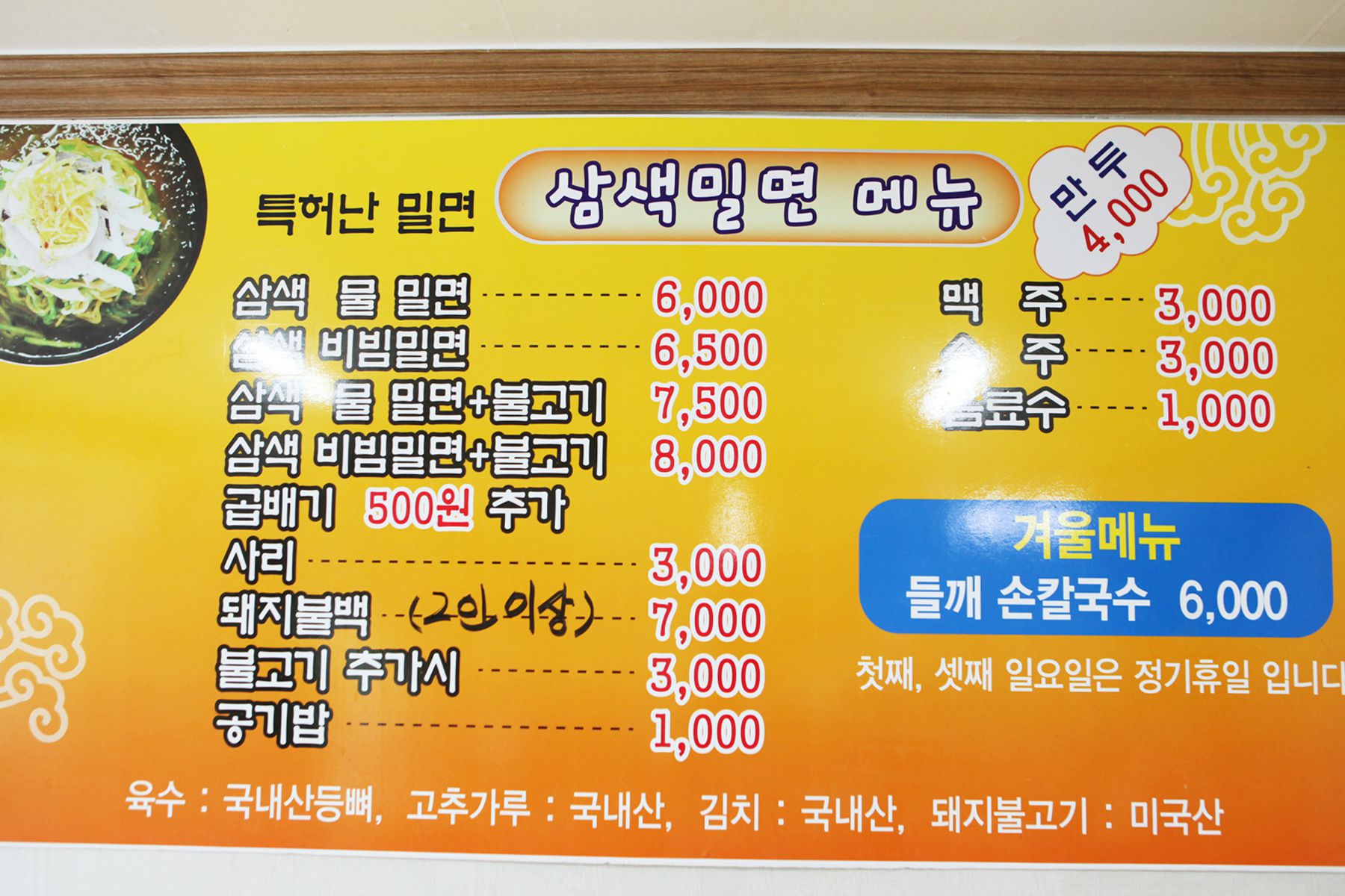 특허낸 삼색밀면의 특별하고 이색적인 맛을 즐겨보세요.