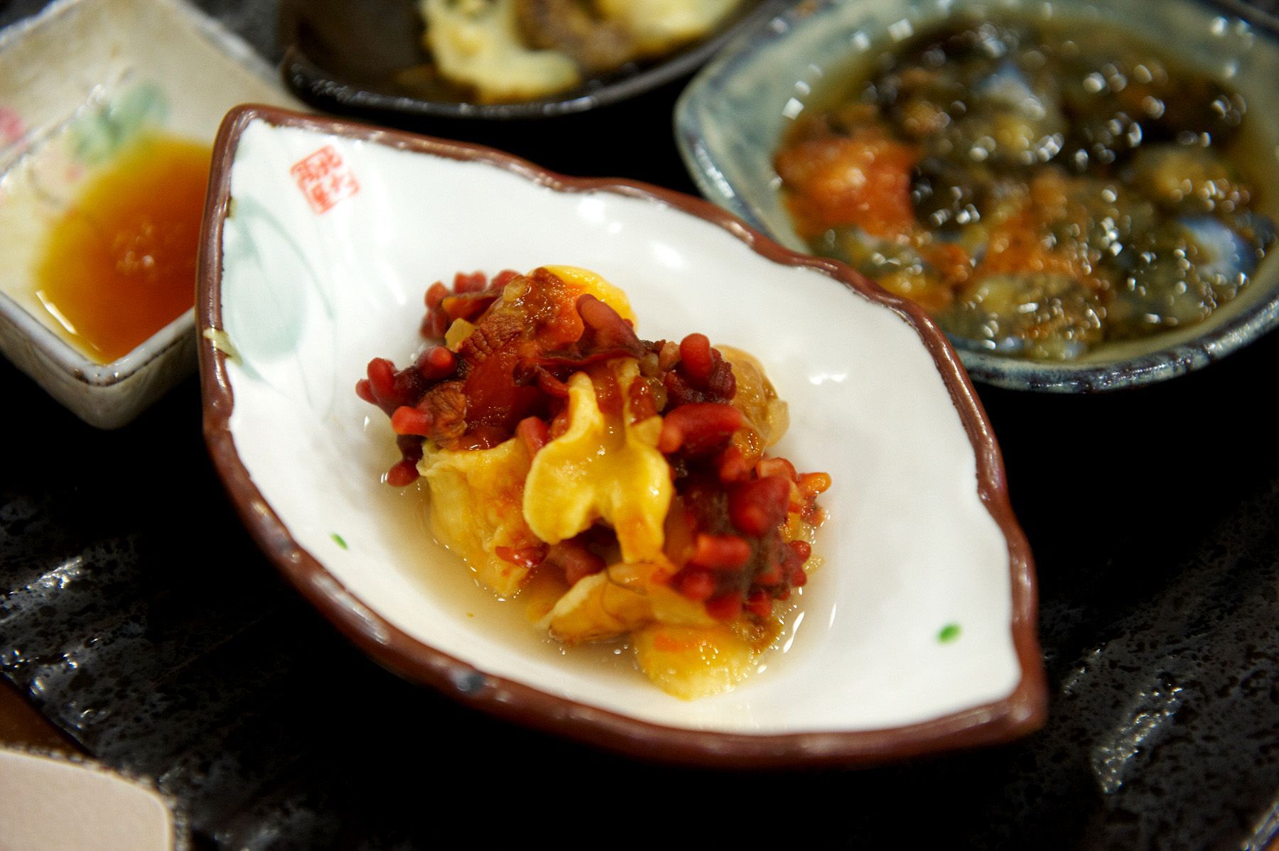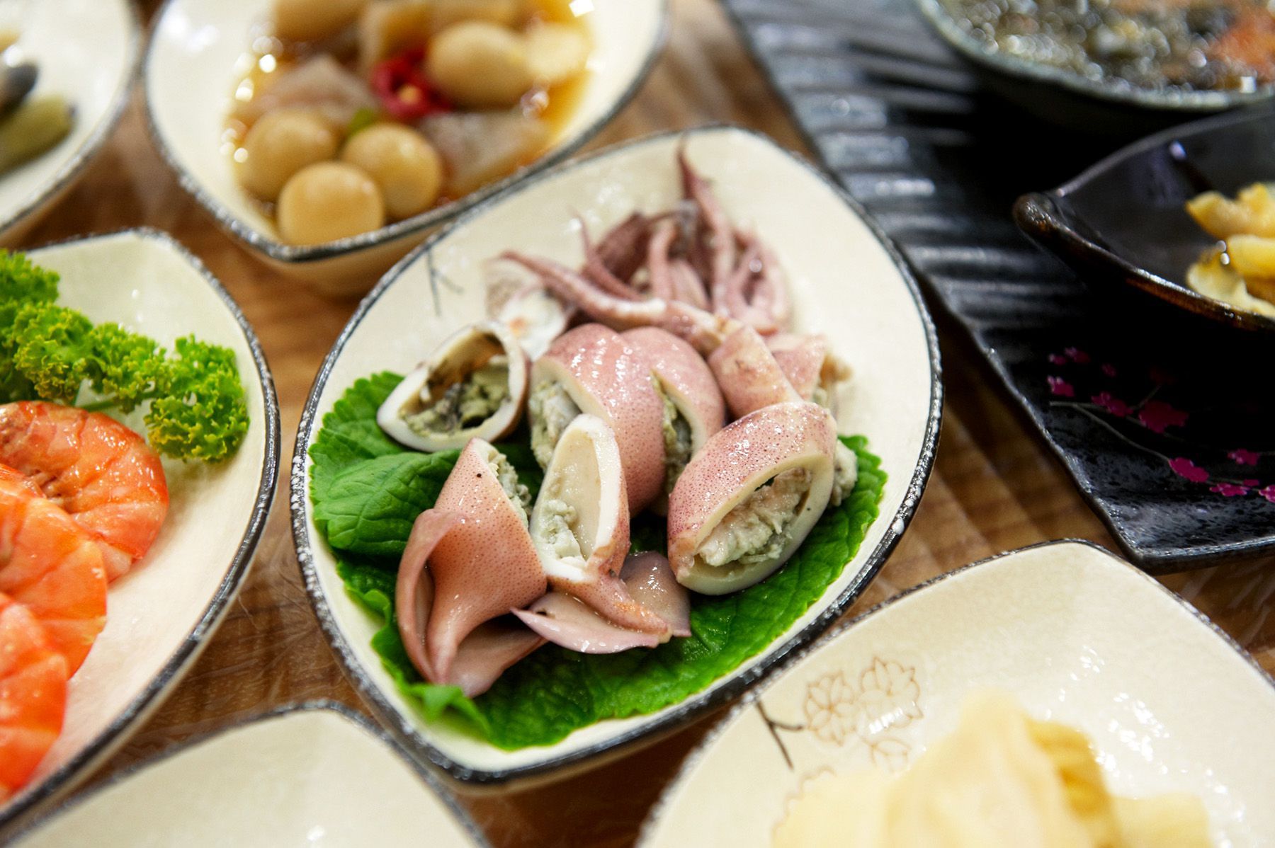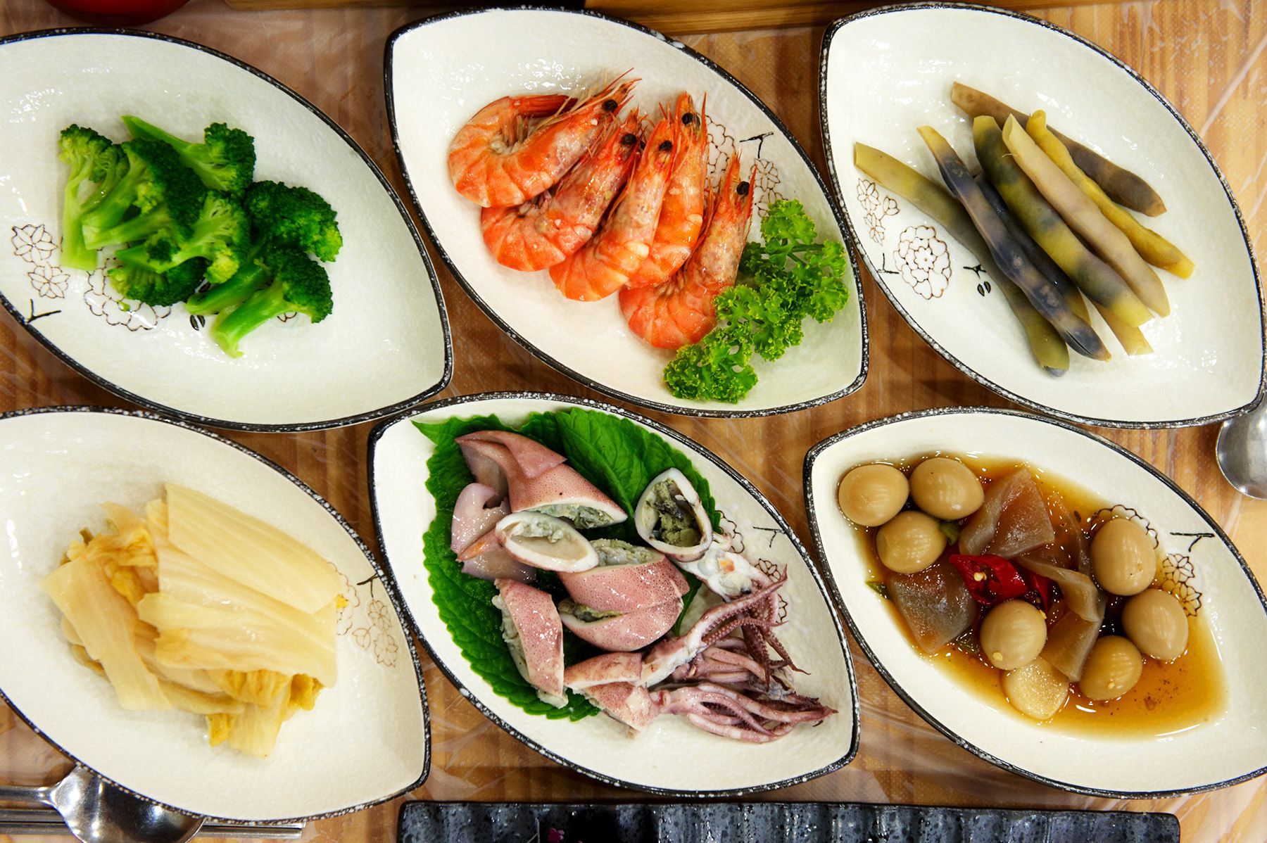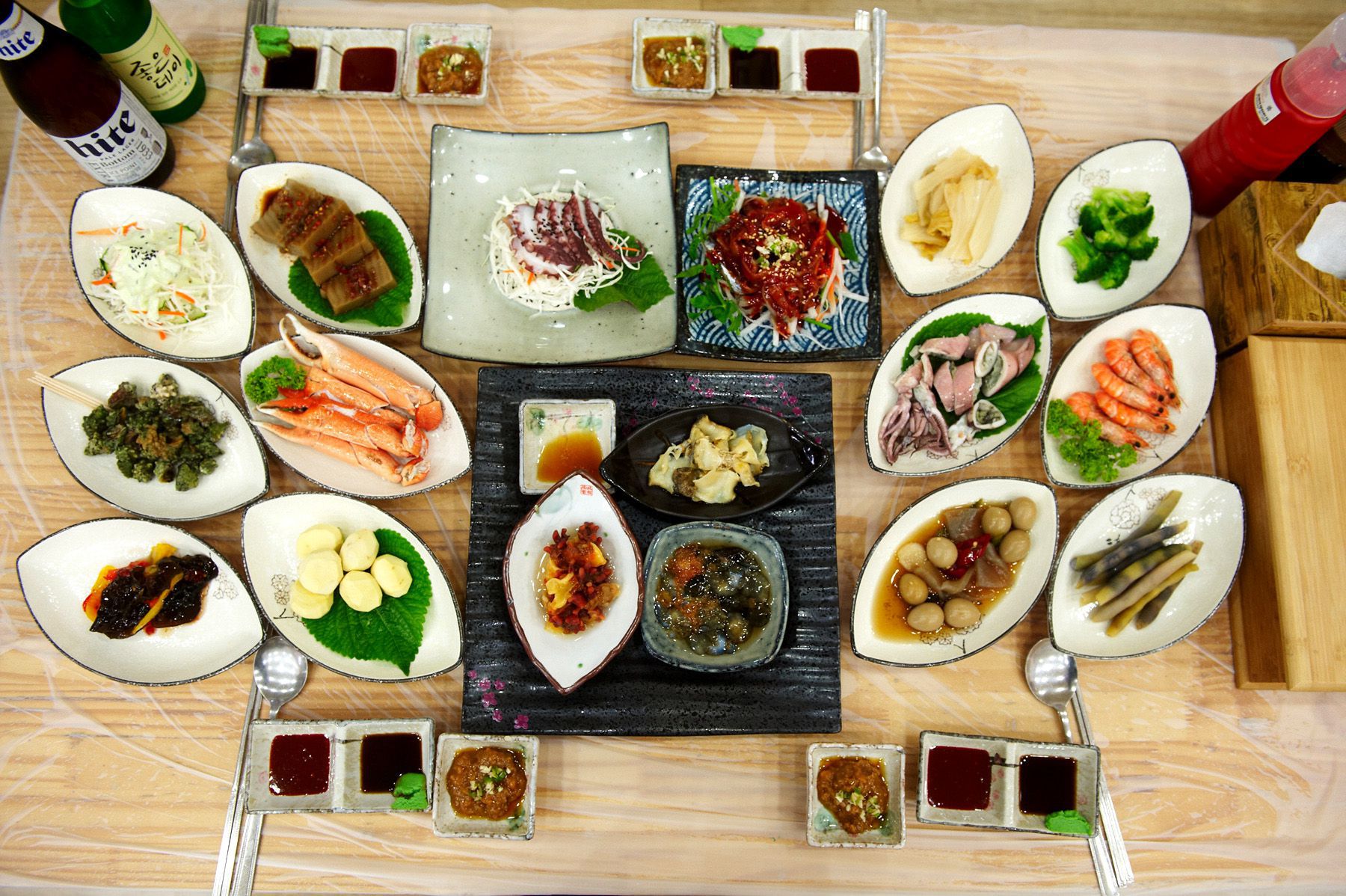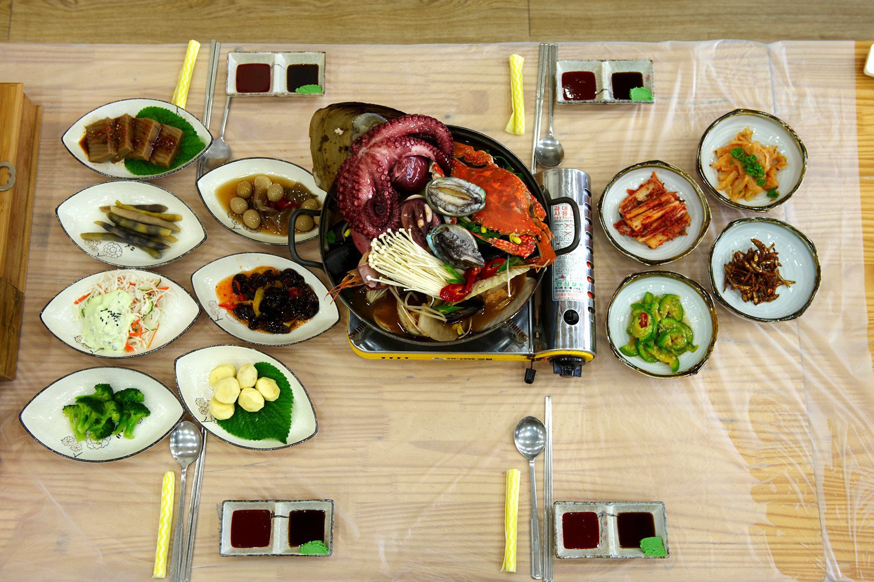 학꽁치,문어,홍합조림,미역,해조류,브로콜리,멸치무침,오징어무침,땅콩을 빻아 넣은 단호박조림,