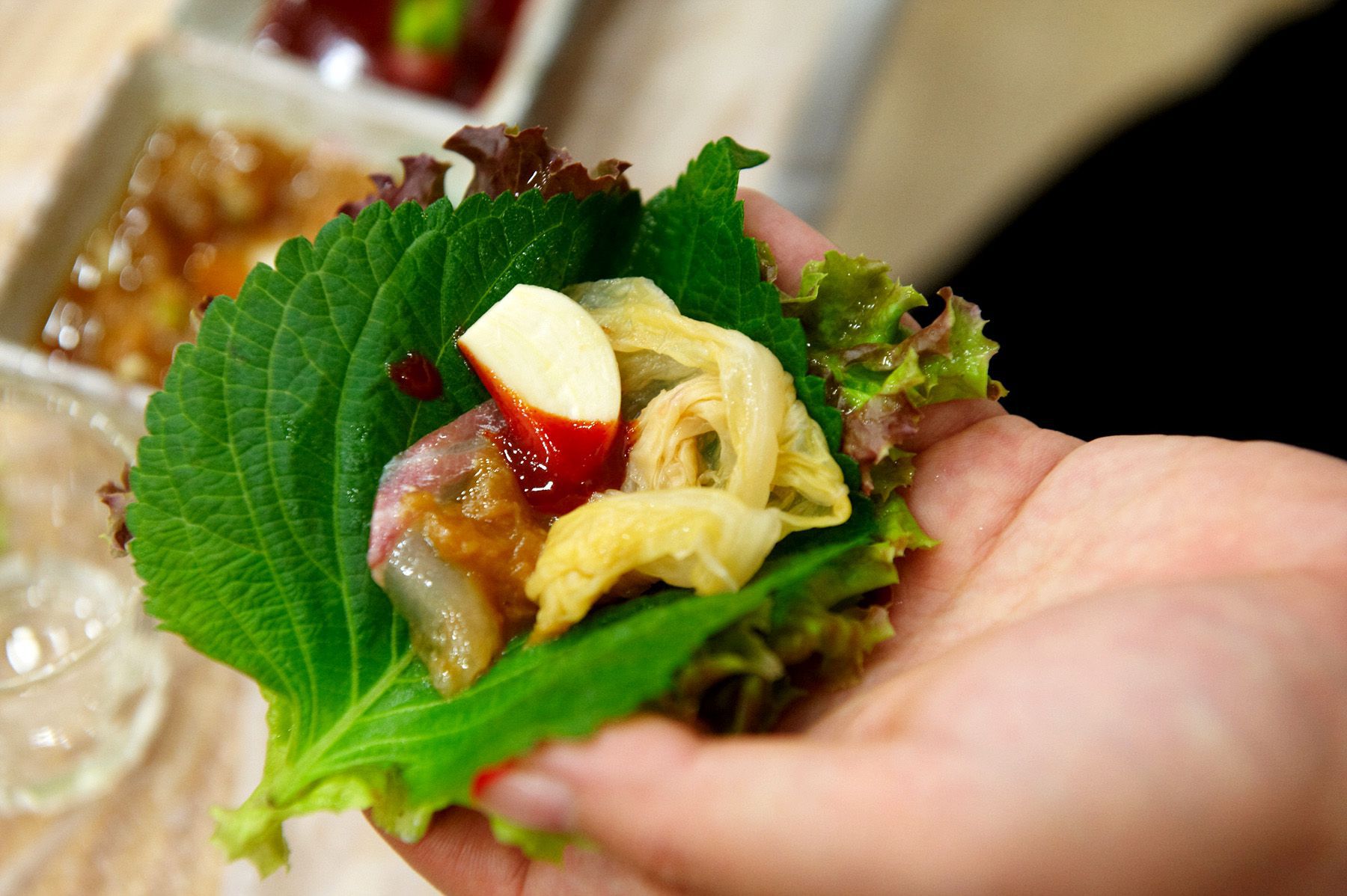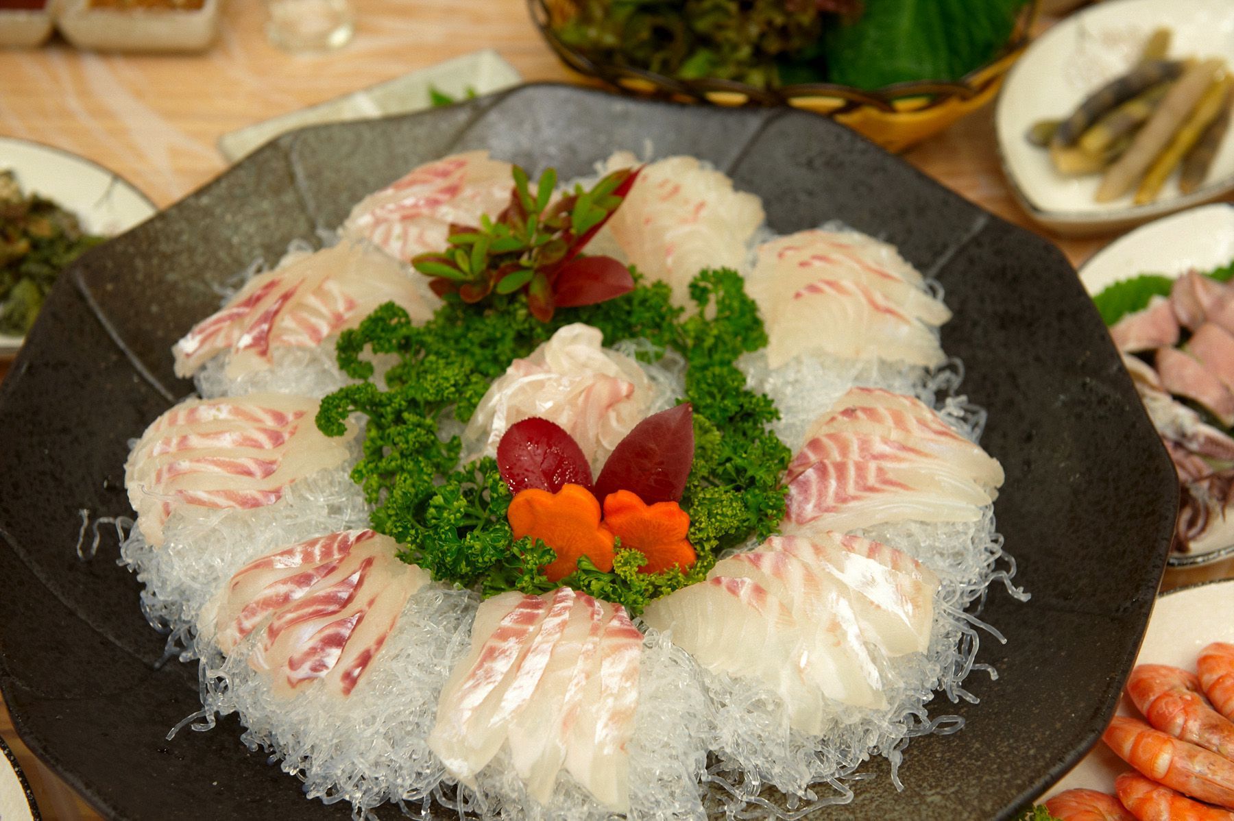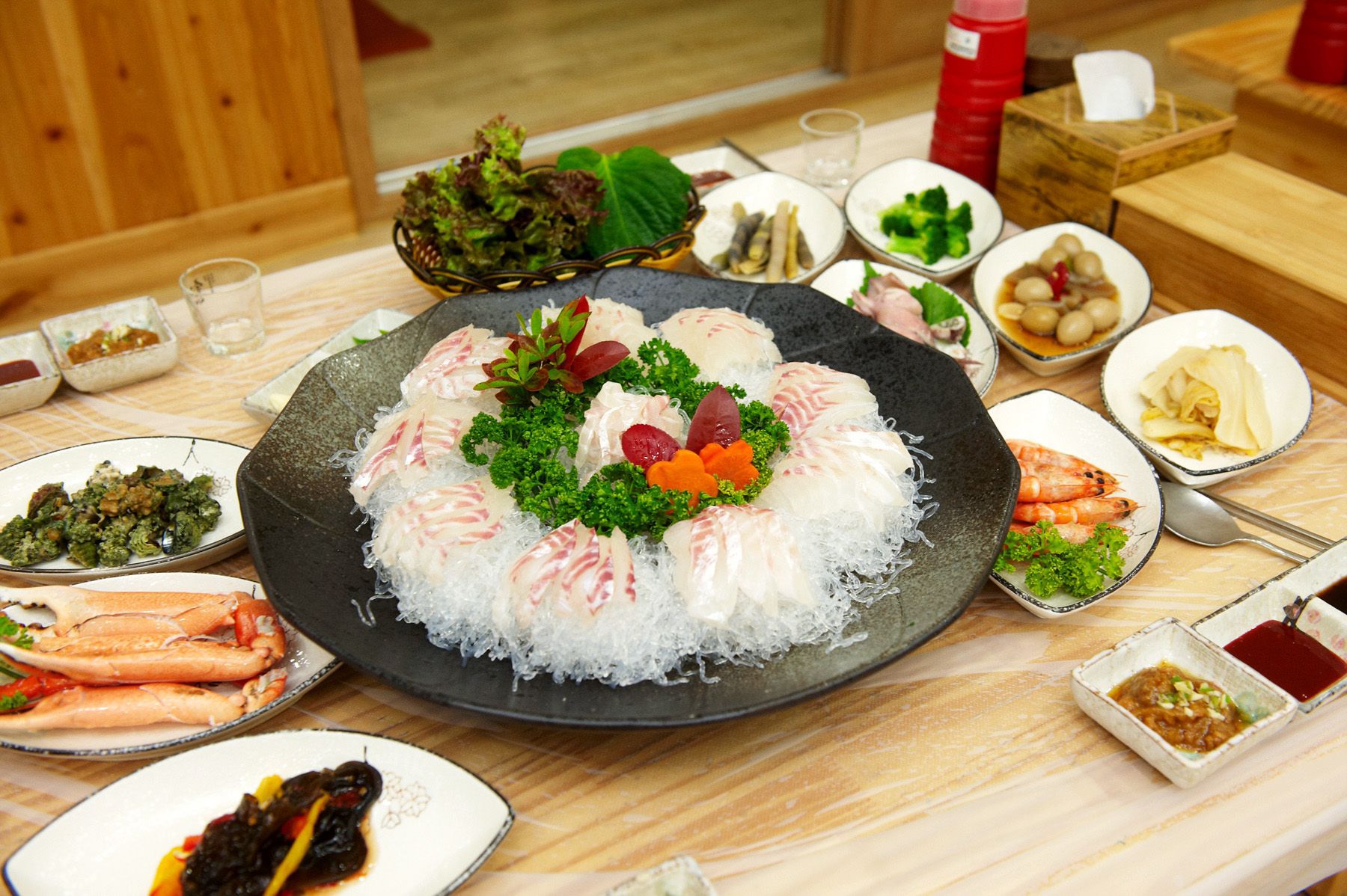 싱싱한 쌈채소에 신선한 회,그리고 묵은지와 함께 싸서 드시면 더욱 맛있고 특별한 맛을 느낄 수 있습니다.^^