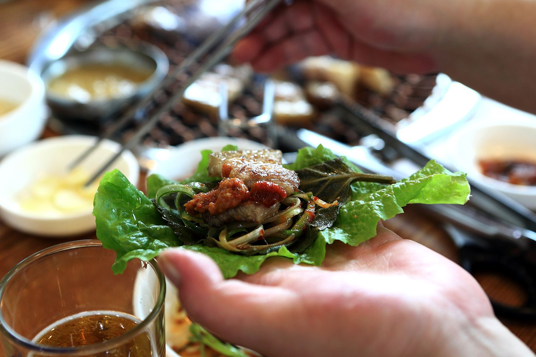 노릇노릇 맛있게 구어진 흑돼지를 싱싱한 상추에 올려 파절임과 함께