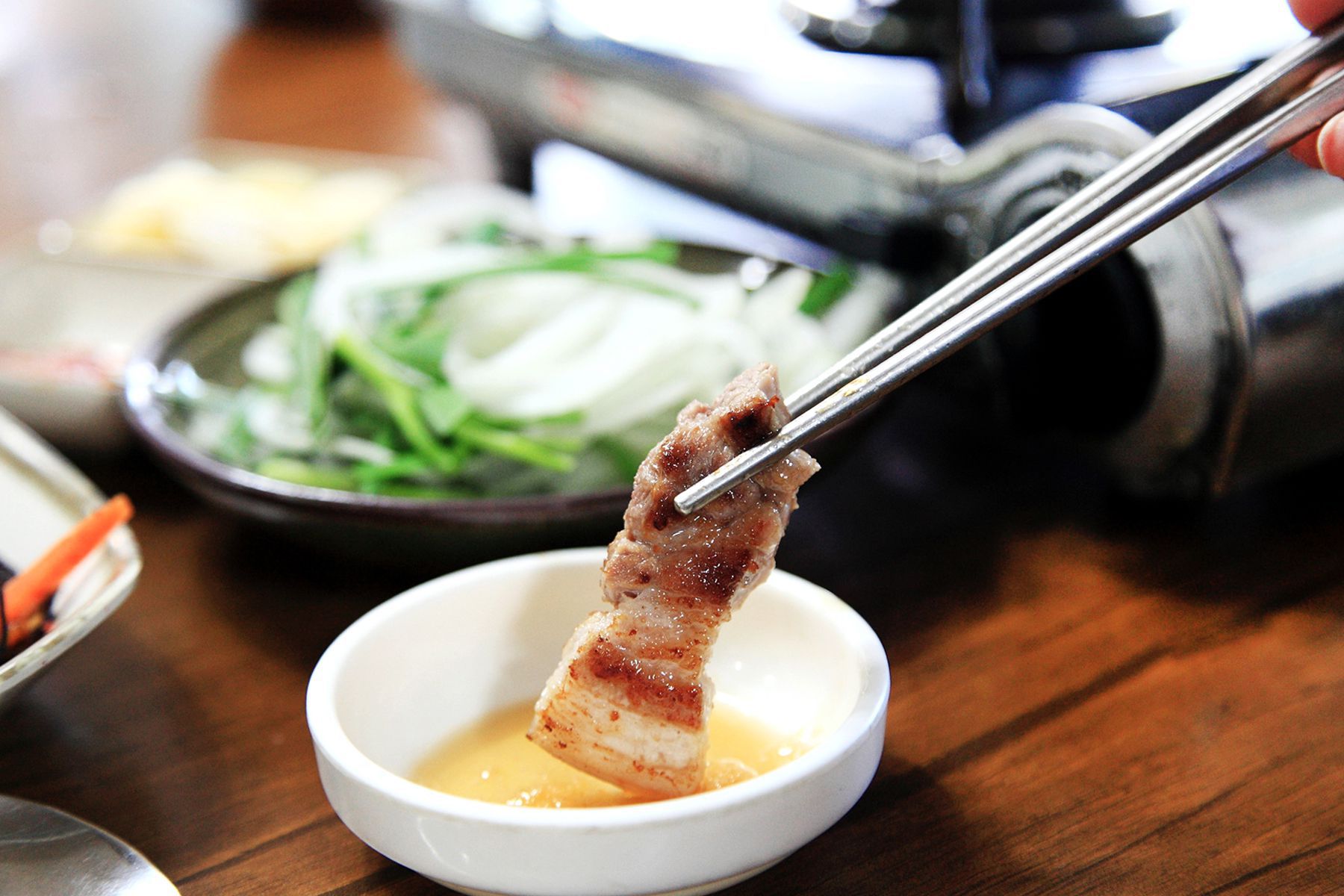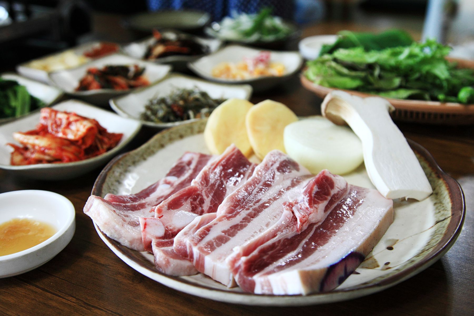 노릇노릇 맛있게 구어진 흑돼지를 싱싱한 상추쌈이나