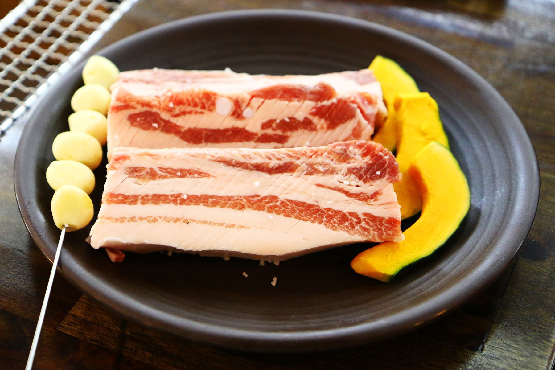 빛깔부터 남다른 삼겹살에 잔칼집이 들어가서 보다 부드러우며 빨리 익고 맛이 좋습니다.