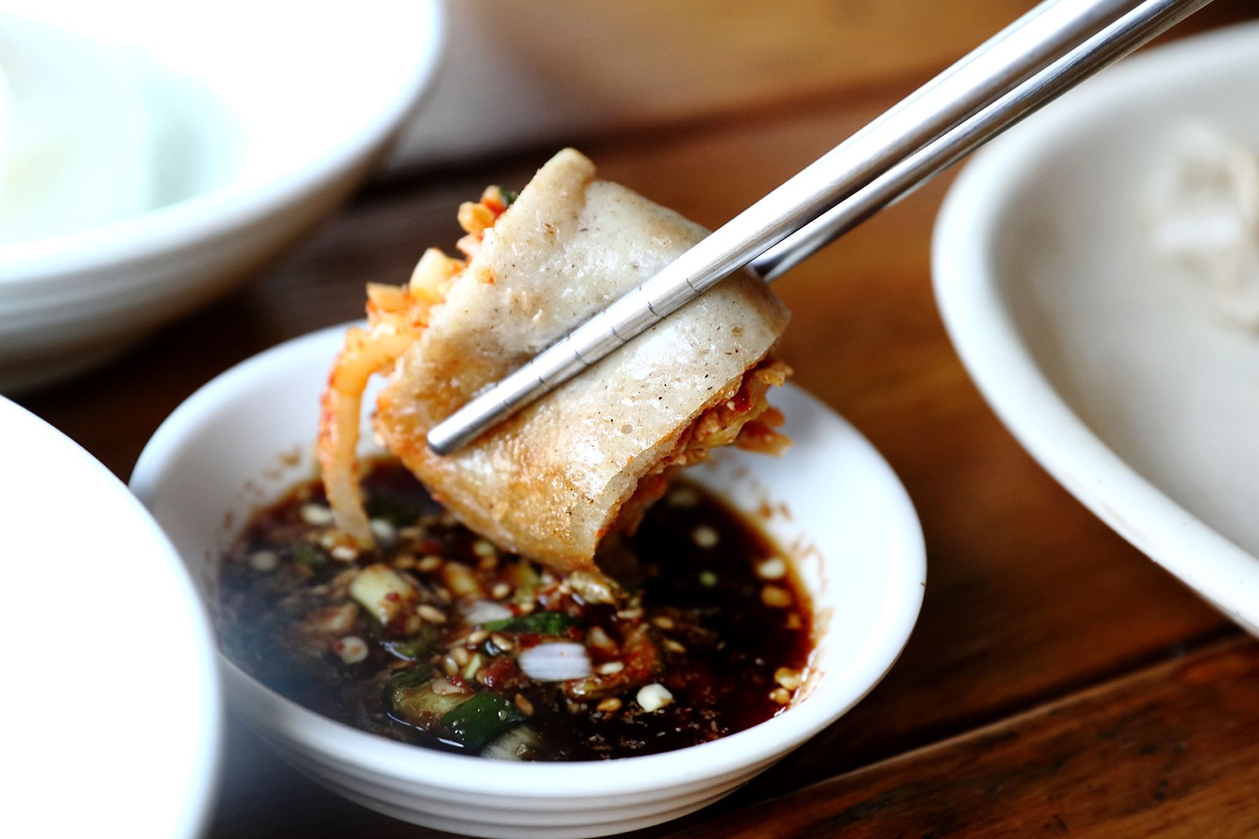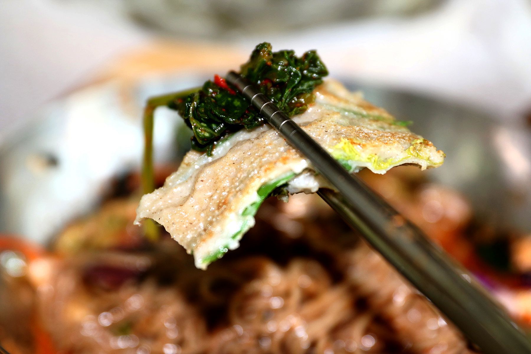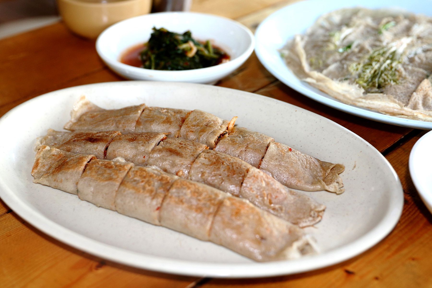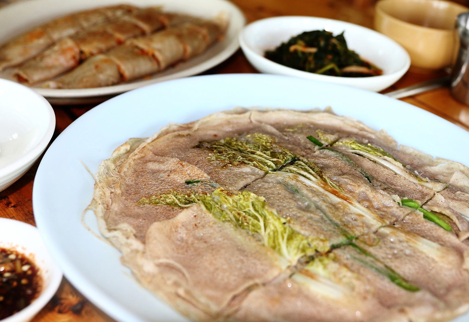 얇은 메밀전에 아삭하고 매콤한 김치를 넣어 만든 전병은 입안에 쏙쏙 넣을 수 있도록