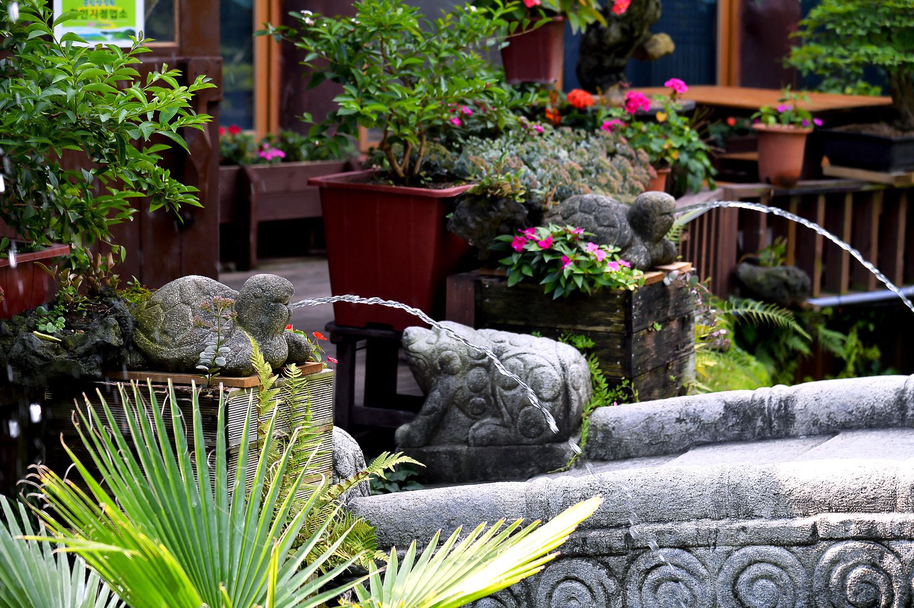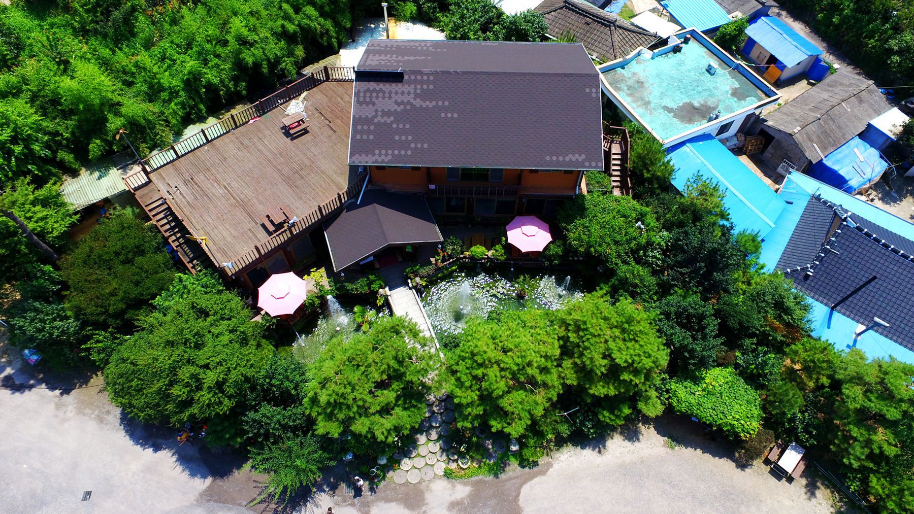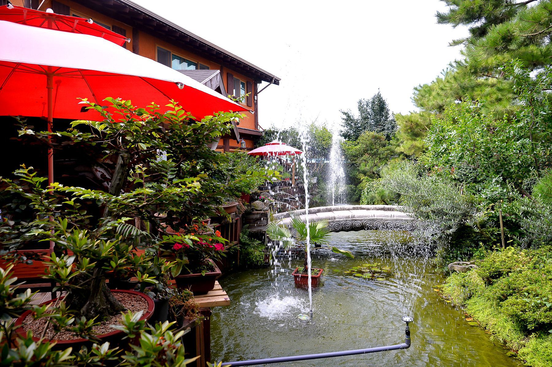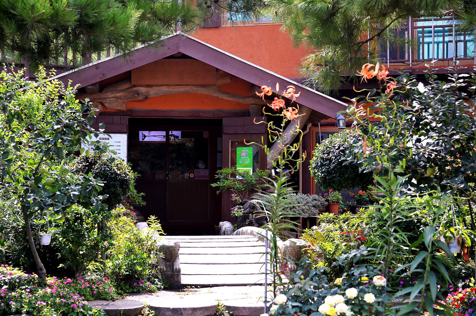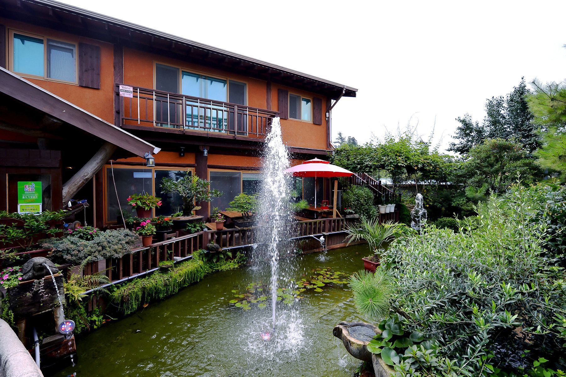 식사공간을위한 건물이 꽃과나무 그리고 연못과 어우러진 멋진풍경이 감탄을 자아냅니다.