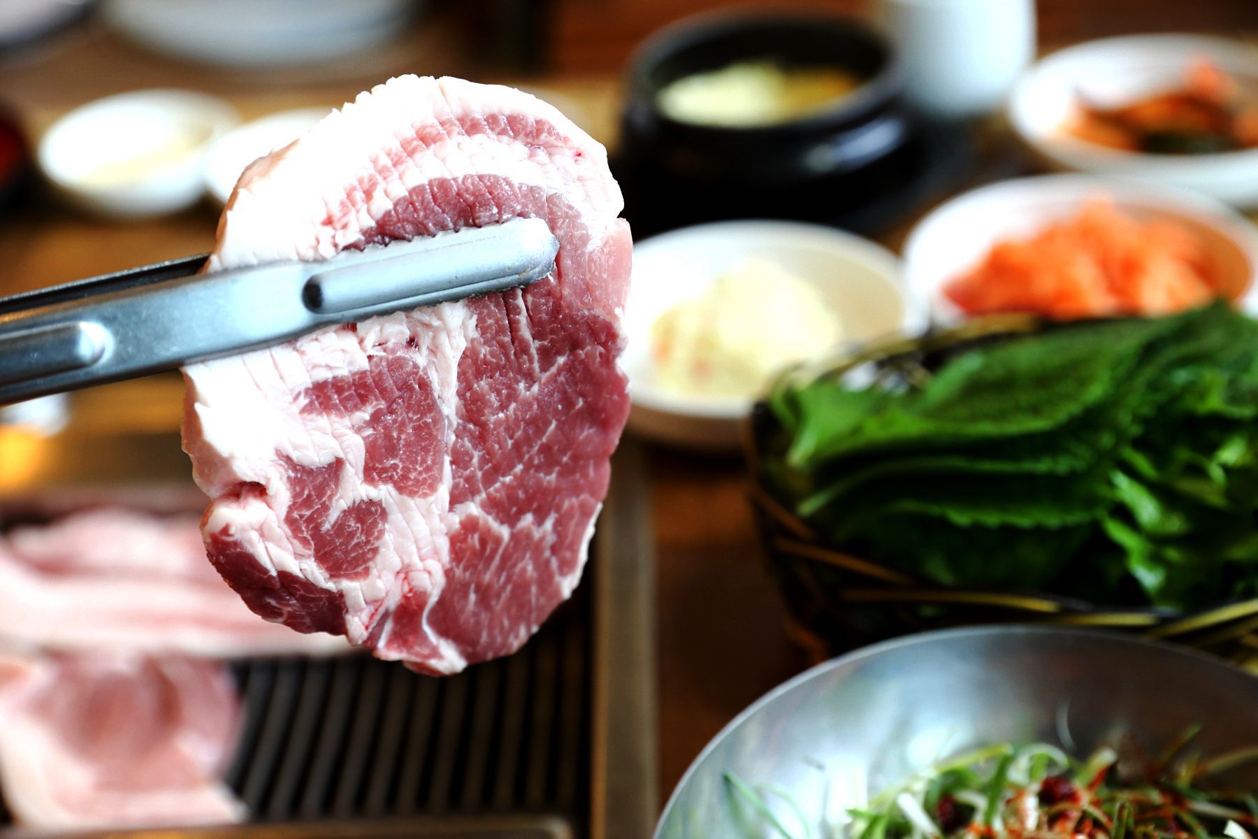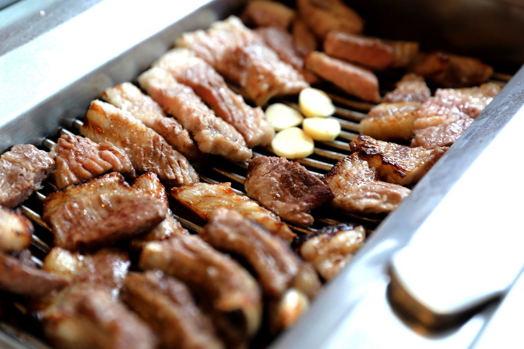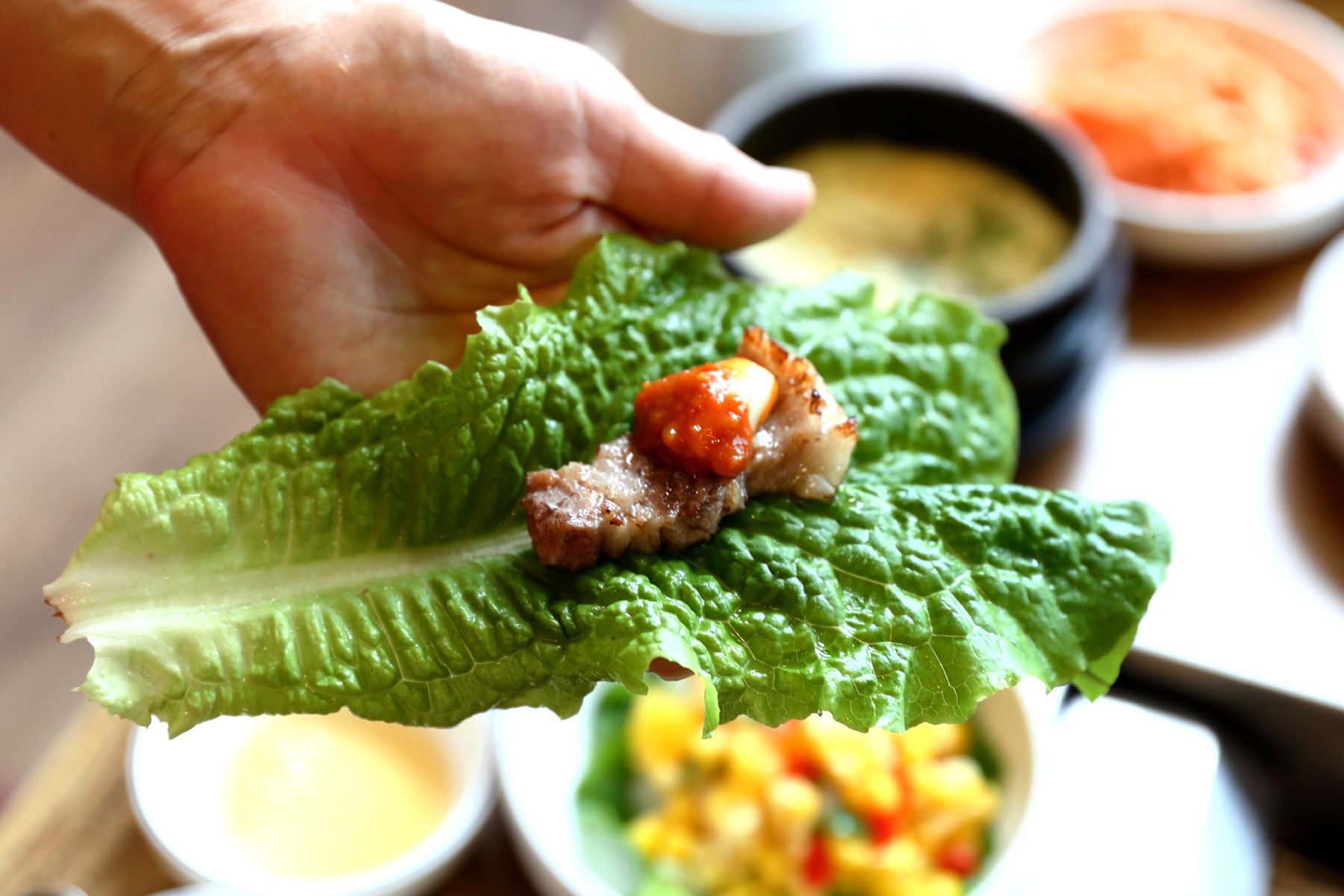 불판에 바~싹 구운 돼지고기를 쌈채소와 파절임,마늘,고추를 곁들여 입안 가득 넣으면