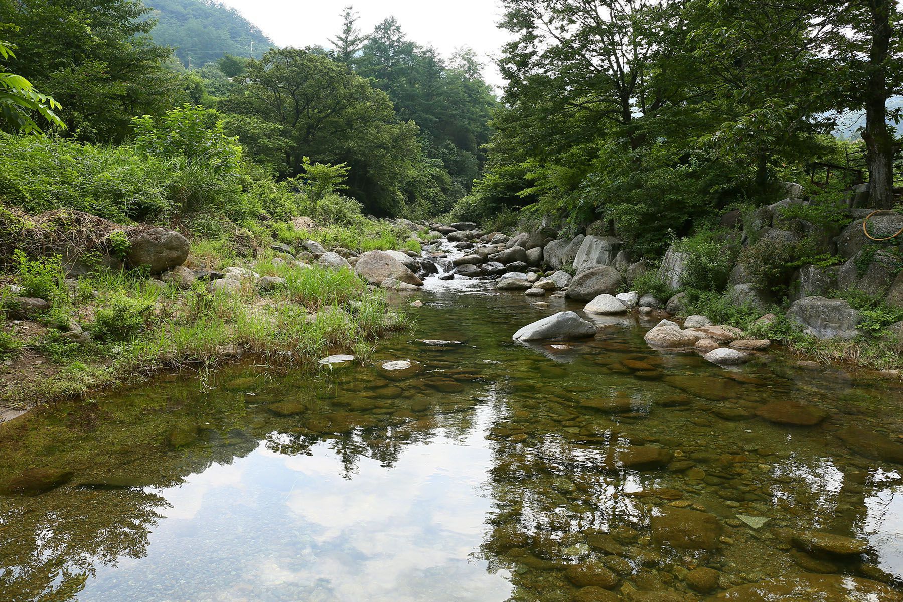 깨끗하고 깊지않아 물놀이를 즐기기에도 좋은 계곡이 바로 앞에 있습니다.