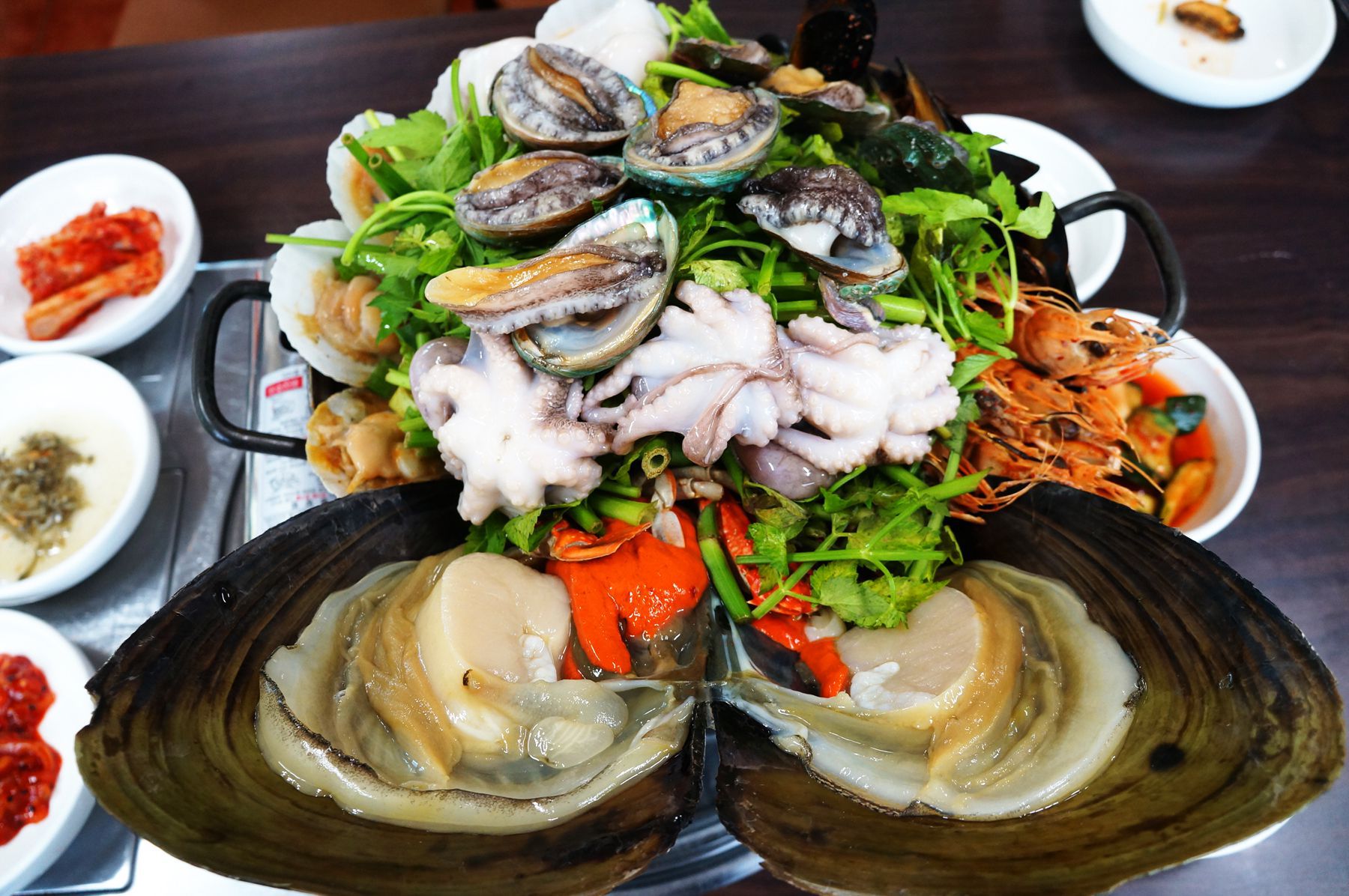 푸짐한 해물을 수북하게 쌓아서 나오는 '해물탕' 입니다.