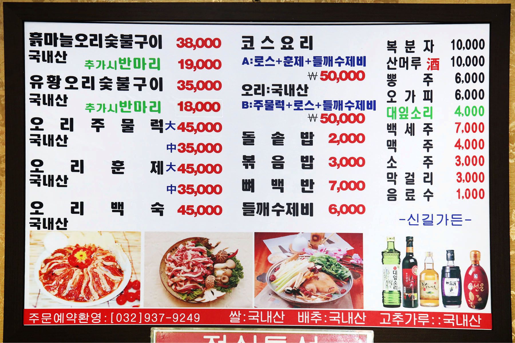 훈제오리,양념오리,오리구이,칼국수 등오리고기에 특화된 메뉴로 판매하고 있으며
