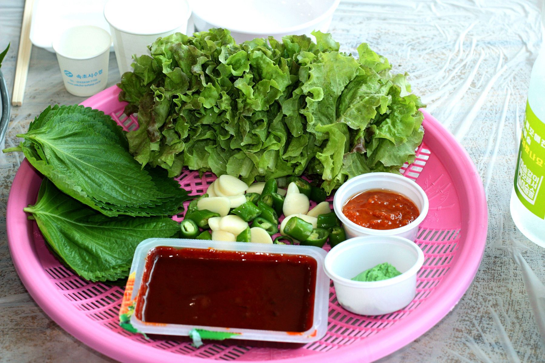 차려진 신선한 야채에 맛있게 썰어진 회한점 올려 쌈 싸먹는 맛은 어느맛 과도 비교할수 없는 맛이며