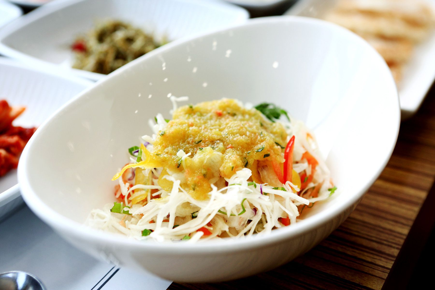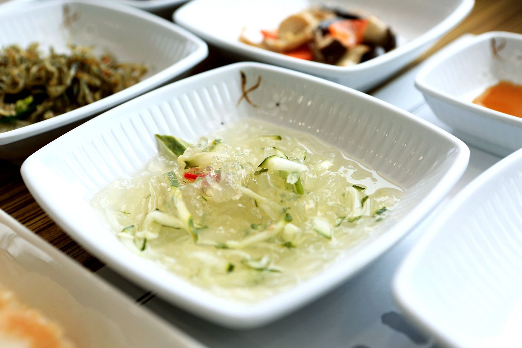 함께 제공되는 톳무침, 상큼한 소스가 매력적인 샐러드, 시원한 미역냉국등 의 밑반찬은