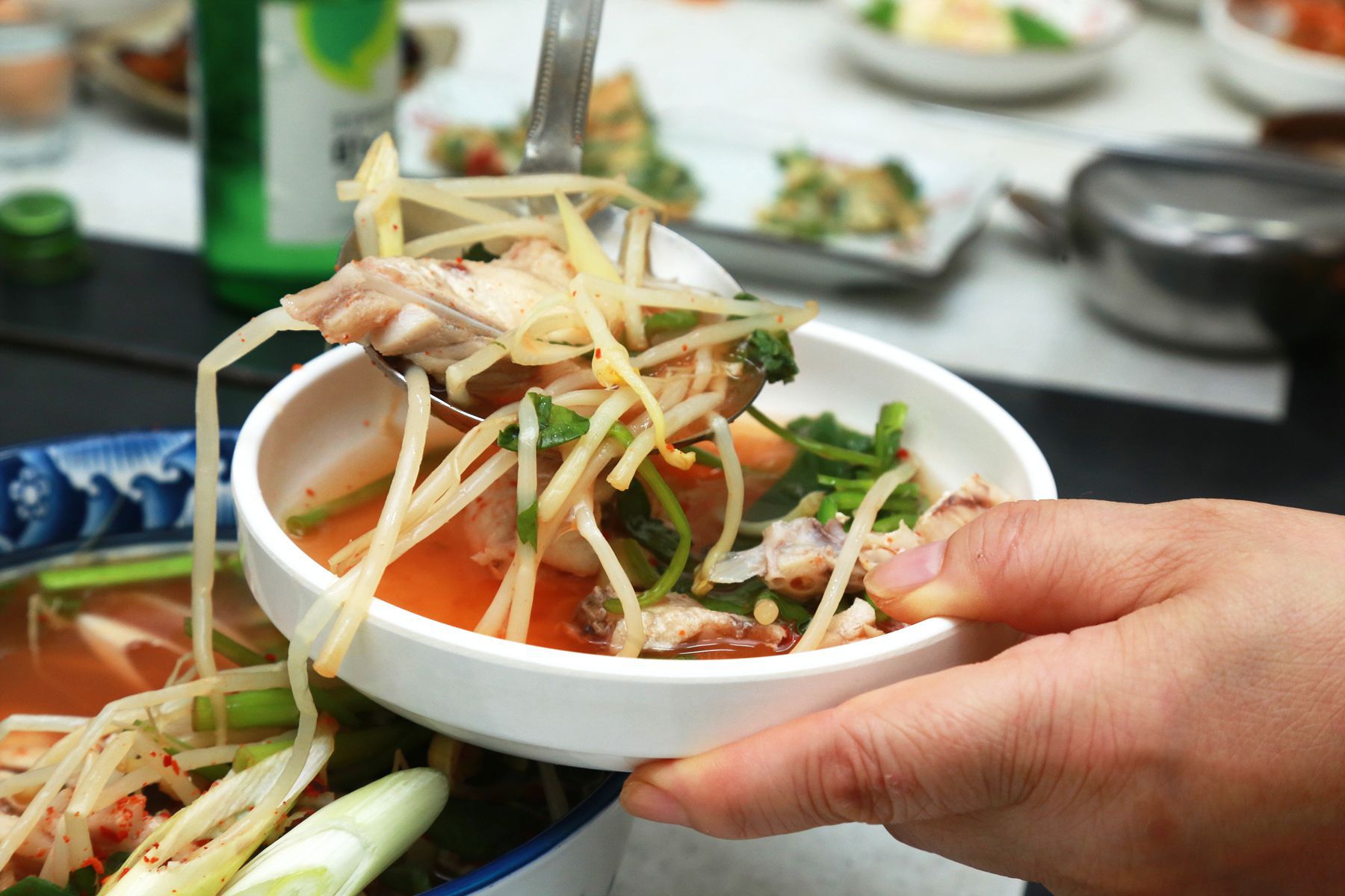 아삭하게 씹히는 콩나물과 미나리가 복어와 환상의 궁합을 자랑하고 있습니다.