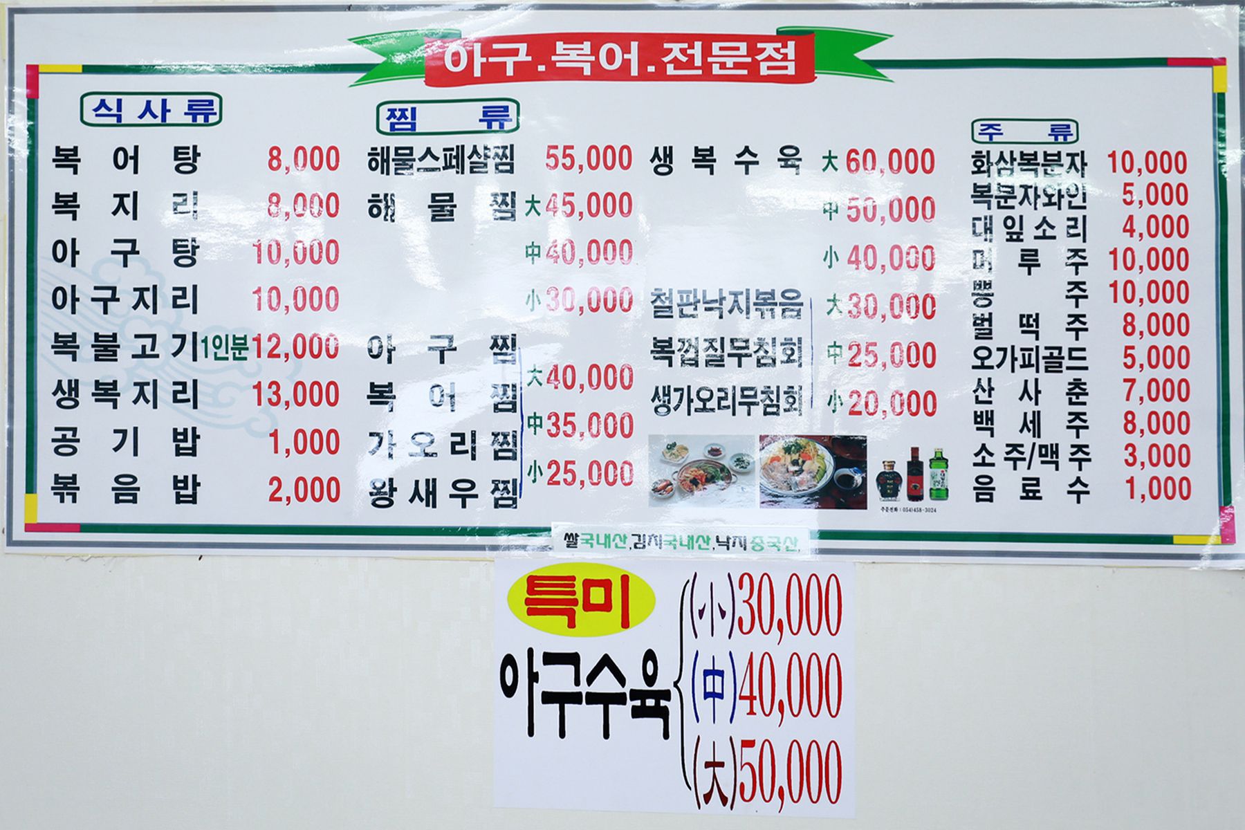 아구와 복어요리를 전문으로 하는 만큼 다양한 종류의 메뉴를 준비하고 있는 이곳은 기본찬들 또한 놓칠 수 없습니다.