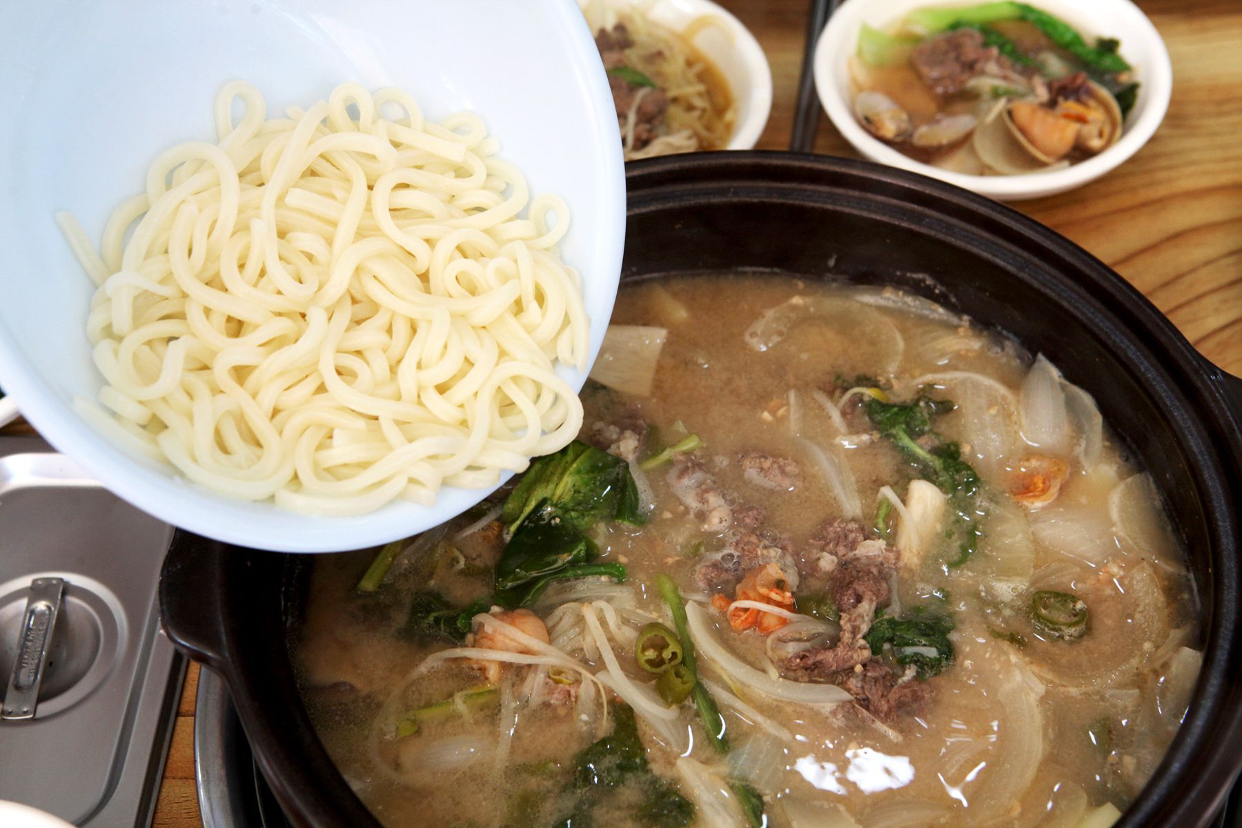 고기와 야채를 다 드시고 난 후,남은 육수에 우동을 넣어 다시한번 그 맛에 풍덩 빠져보시길 바랍니다^^!