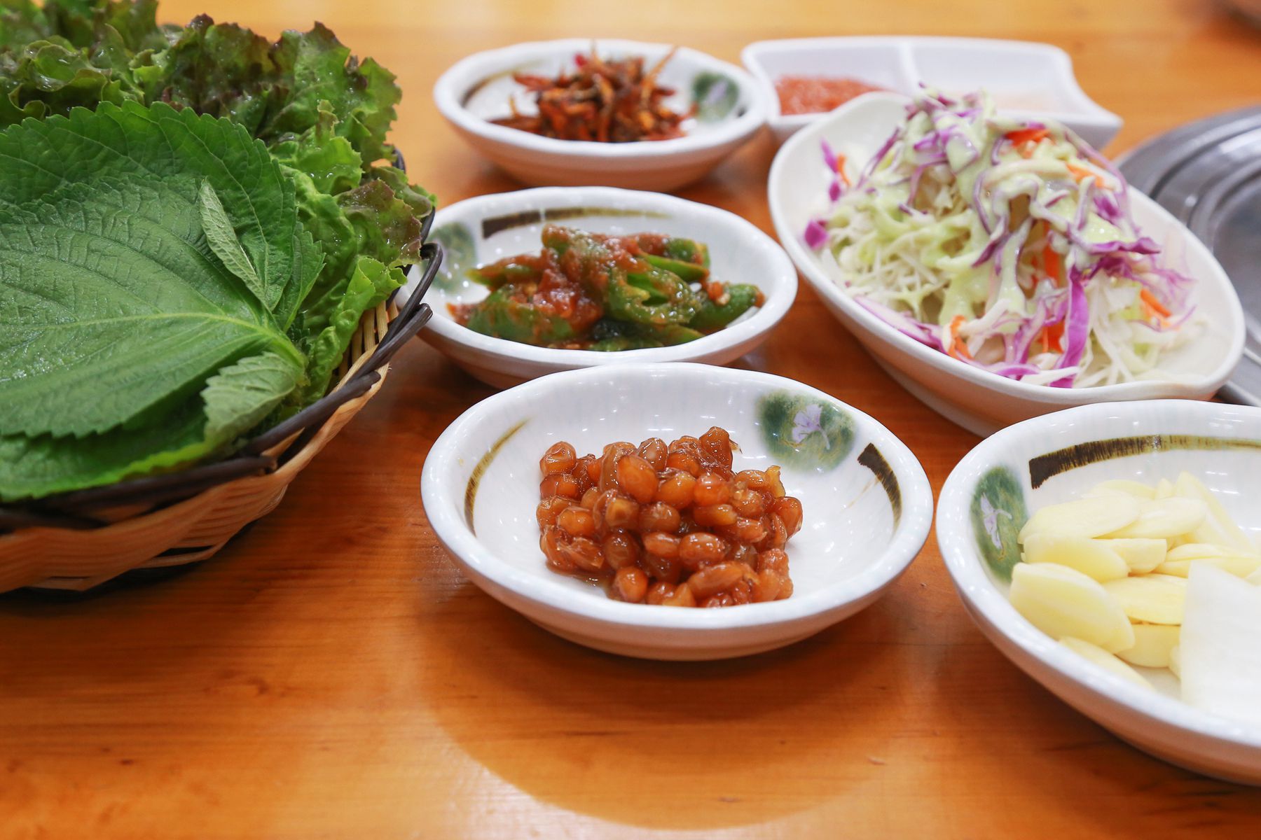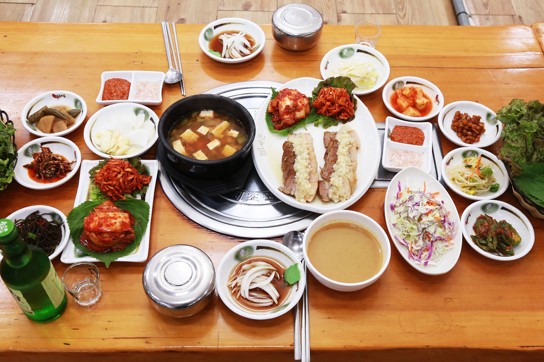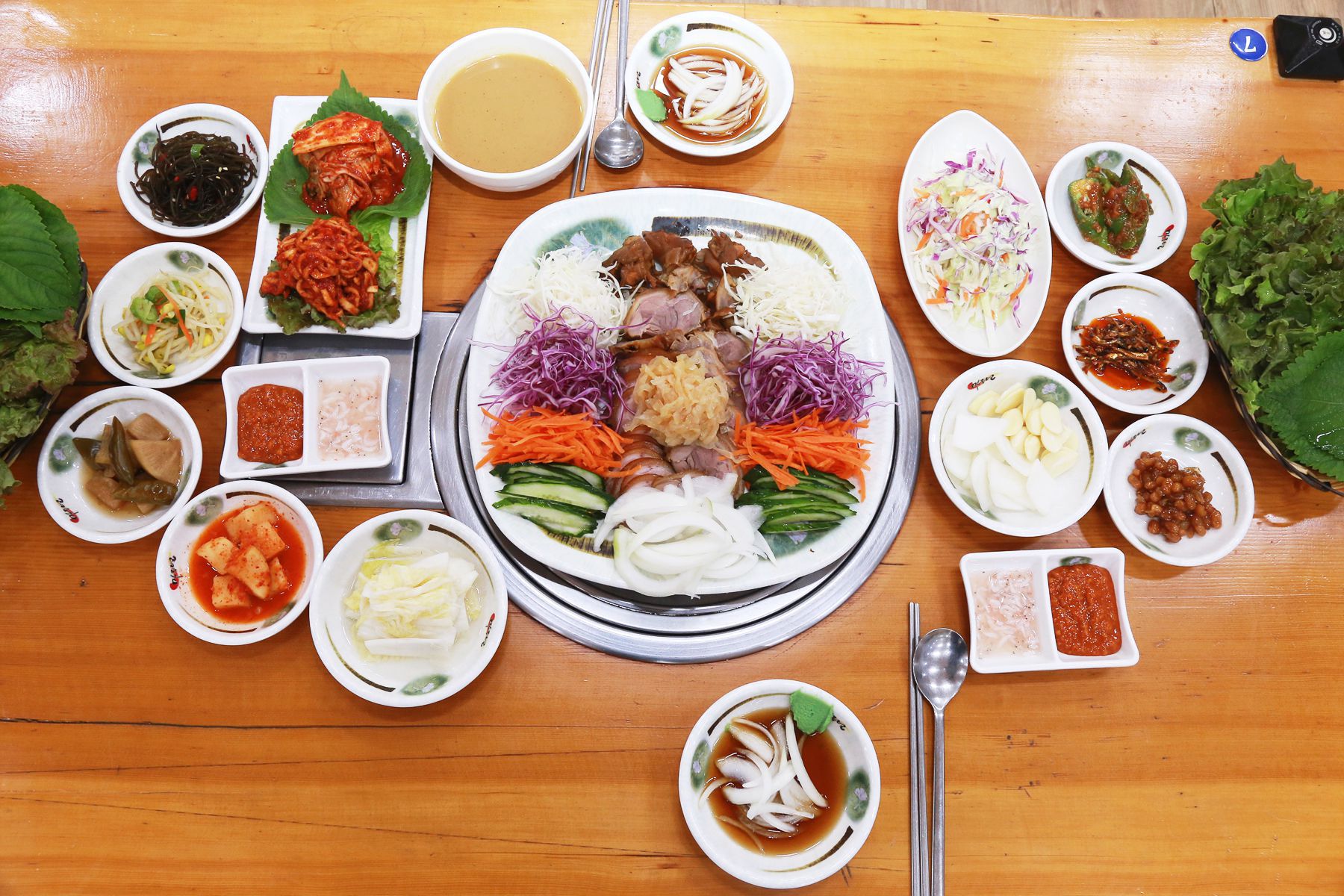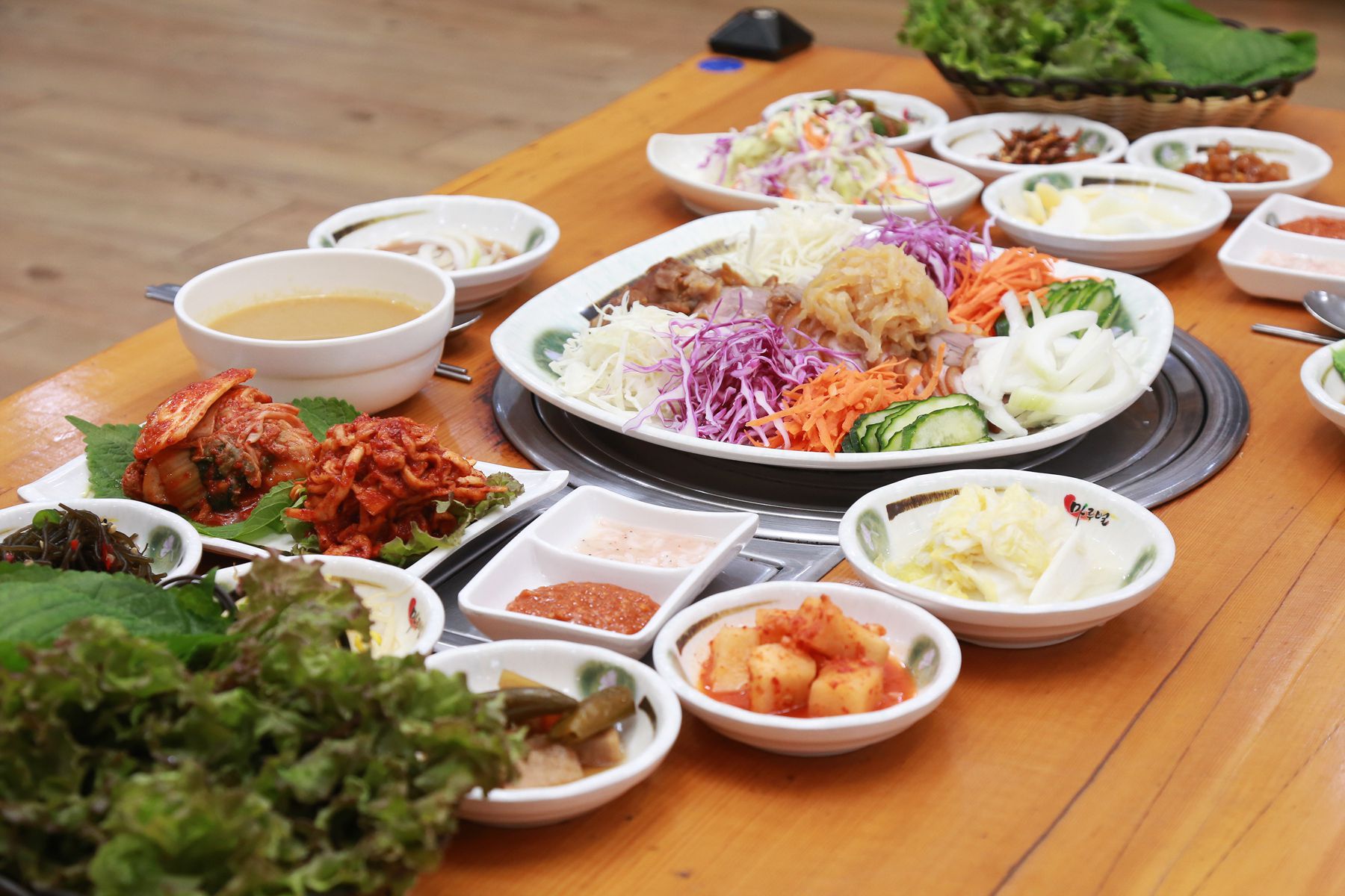 마늘보쌈에 된장찌개에 밥까지 제공되어 푸짐한 상차림을 받아볼 수 있습니다.