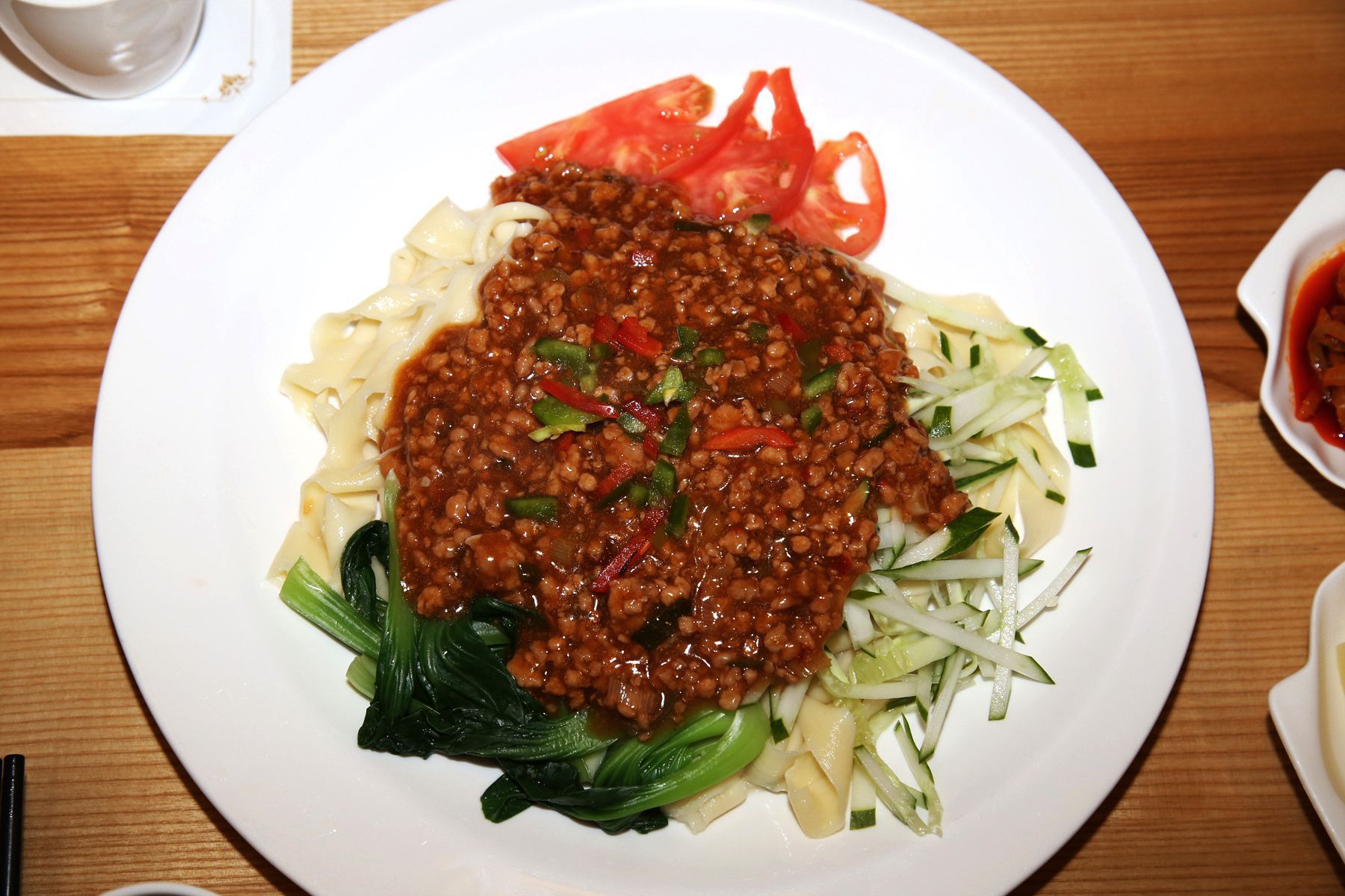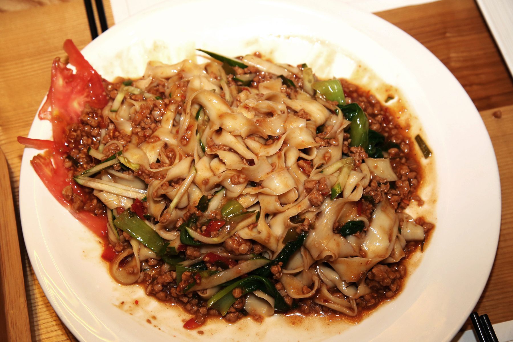 넓적한 수타면에 소고기,토마토,오이등의 야채와 땅콩소스를 넣어 차갑게 비벼먹는 중국식 비빔면 입니다.