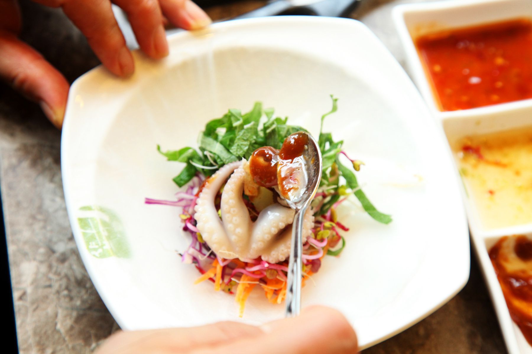 얇은 라이스페이퍼는 뜨거운 물에 담근 뒤 색색깔의 야채와 고기를 골라