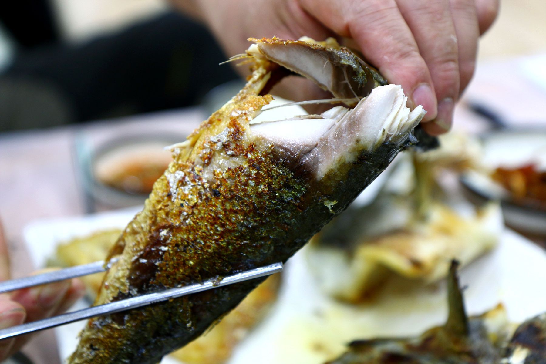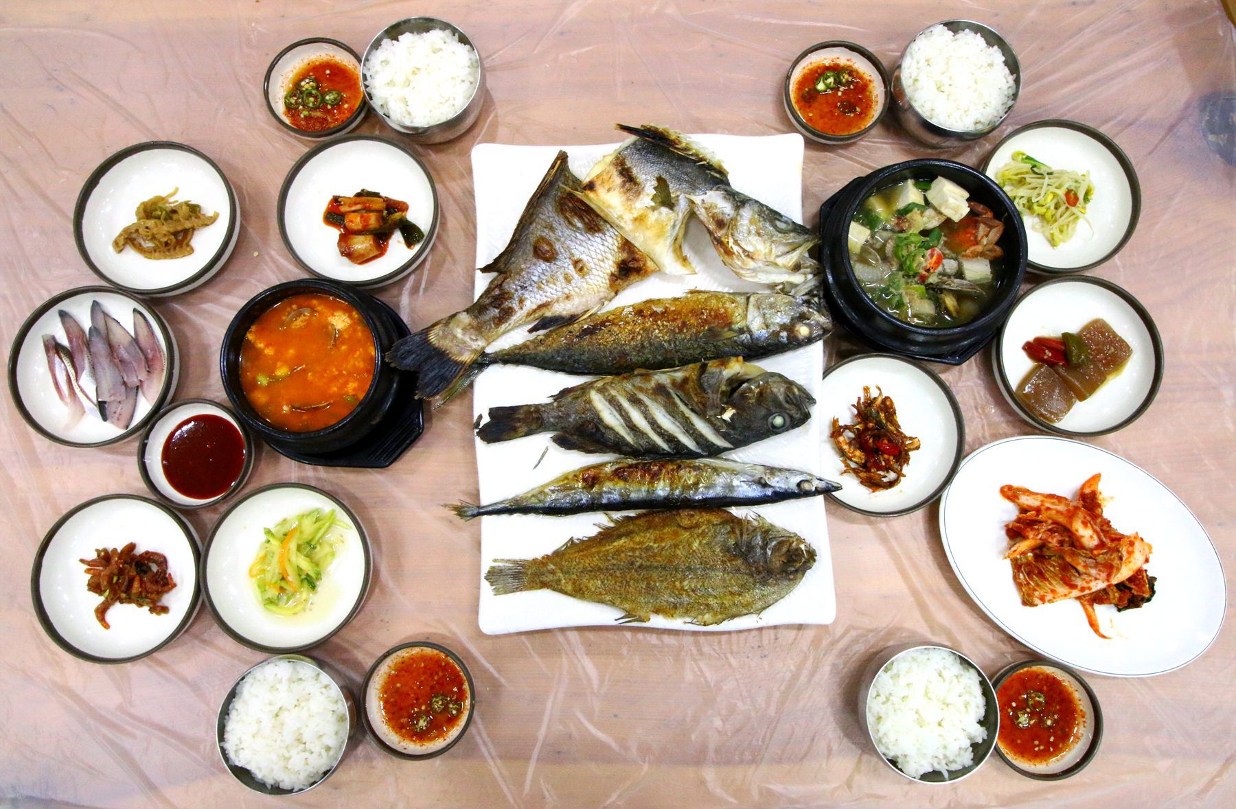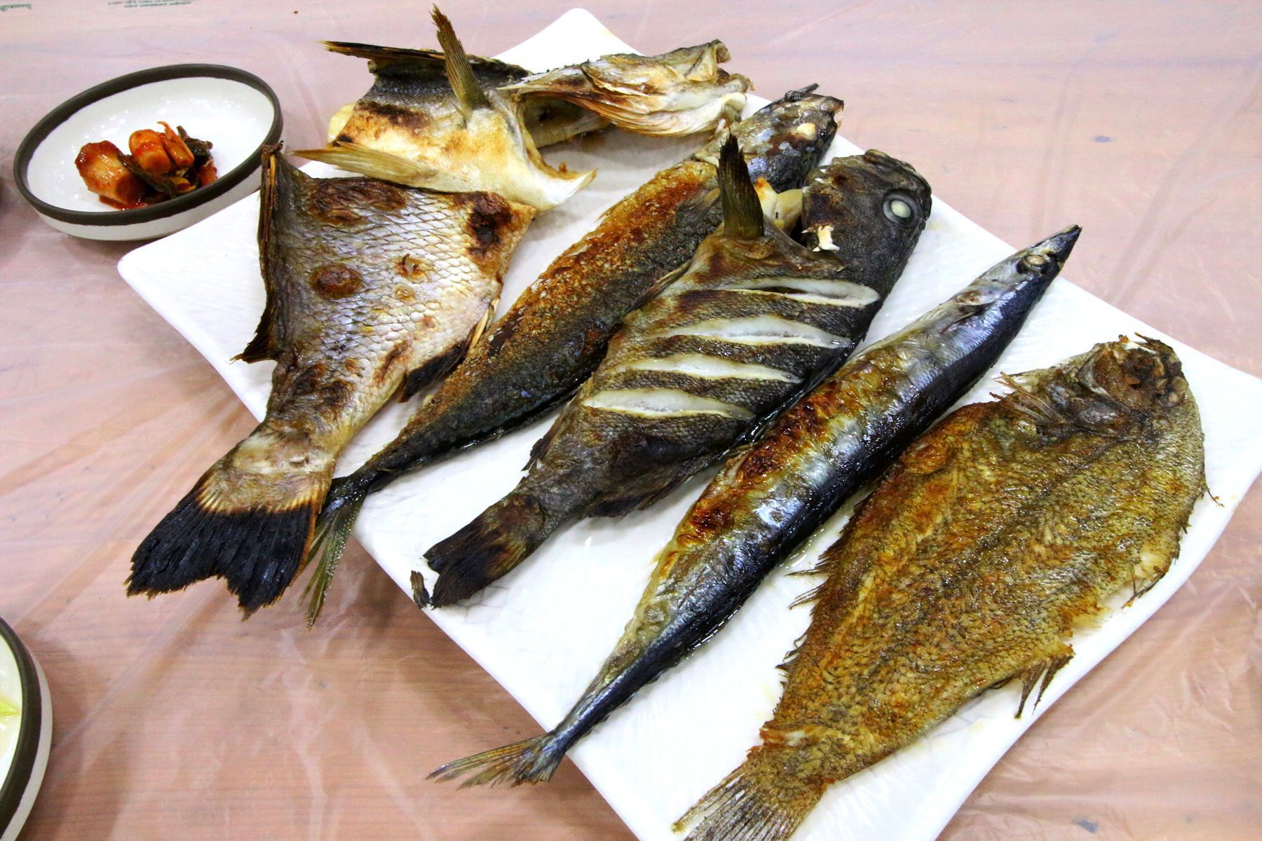 싱싱한 참돔, 농어, 고등어, 우럭, 꽁치, 가자미를 맛있게 구워서 제공하며