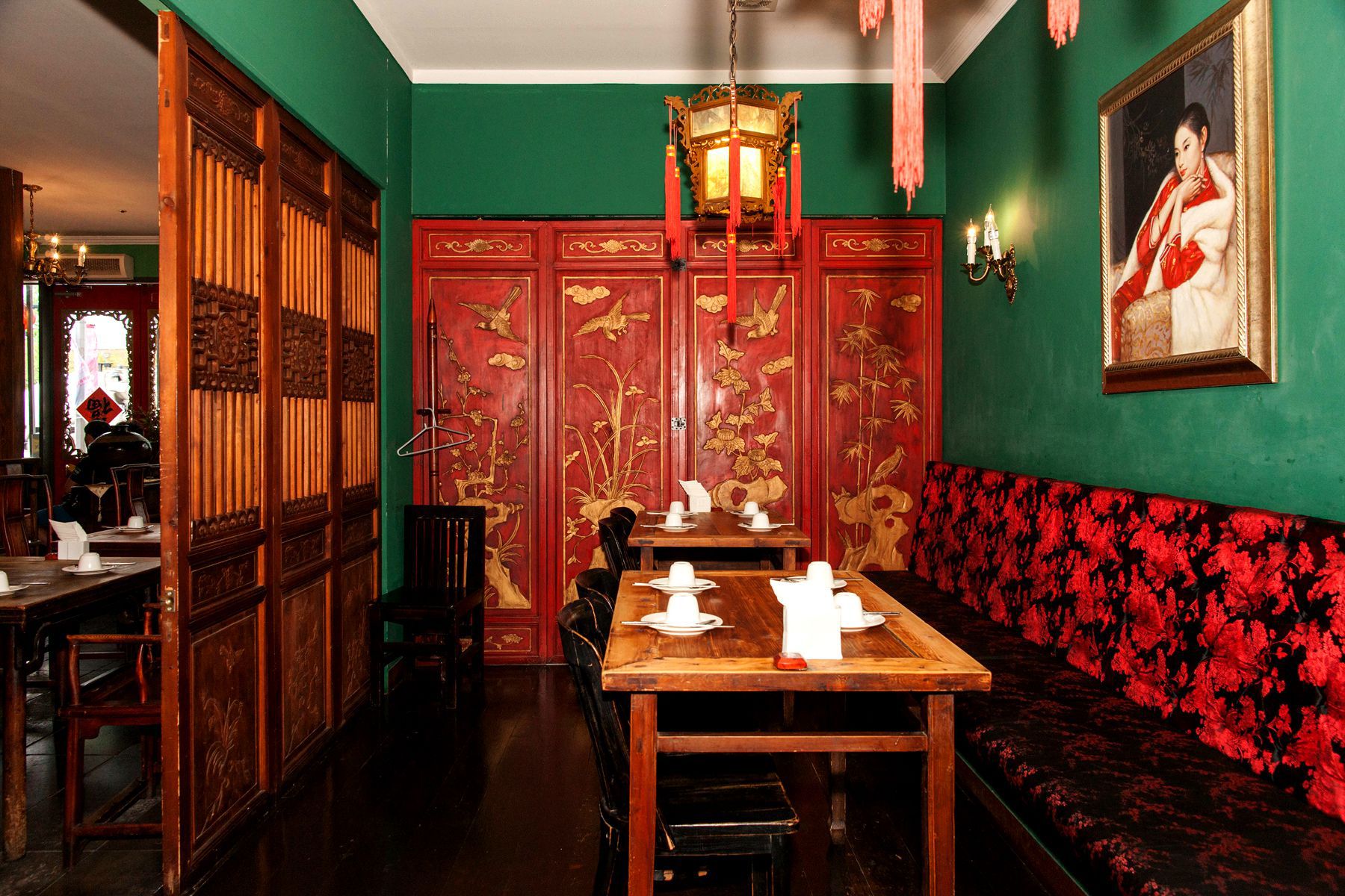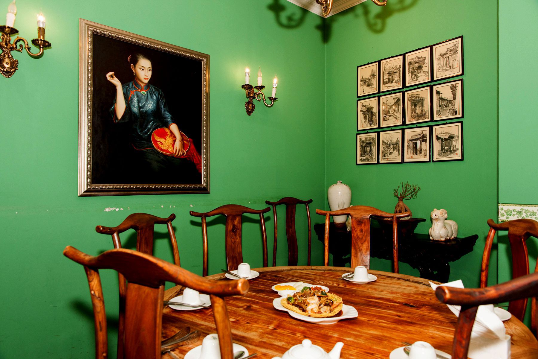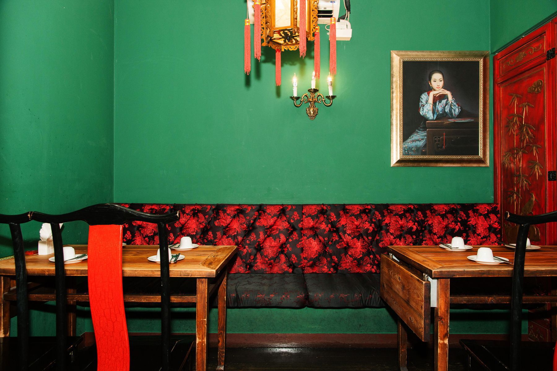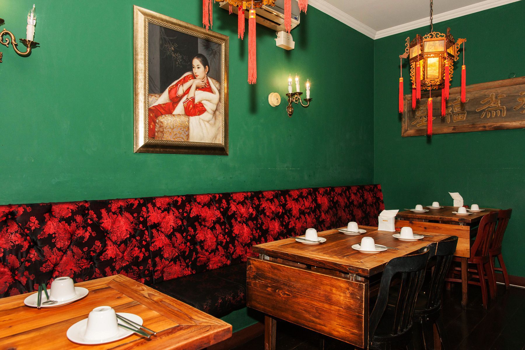 중식당하면 떠오르는 레드와 보색인 그린을 적절히 믹스매치하고 빈티지한 느낌의 식탁과 의자