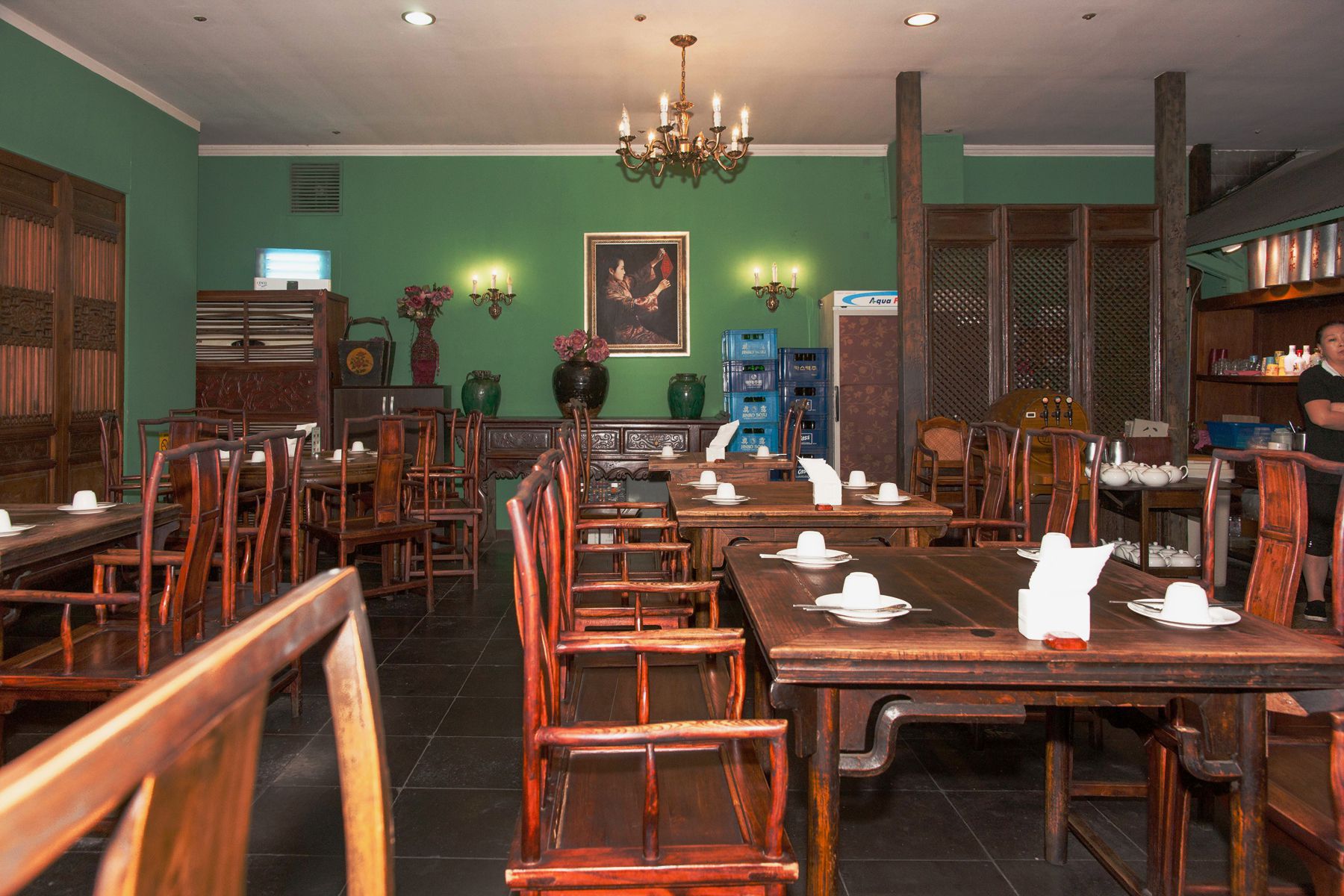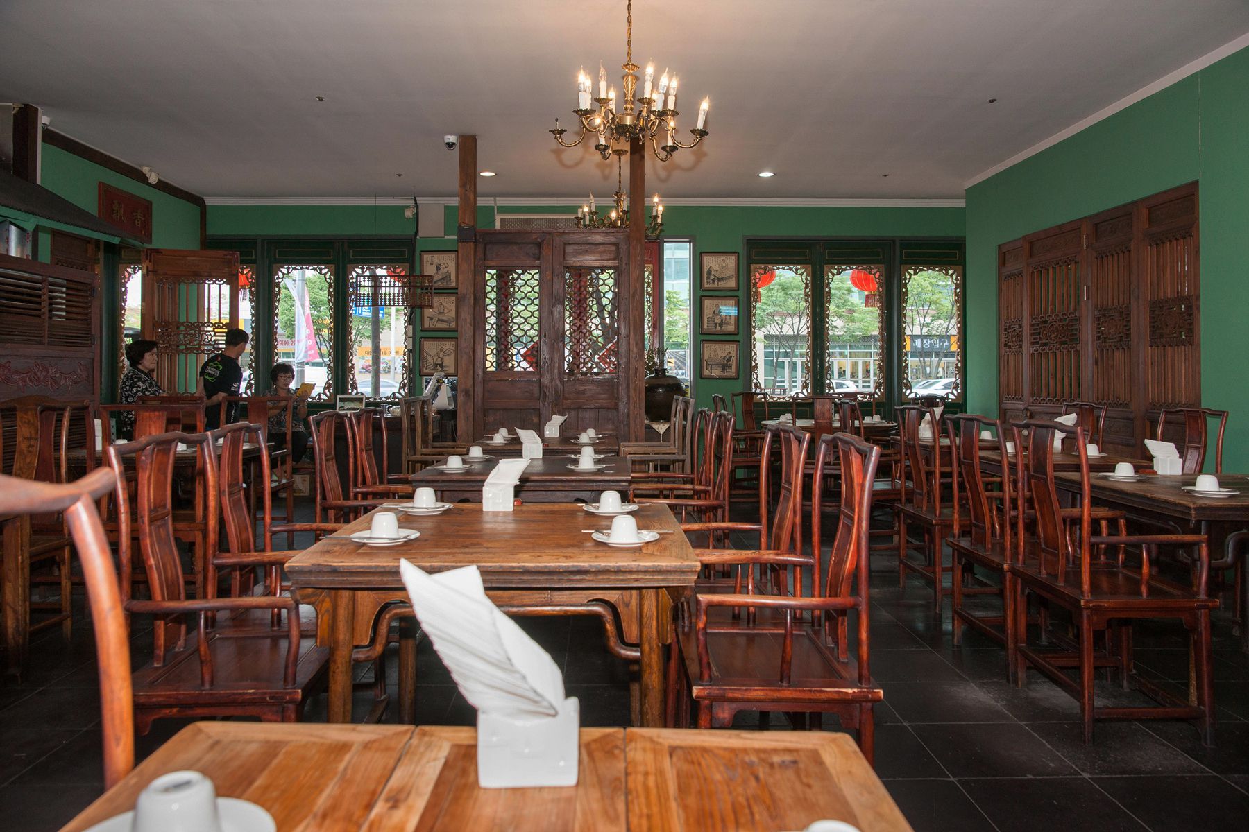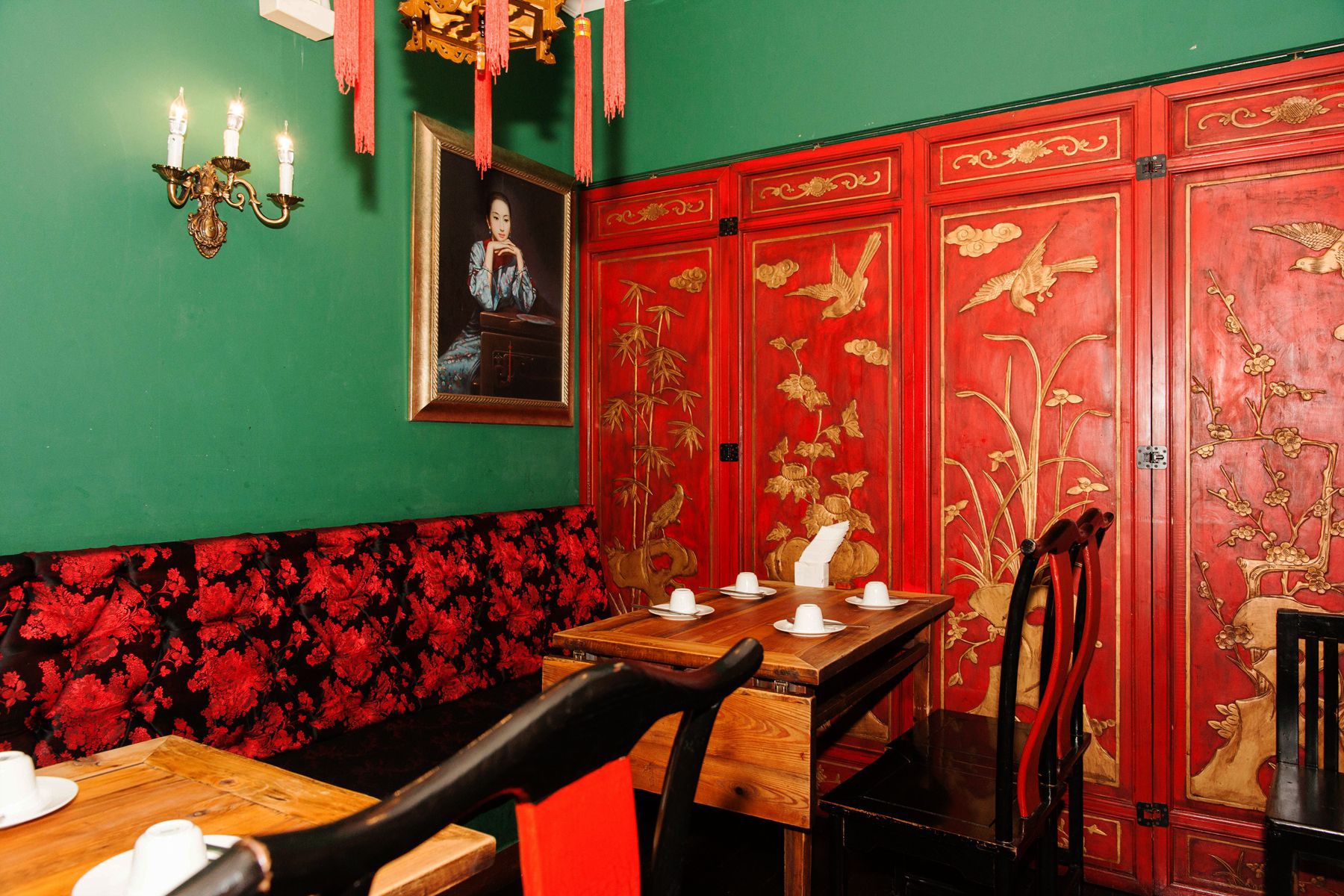 중식당하면 떠오르는 레드와 보색인 그린을 적절히 믹스매치하고 빈티지한 느낌의 식탁과 의자