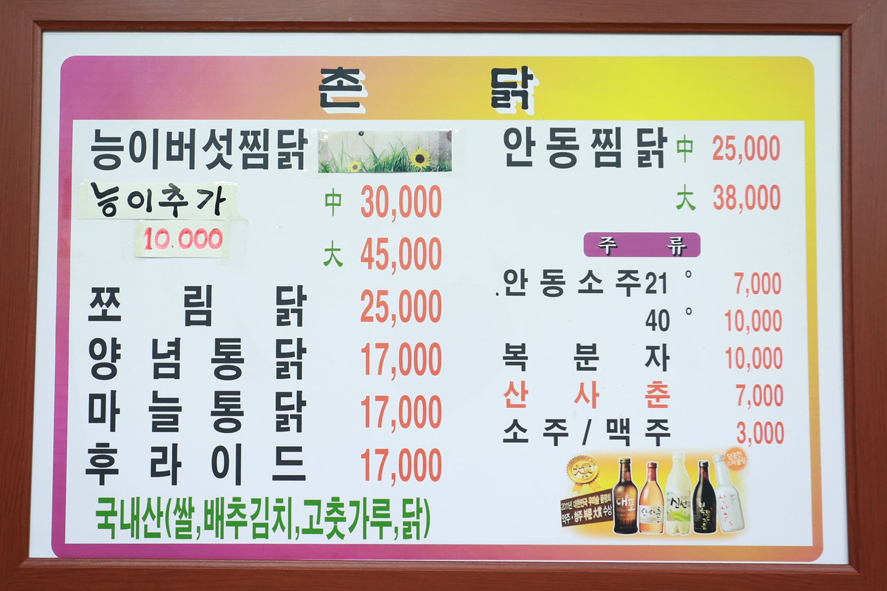 또한 그외 통닭종류와 안동에서 맛볼 수 있는 전통 술인 안동소주도 함께 준비되어 있으니 같이 즐기시면 더욱 좋겠죠?^^