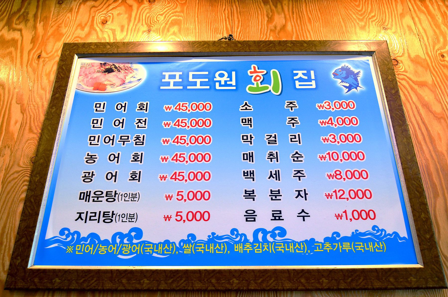 메뉴로는 민어회,민어전,민어무침,농어회,광어회,매운탕,지리탕이 있으며