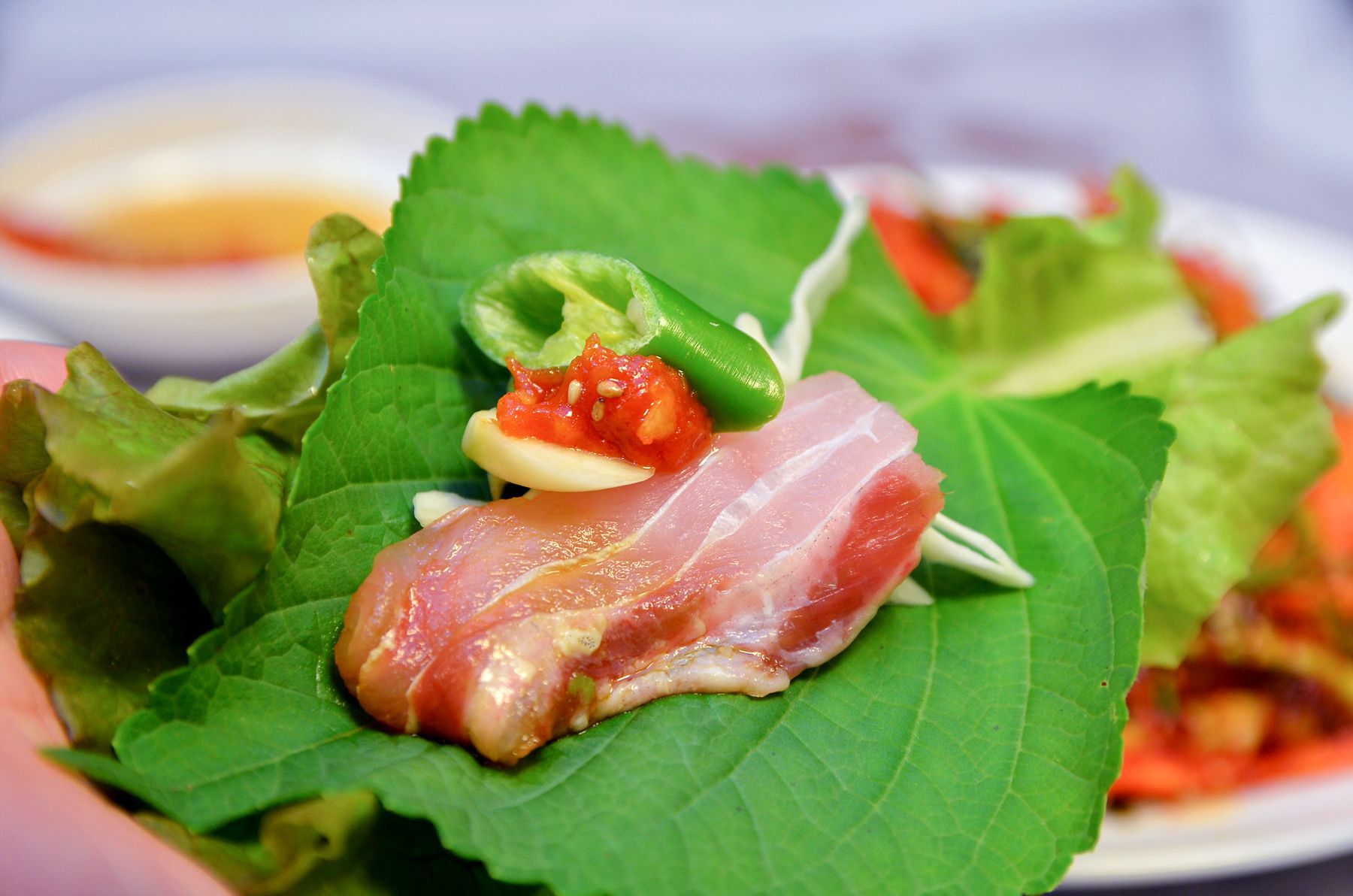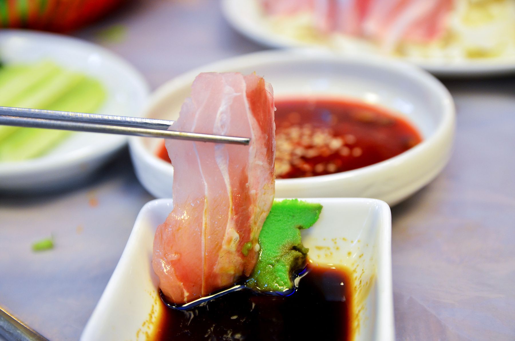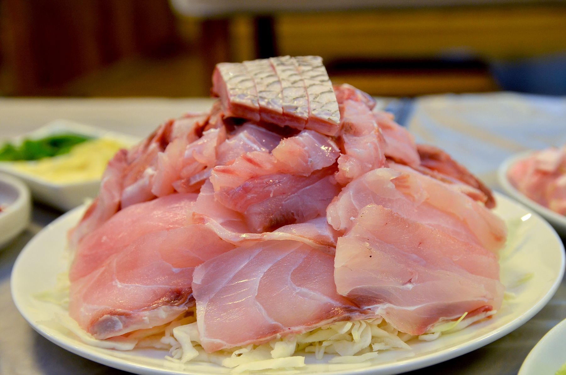 두툼하게 썰어내어 씹는 맛이 좋은 민어회는 탄력과 감칠맛이 더해져 먹는 즐거움이 있고