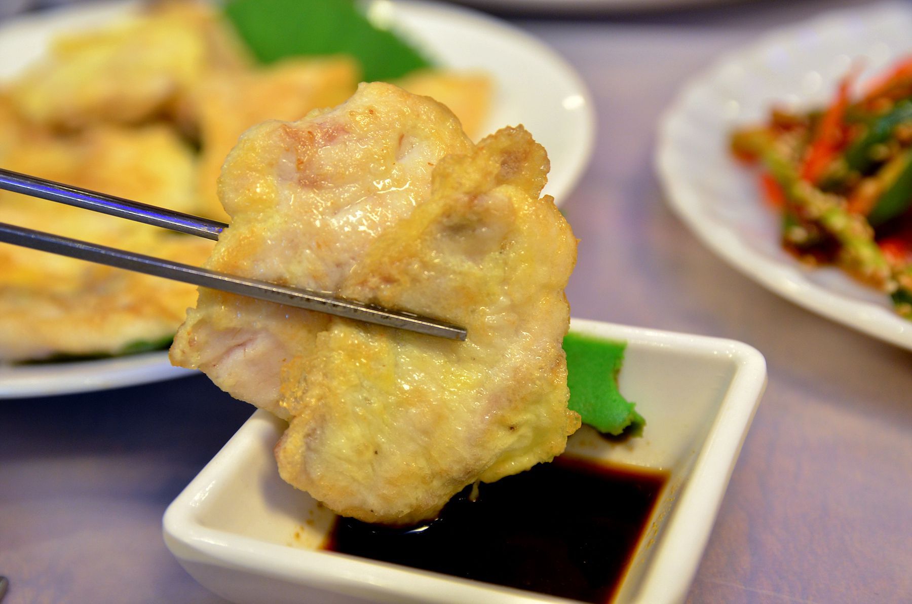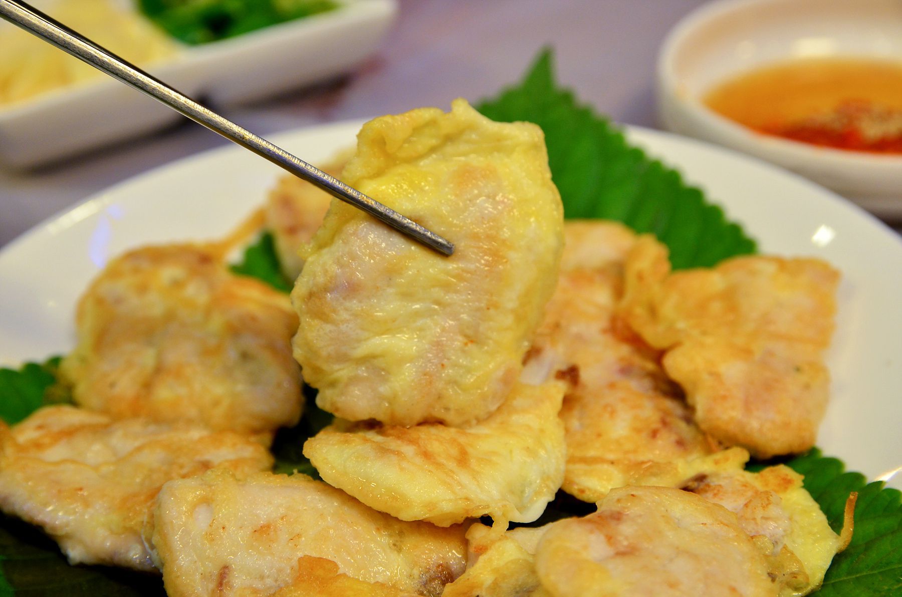 환상의 궁합을 이루고 밀가루를 묻히고 달걀물을 입혀 노릇하게 부쳐진 민어전은