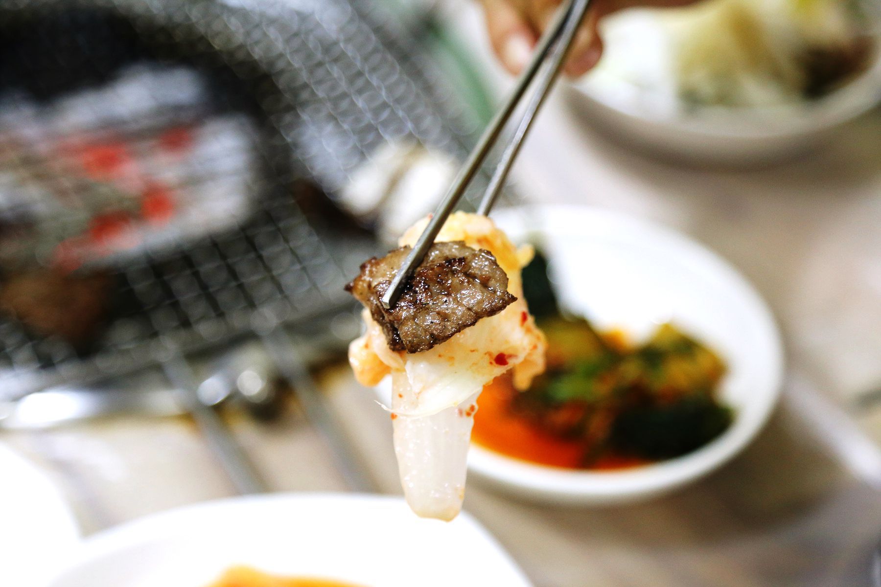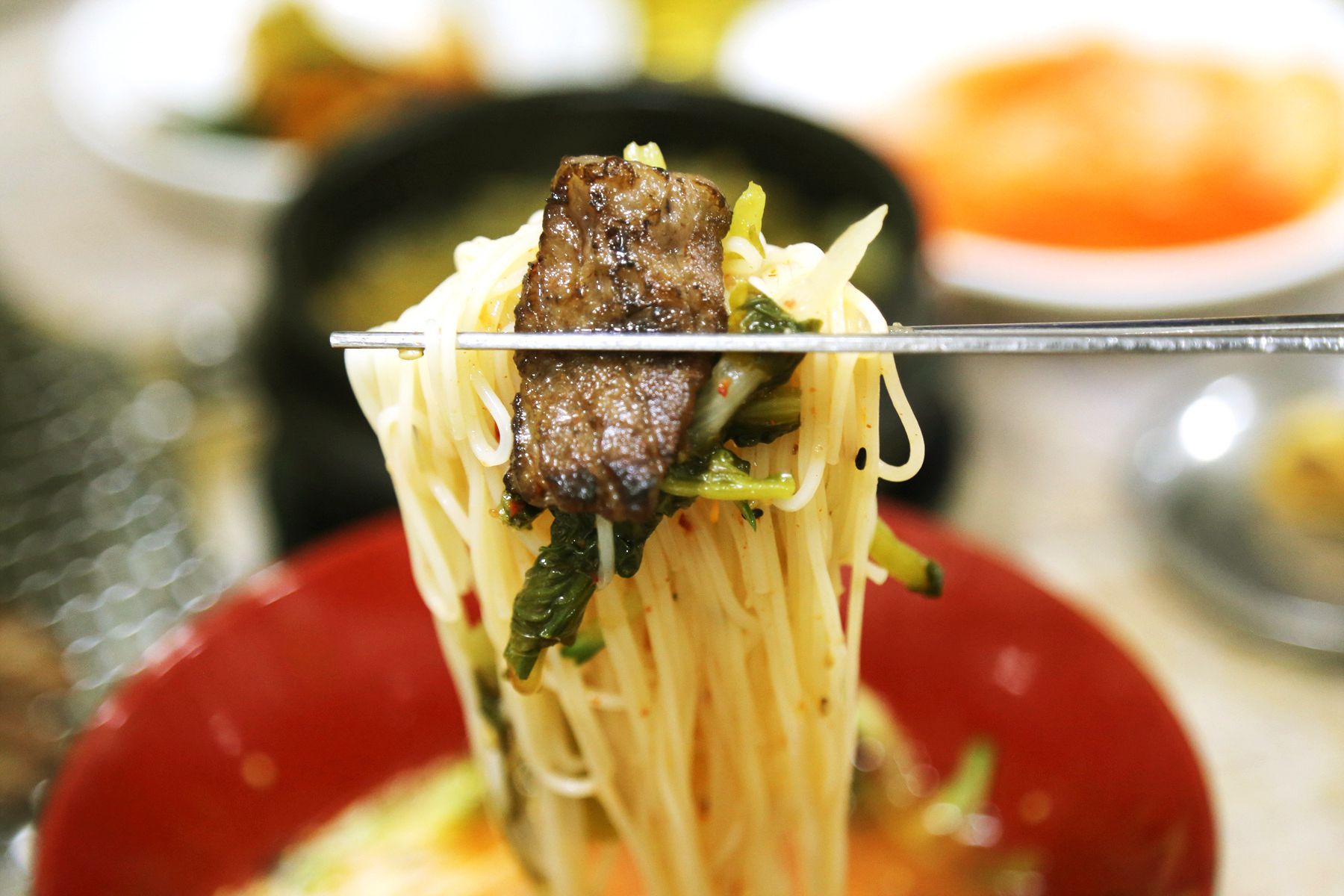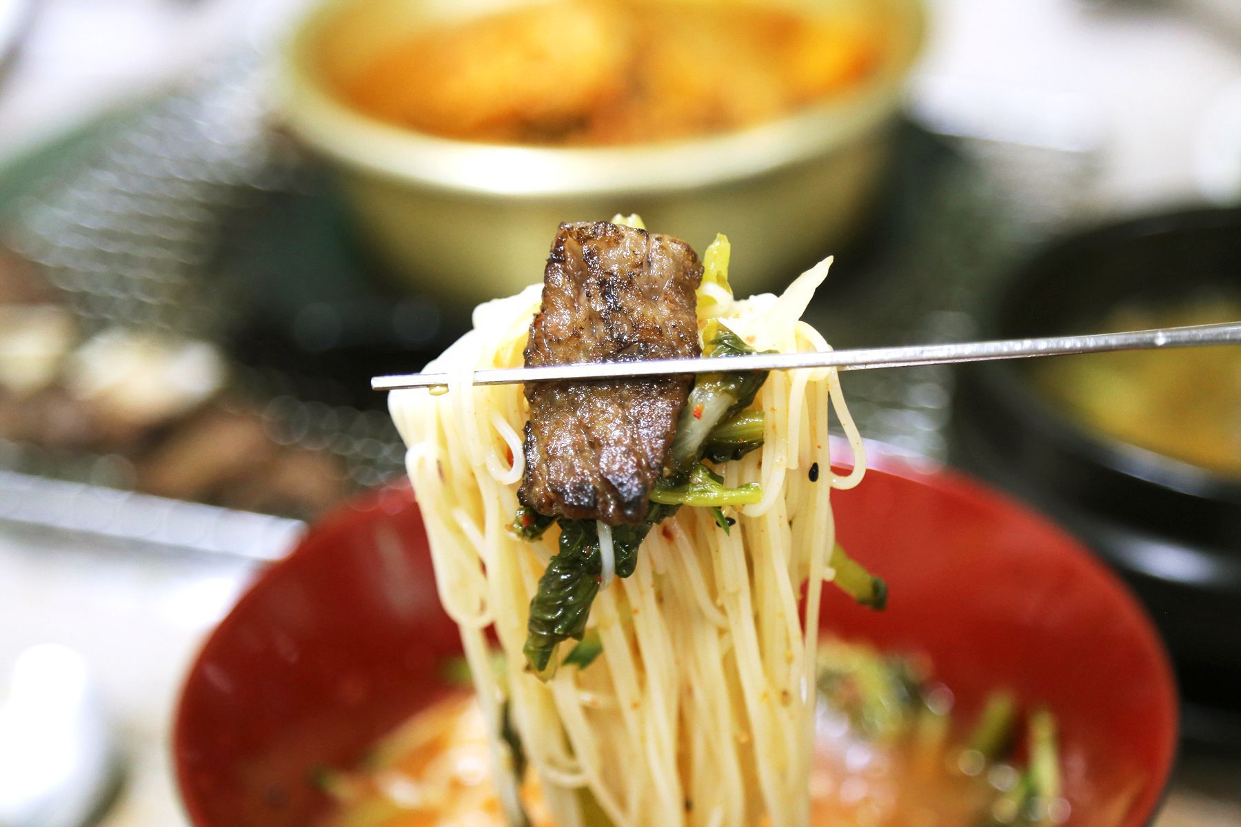맛있게 잘 구워진 고기한점과 아삭한 열무김치 쫄깃한 국수를 한번에 맛본다면