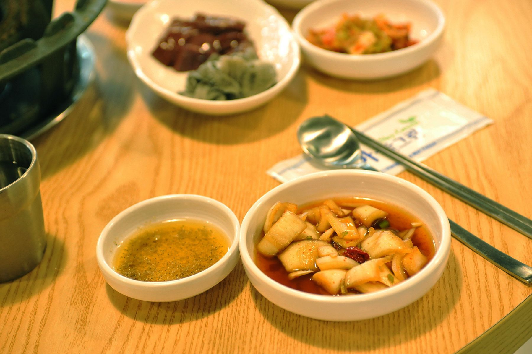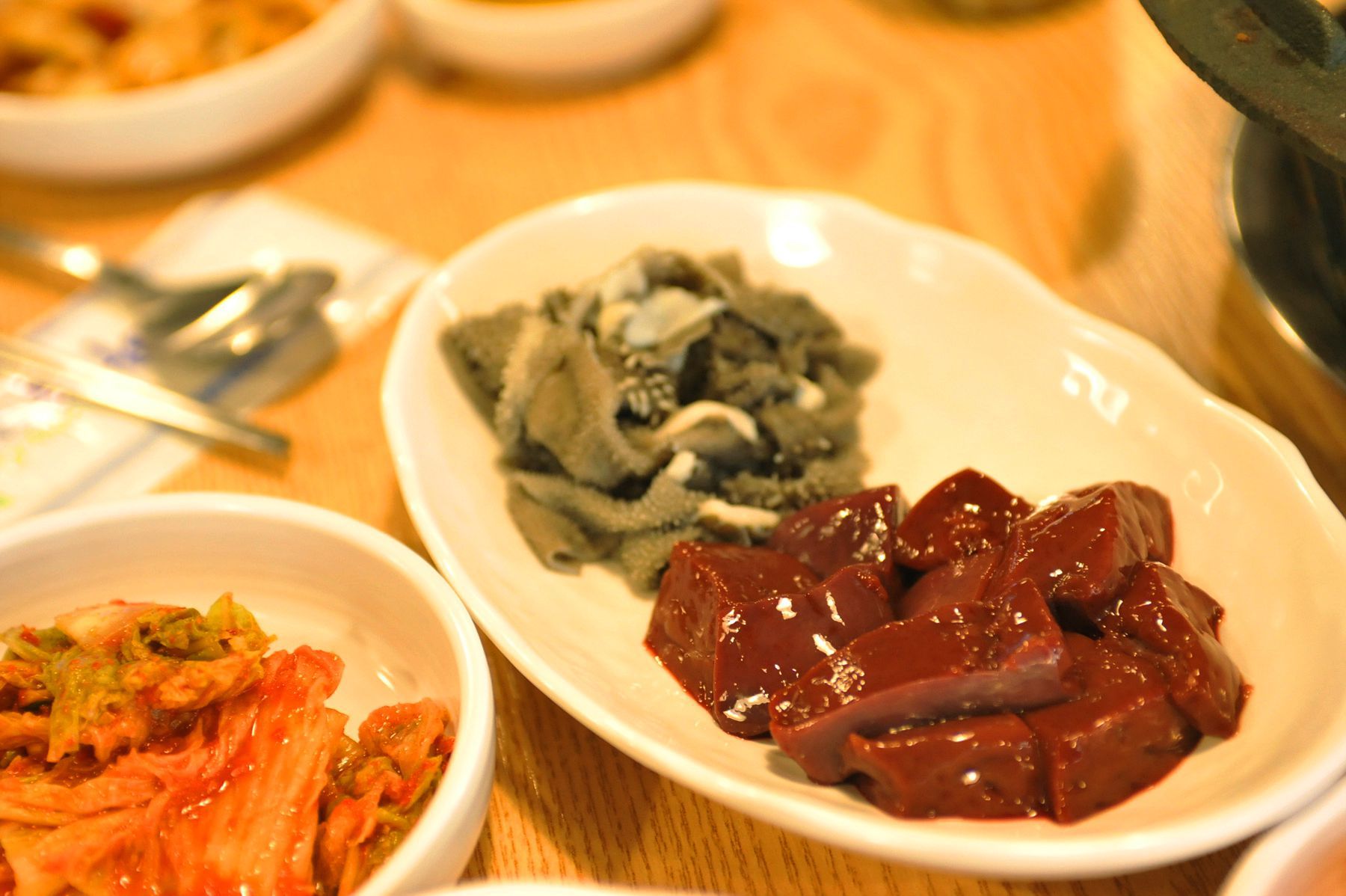 기본 안주로는 생간과 천엽이 제공되고 곱창을 찍어 먹는 양념소스와 기름장과 여러 반찬들이 차려집니다.