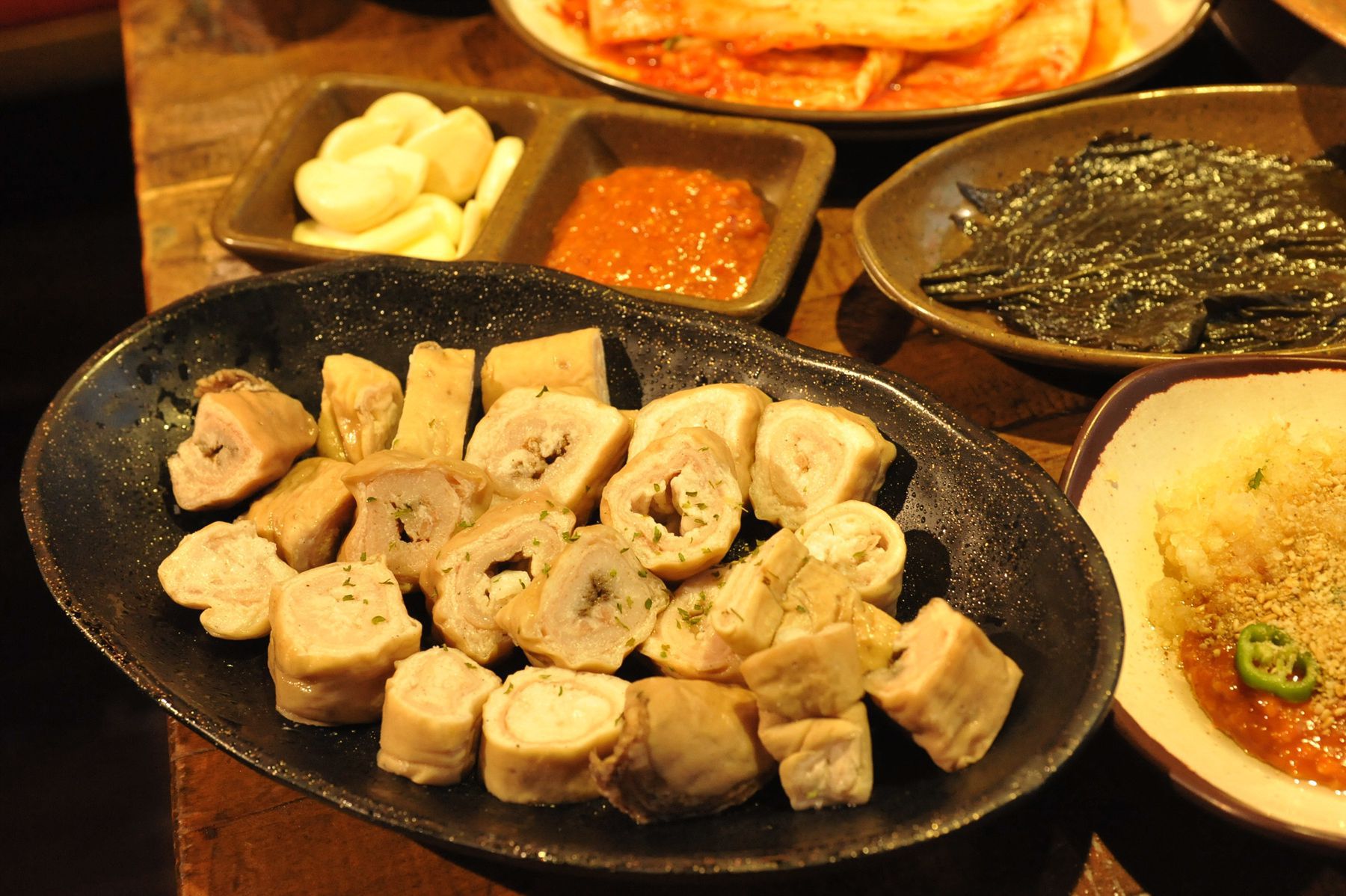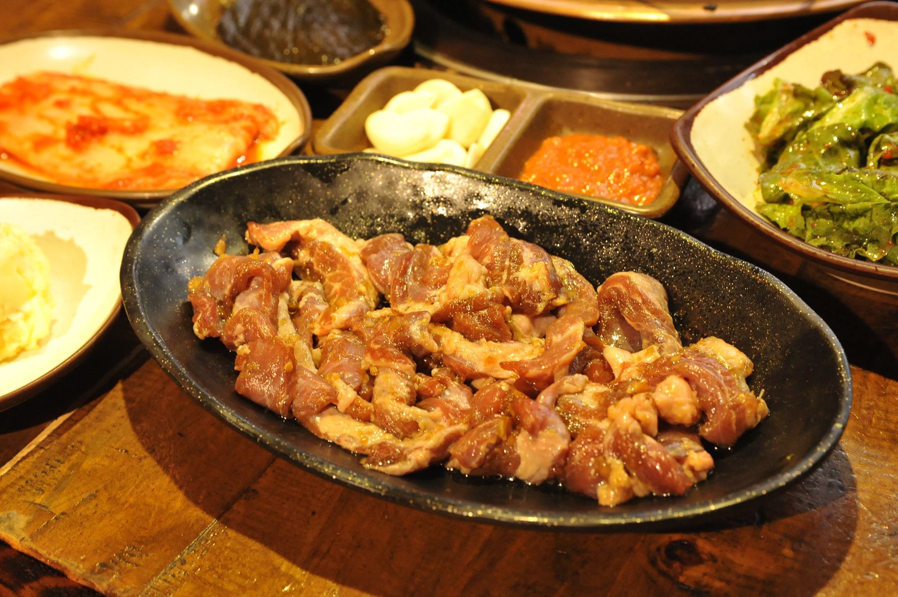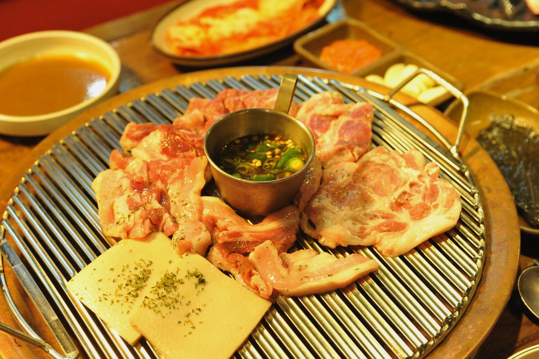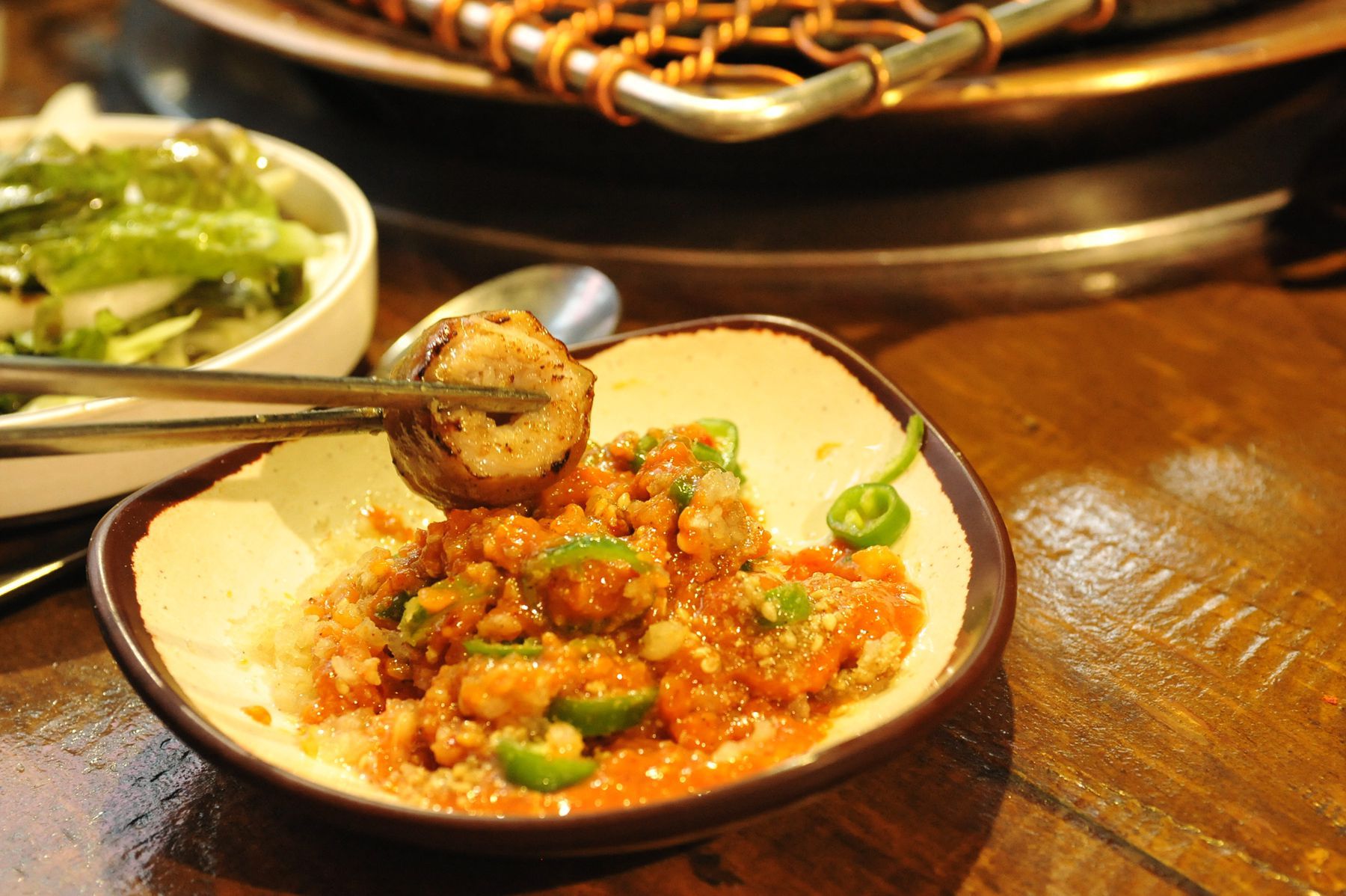 불판위에 올려 지글지글 끓여 고기를 찍어 먹는 맛이 깊이가 있고 감칠맛이 느껴집니다.
