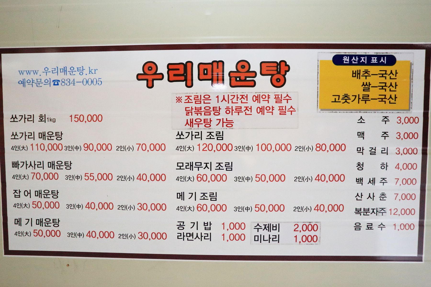 쏘가리, 잡어, 메기까지 매운탕 종류도 다양하며 재료의 신선함은 물론 얼큰하고 시원한 국물맛까지 끝내주는 '우리매운탕'입니다.
