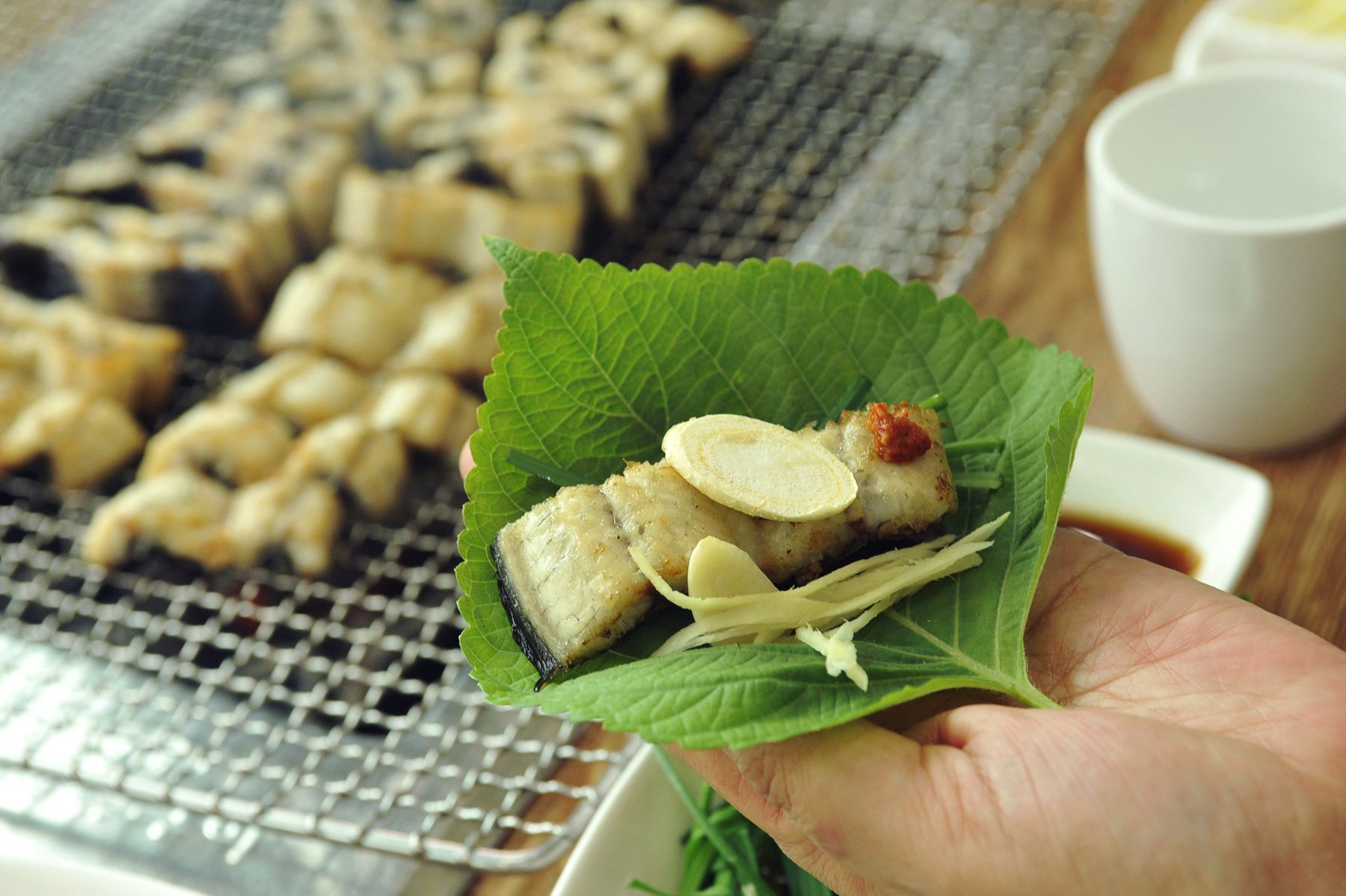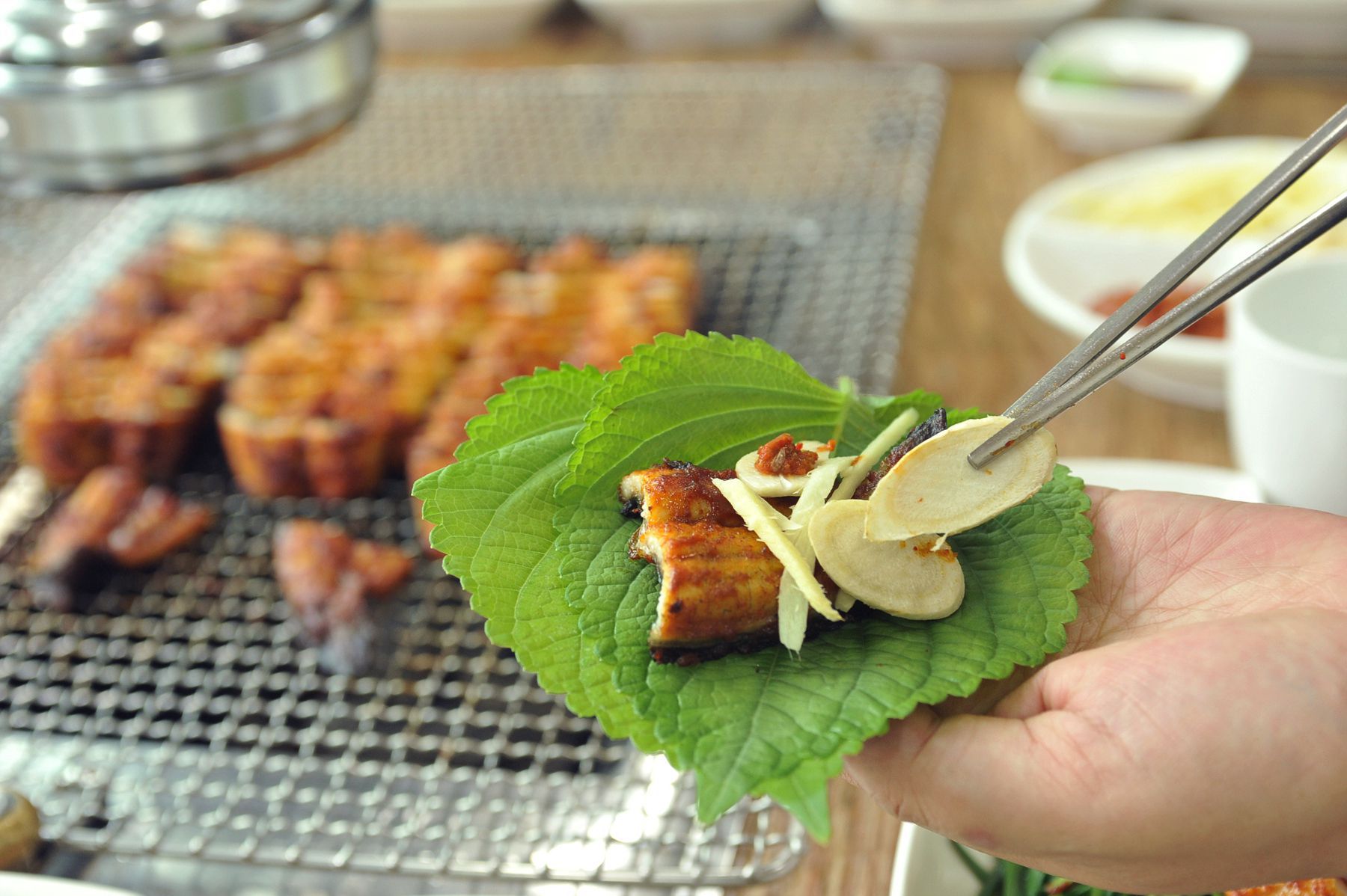 노릿노릿하게 잘익은 장어는 먹기 좋은 크기로 잘라 그대로의 담백함을 즐기셔도 좋지만 향긋한 깻잎에 생강과 마늘을 더하여 드시면
