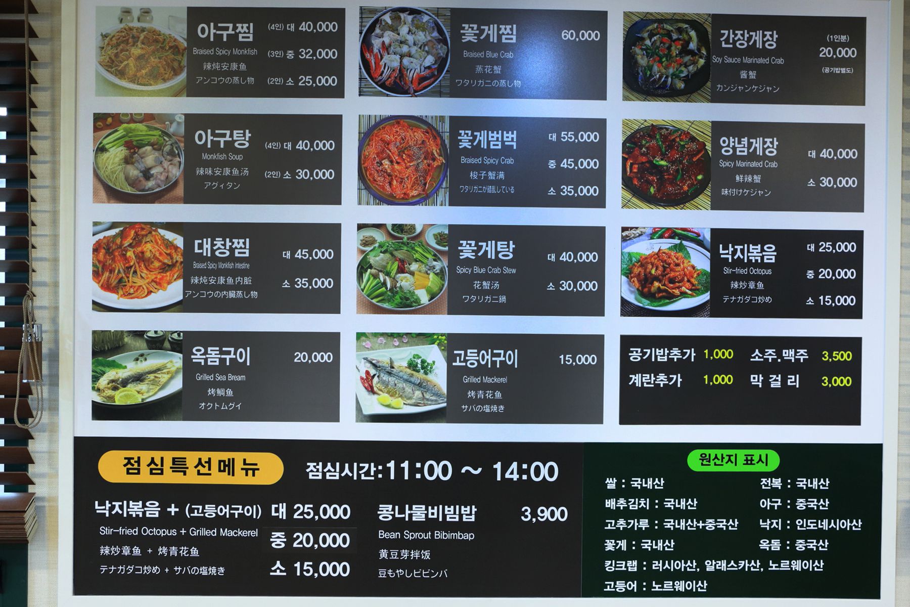 아구찜, 간장게장, 꽃게범벅 외에도 다양한 메뉴들이 준비되어 있습니다.