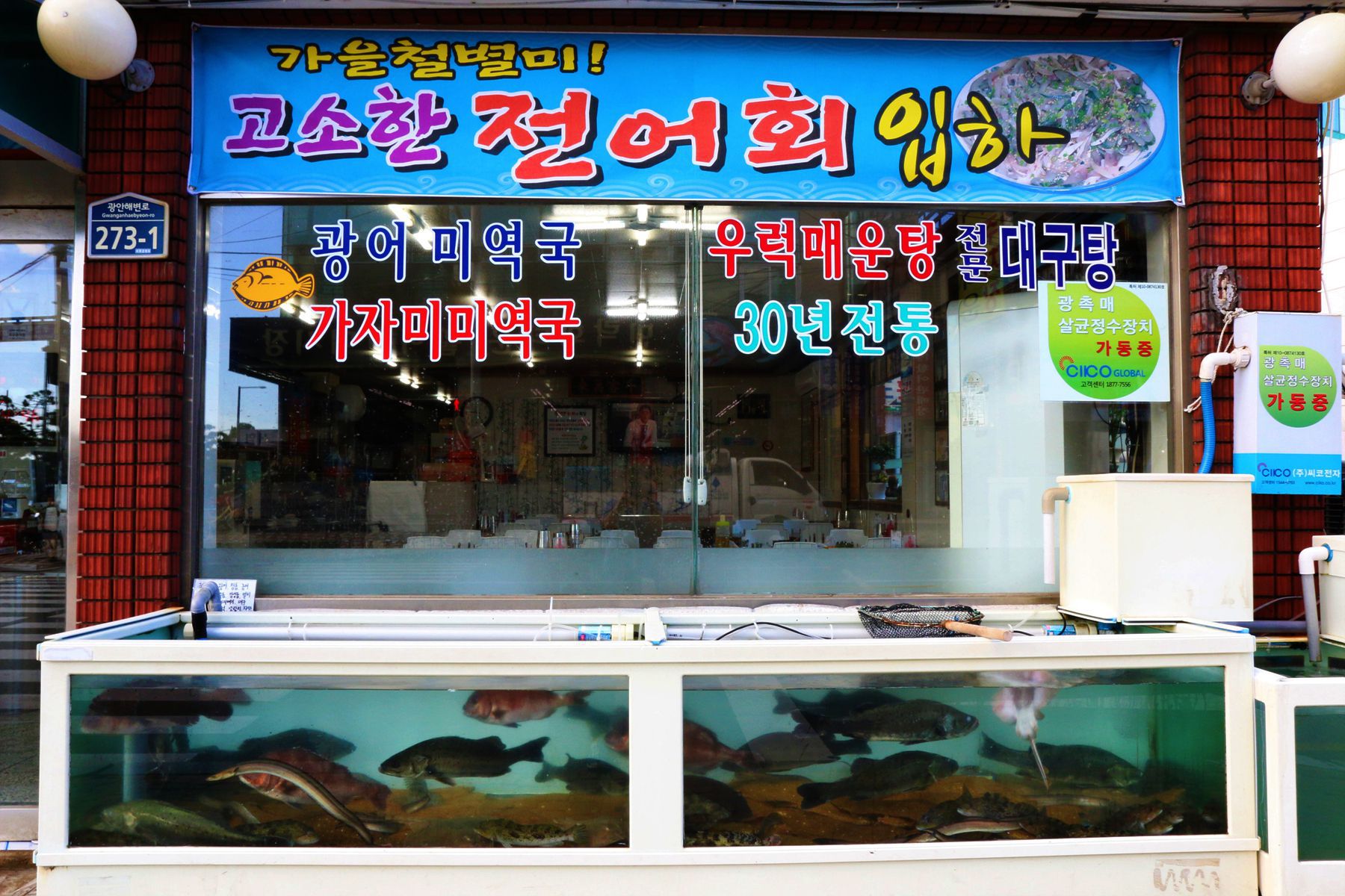 민락동회타운 건물 바로 앞에 위치해 있는 물회전문점 신라횟집을 소개합니다.