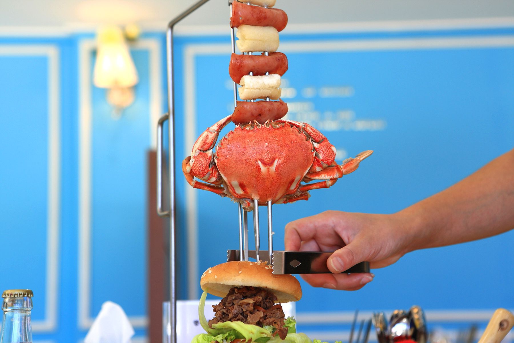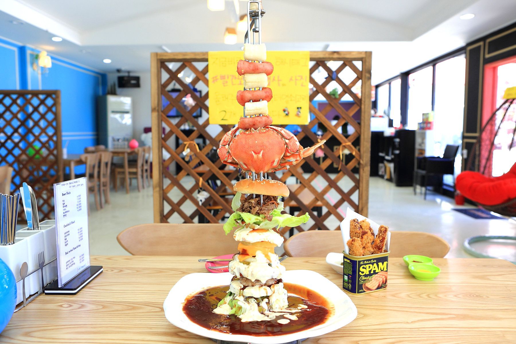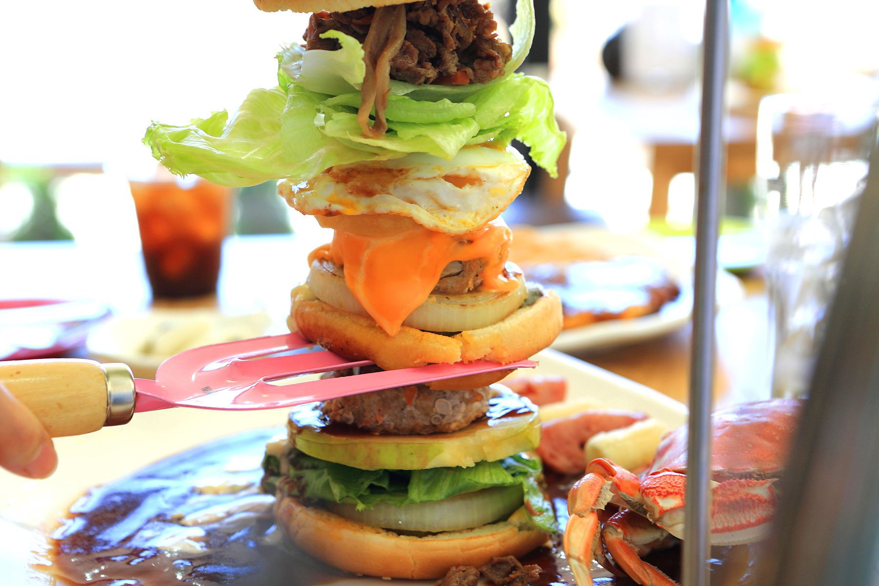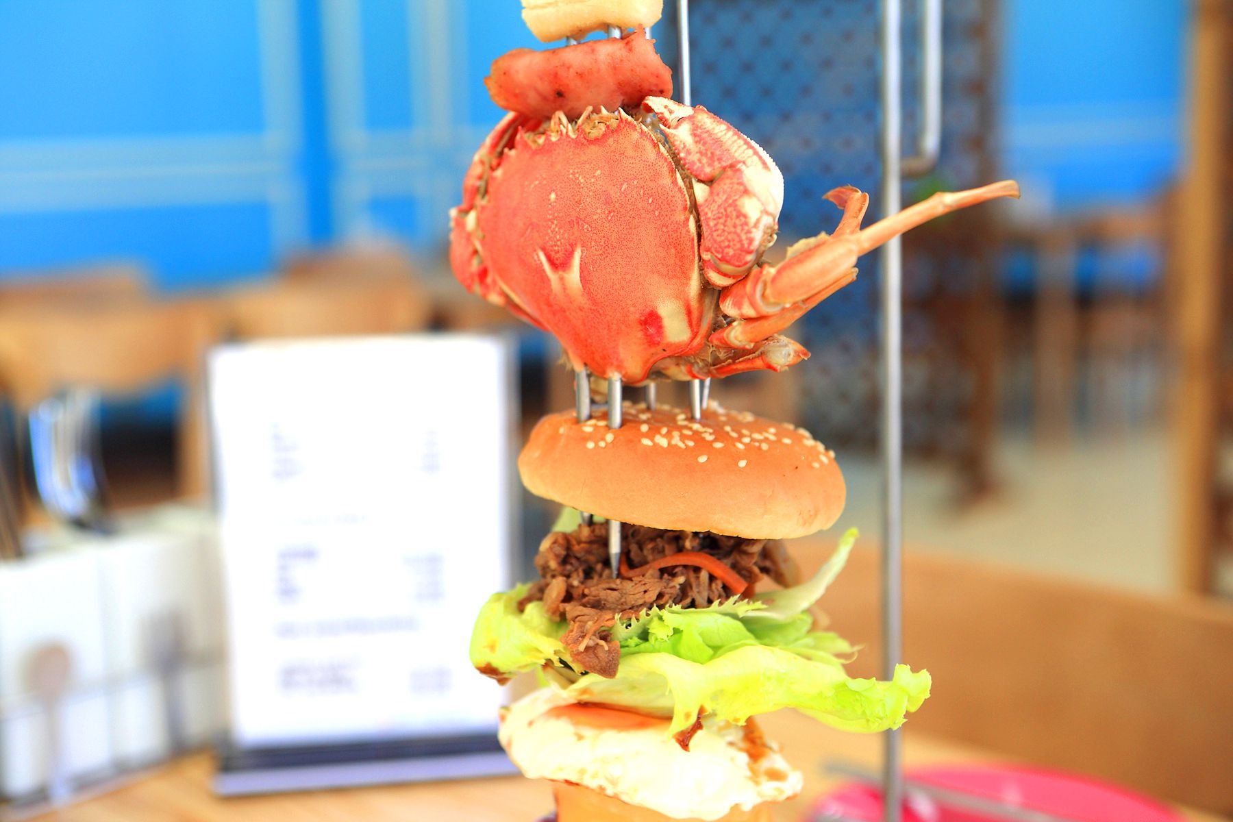 두툼한 빵위에 두툼한 패티까지 갖은 재료를 올리고 올려 꽃게까지 올려