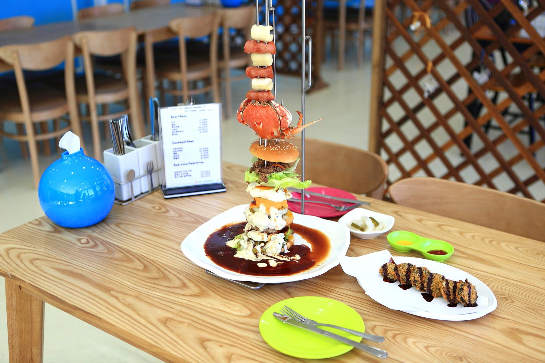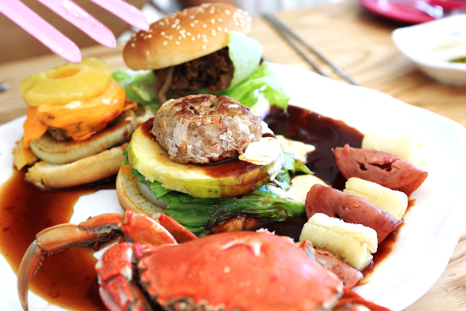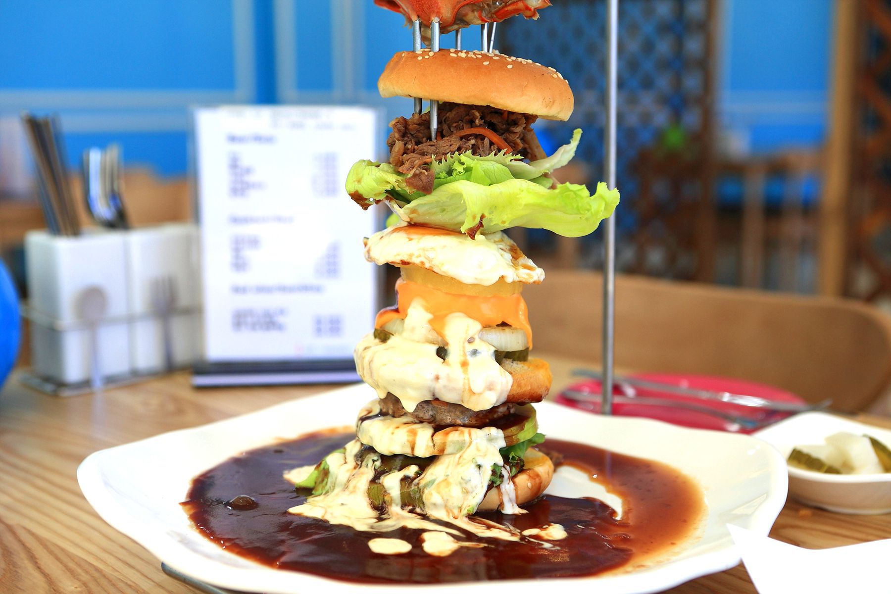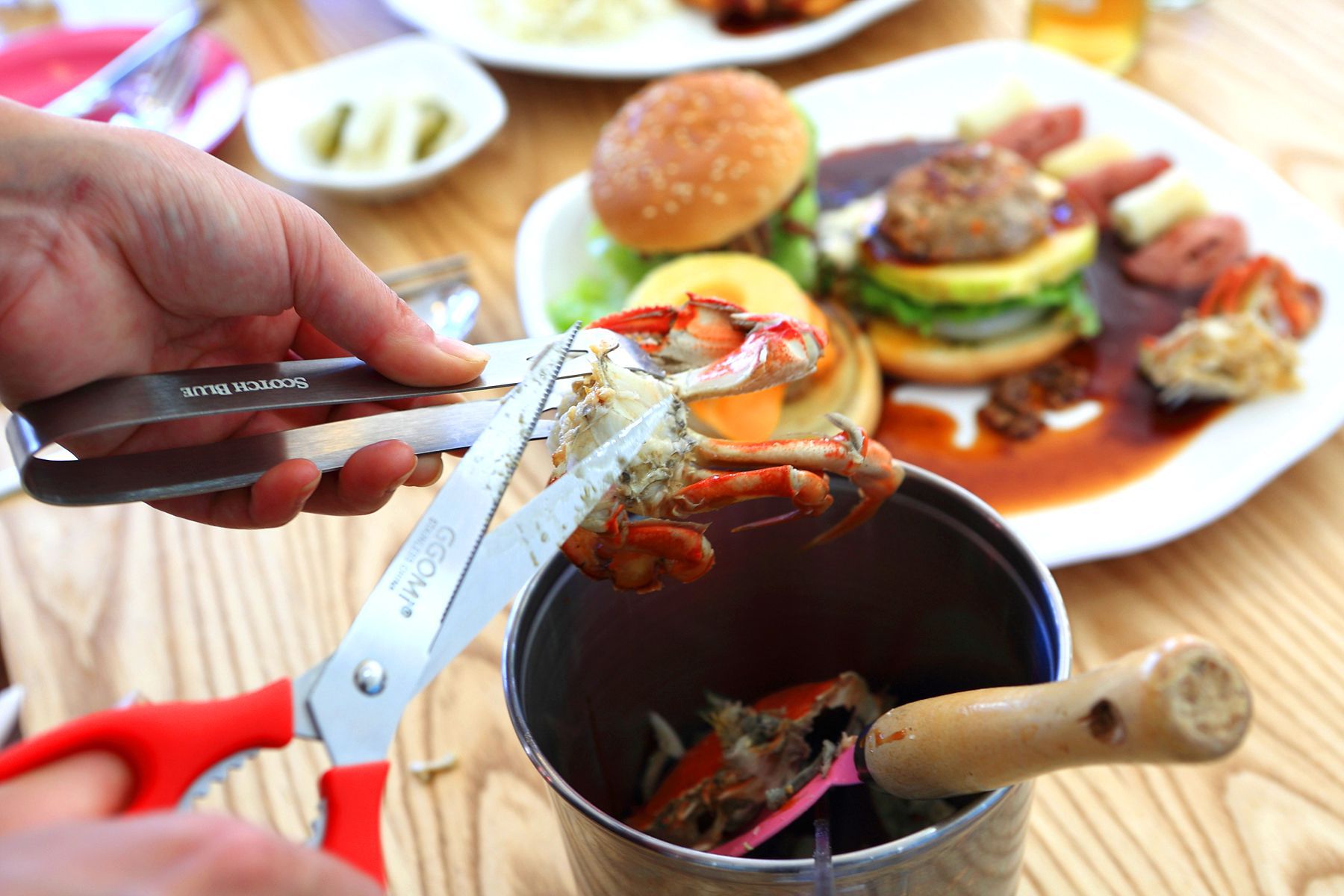 두툼한 빵위에 두툼한 패티까지 갖은 재료를 올리고 올려 꽃게까지 올려