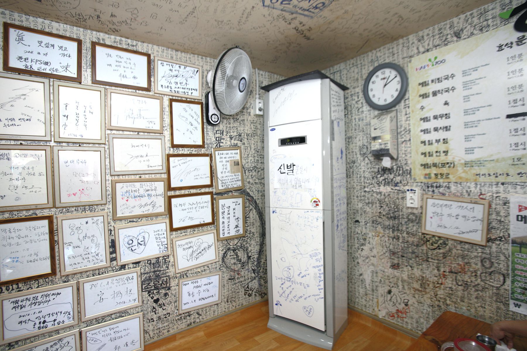 가게 벽에는 손님들의 낙서와 각종 연예인들이 방문했던 싸인과 방송국에 소개되었던 글 들이