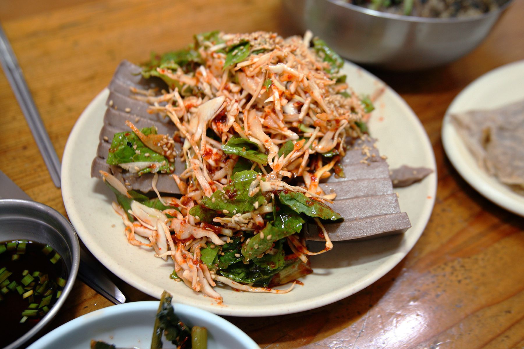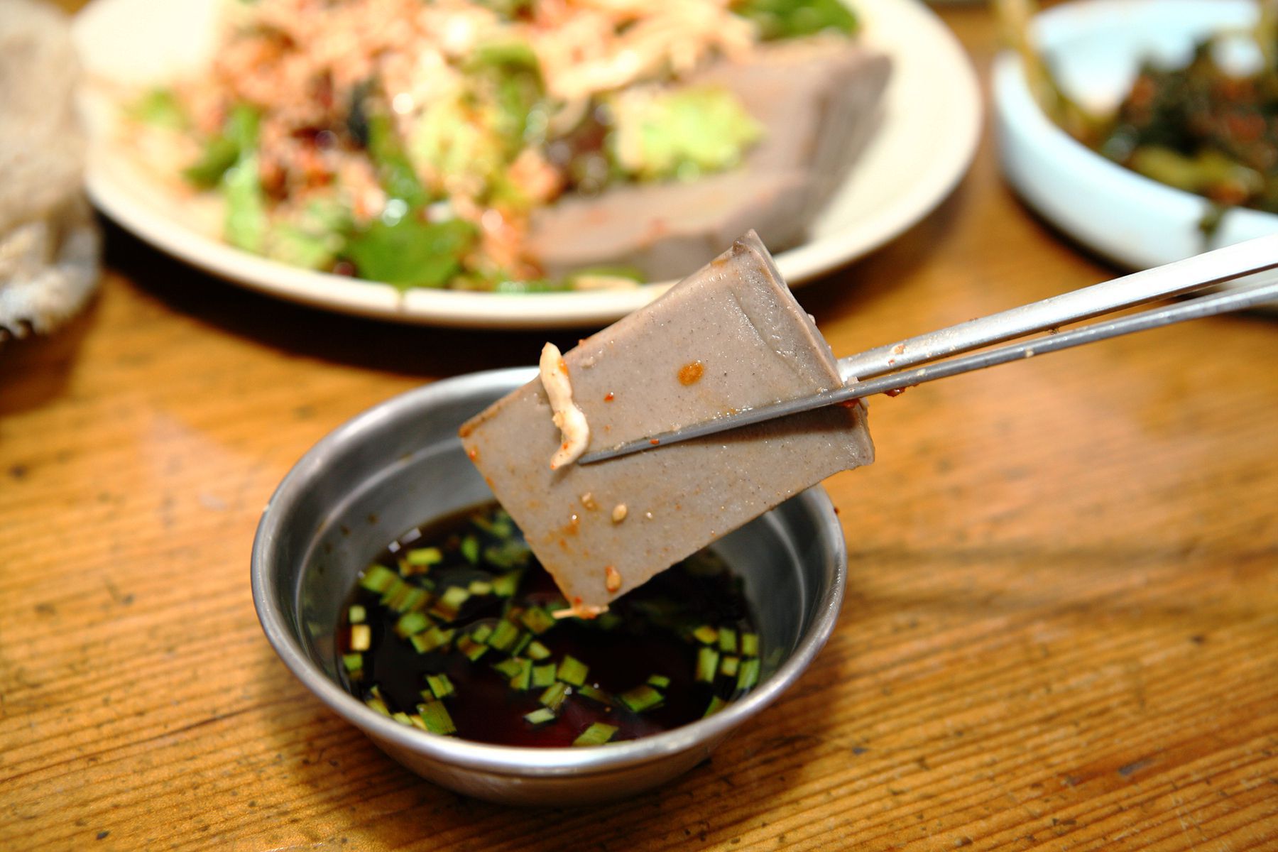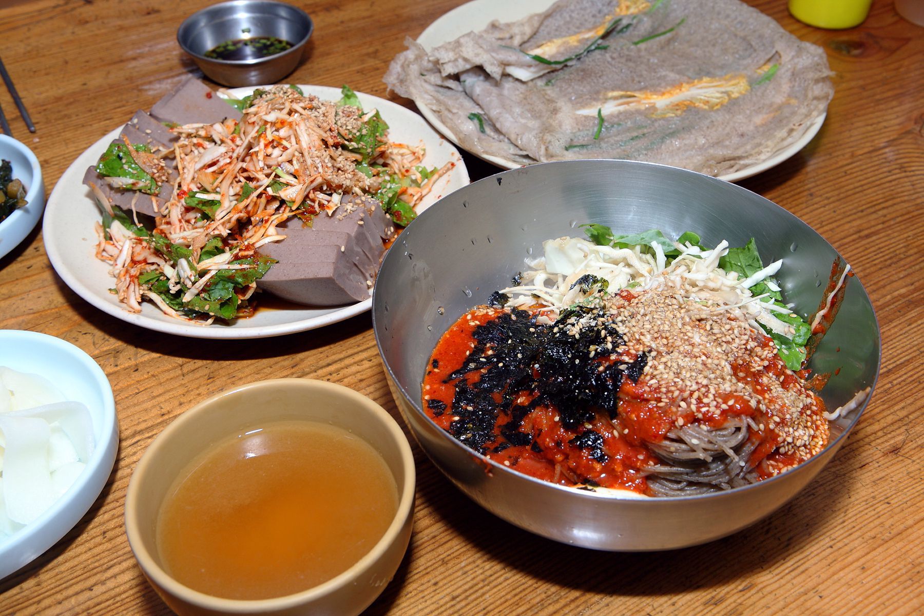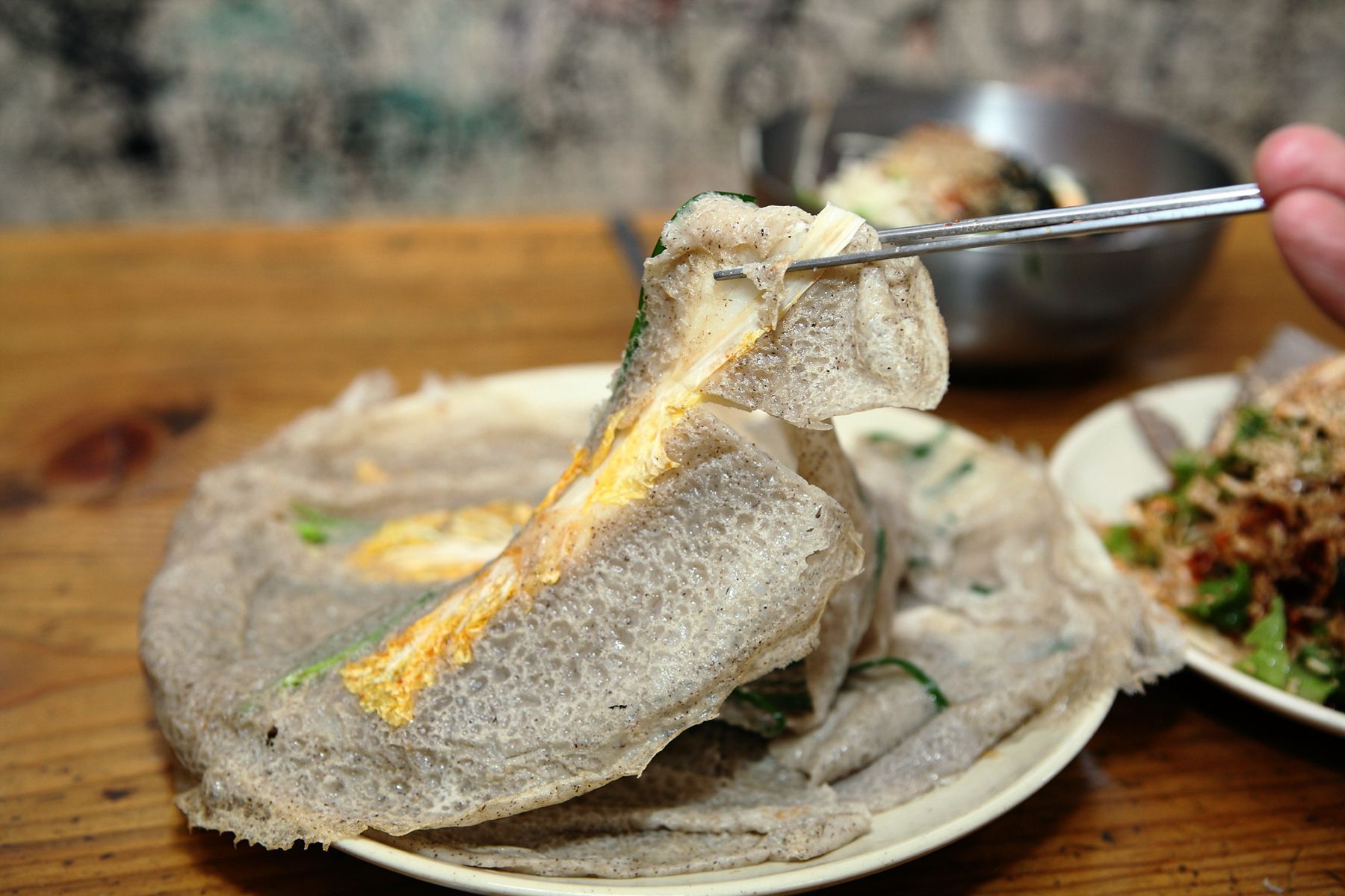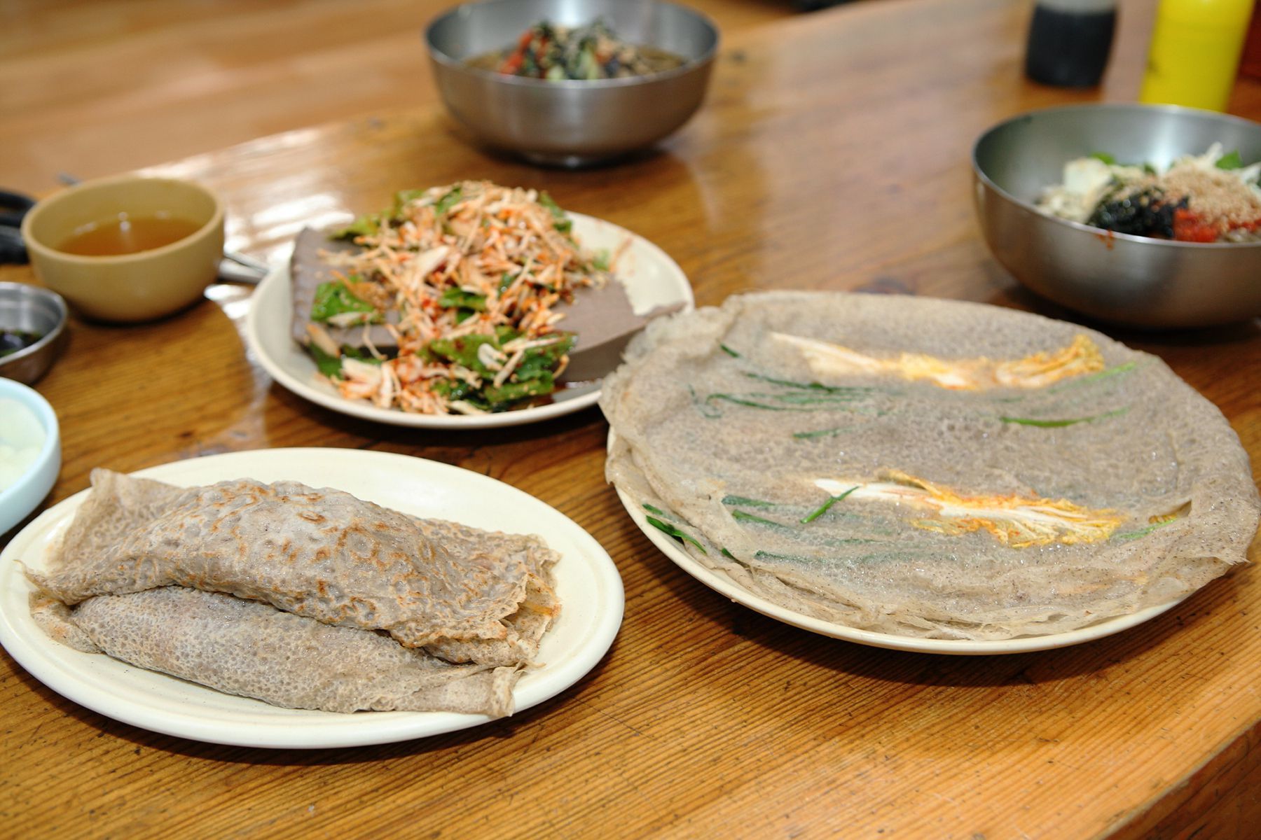 메밀반죽에 배추를 얹어 만들어진 메밀부침은 쫀득하면서도 담백한 맛이 일품이고
