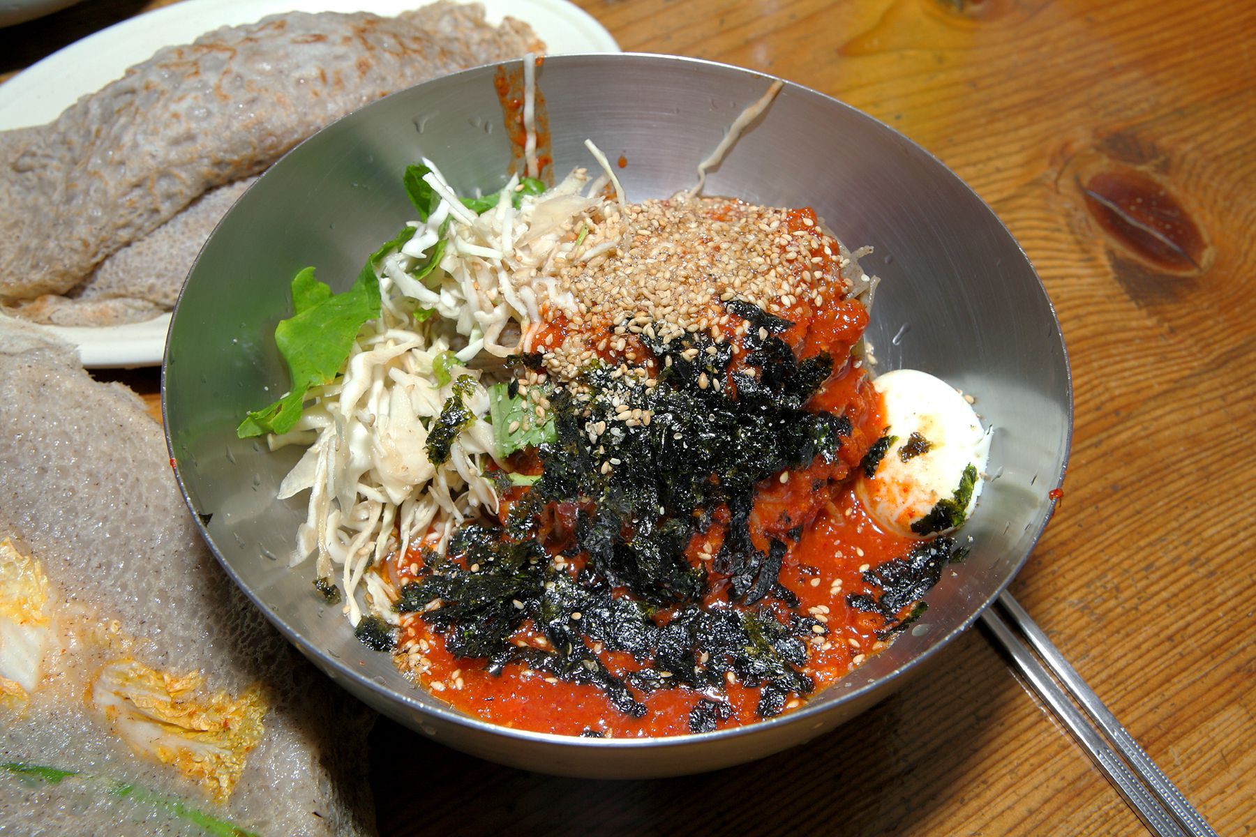 바로 면을 삶아 매콤한 소스와 야채가 곁들여 지는 메밀비빔국수는