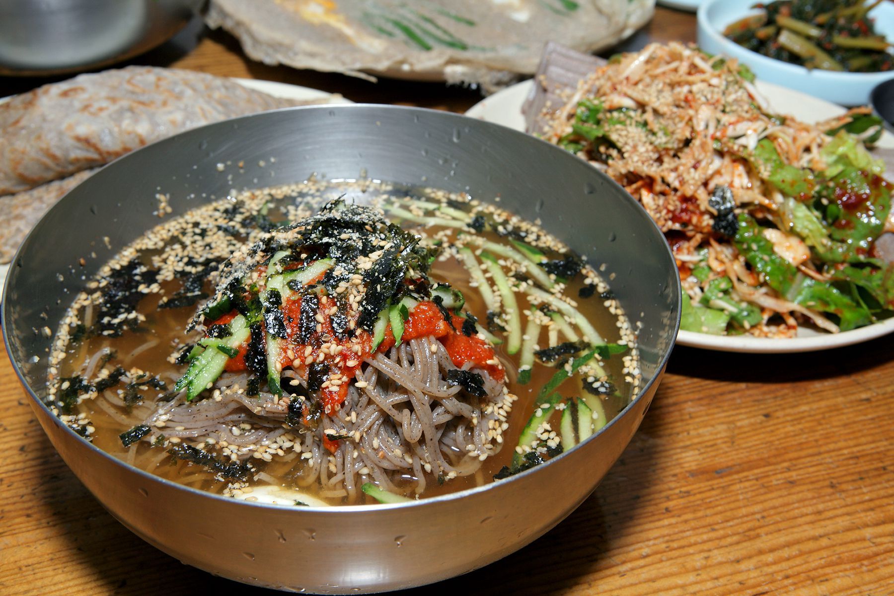 살얼음 띄운 육수를 붓고 양념장과 오이를 올린 메밀막국수는 새콤매콤한 육수가 맛깔스럽고