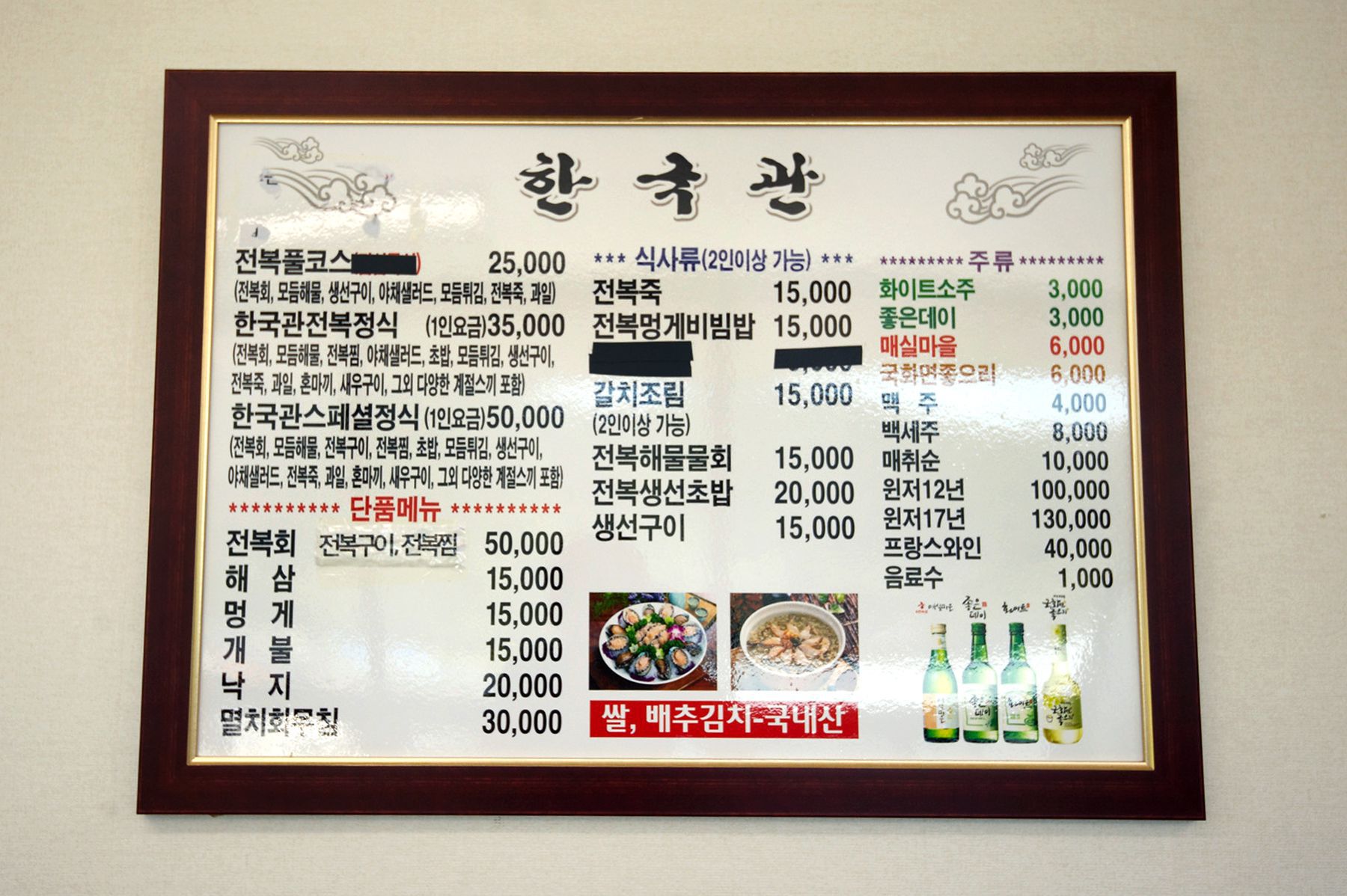 한국관전복정식은 35,000원, 한국관스페셜정식은 50,000원으로