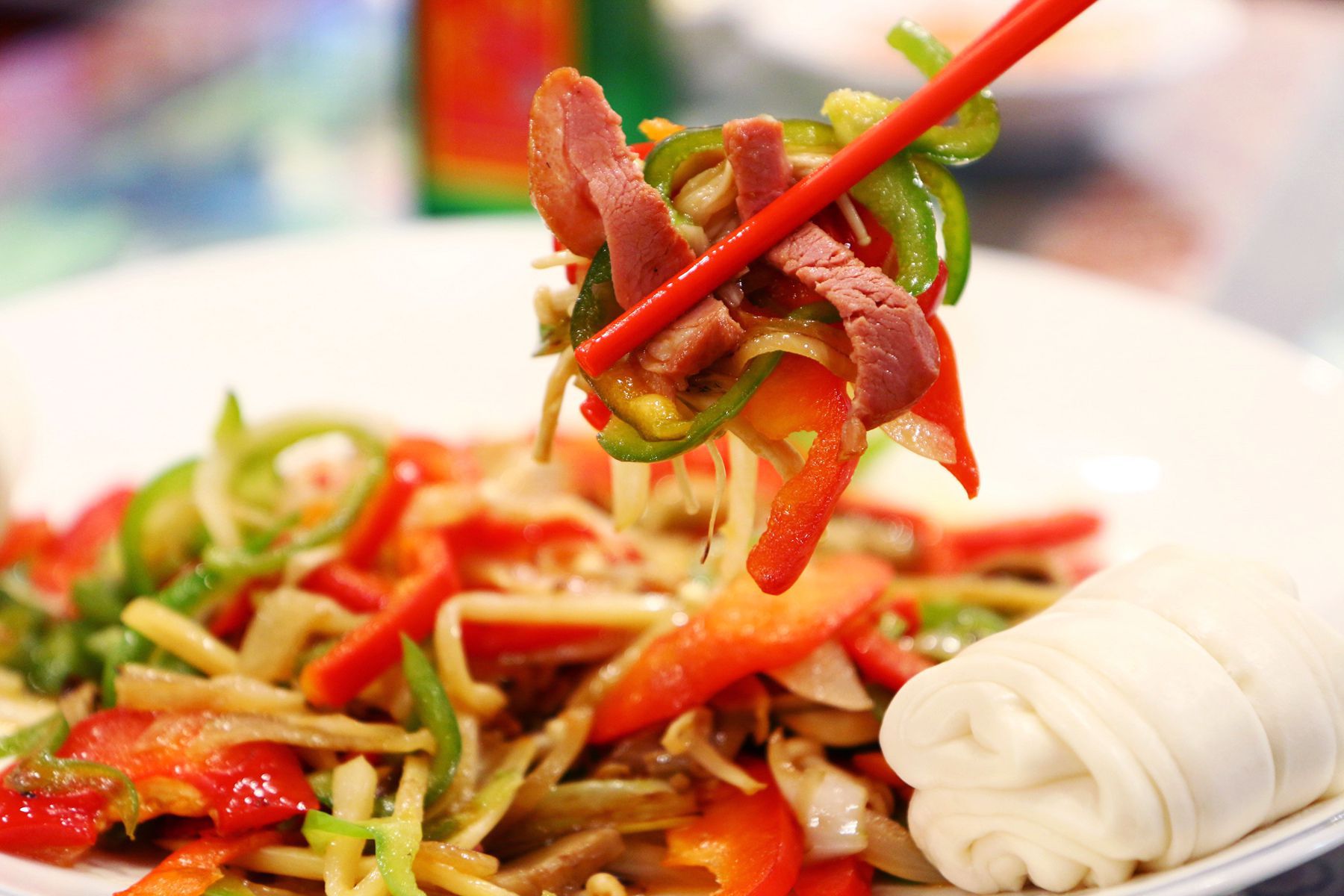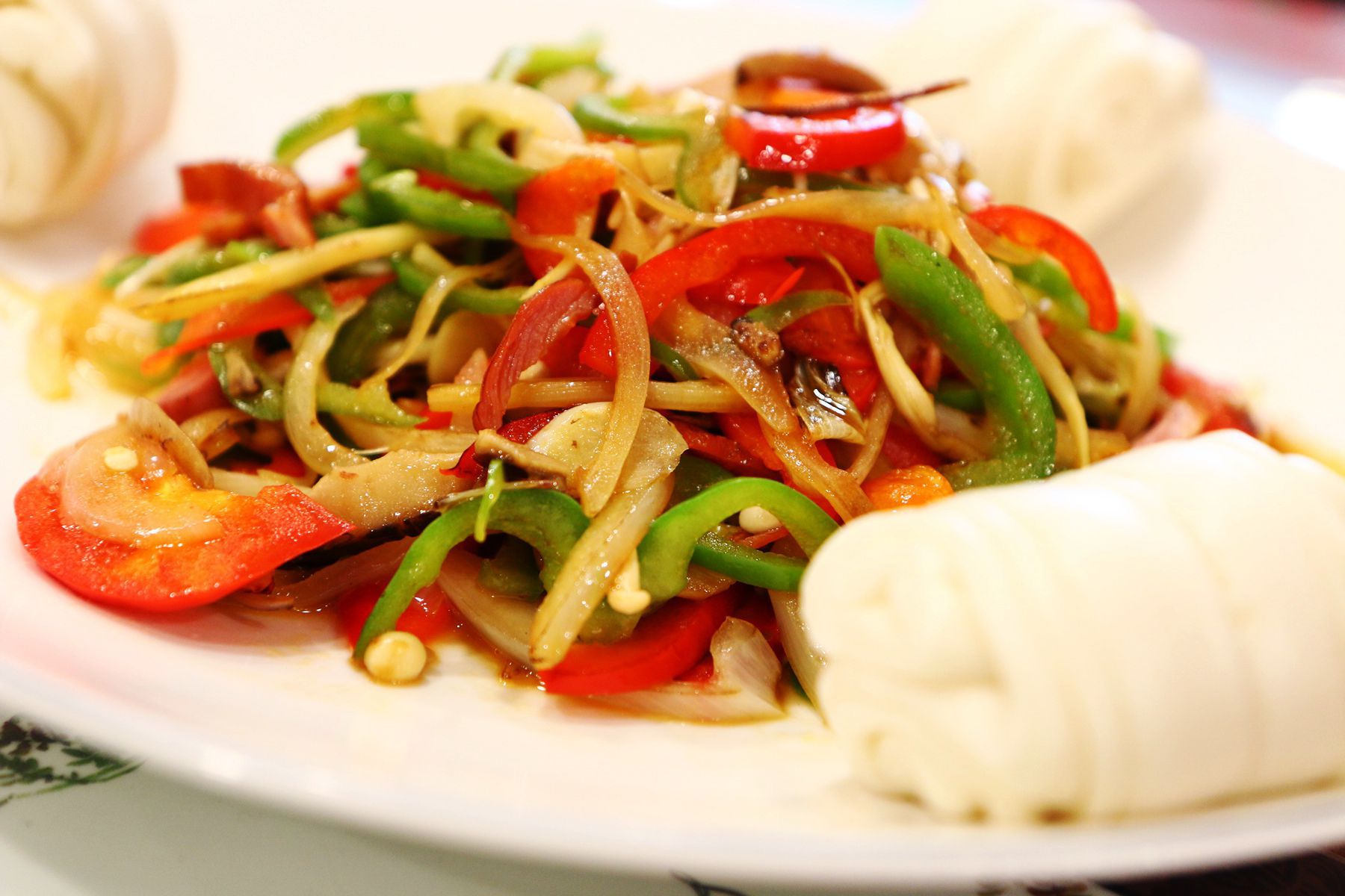 가늘게 채썬 피망과 쇠고기,돼지고기와 각종 야채를 살짝 매콤하게 볶아 먹는 음식으로 부들러운 꽃빵에