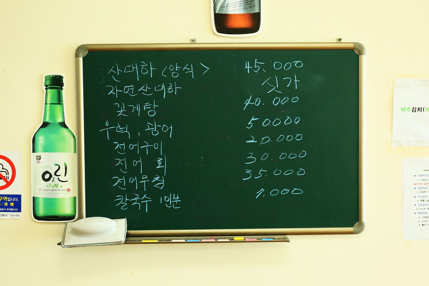 메뉴로는 산대하,자연산대하,꽃게탕,우럭,광어,전어구이,전어회,전어무침,칼국수 등이 준비되어 있습니다.