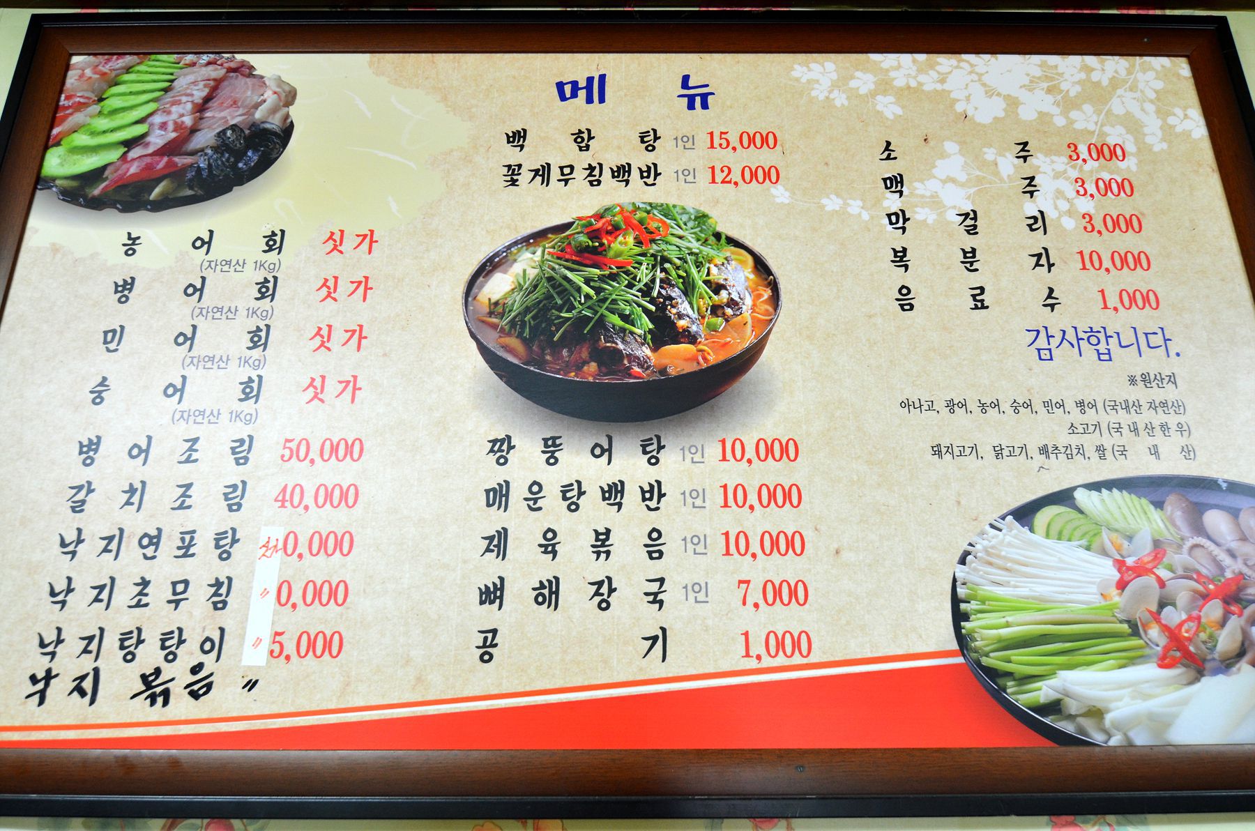 메뉴로는 이곳 지역 특산물인 짱뚱어탕,백합탕,꽃게무침백반등이 있으며 그외 싱싱한 회,조림등이 준비되어 있습니다.^^