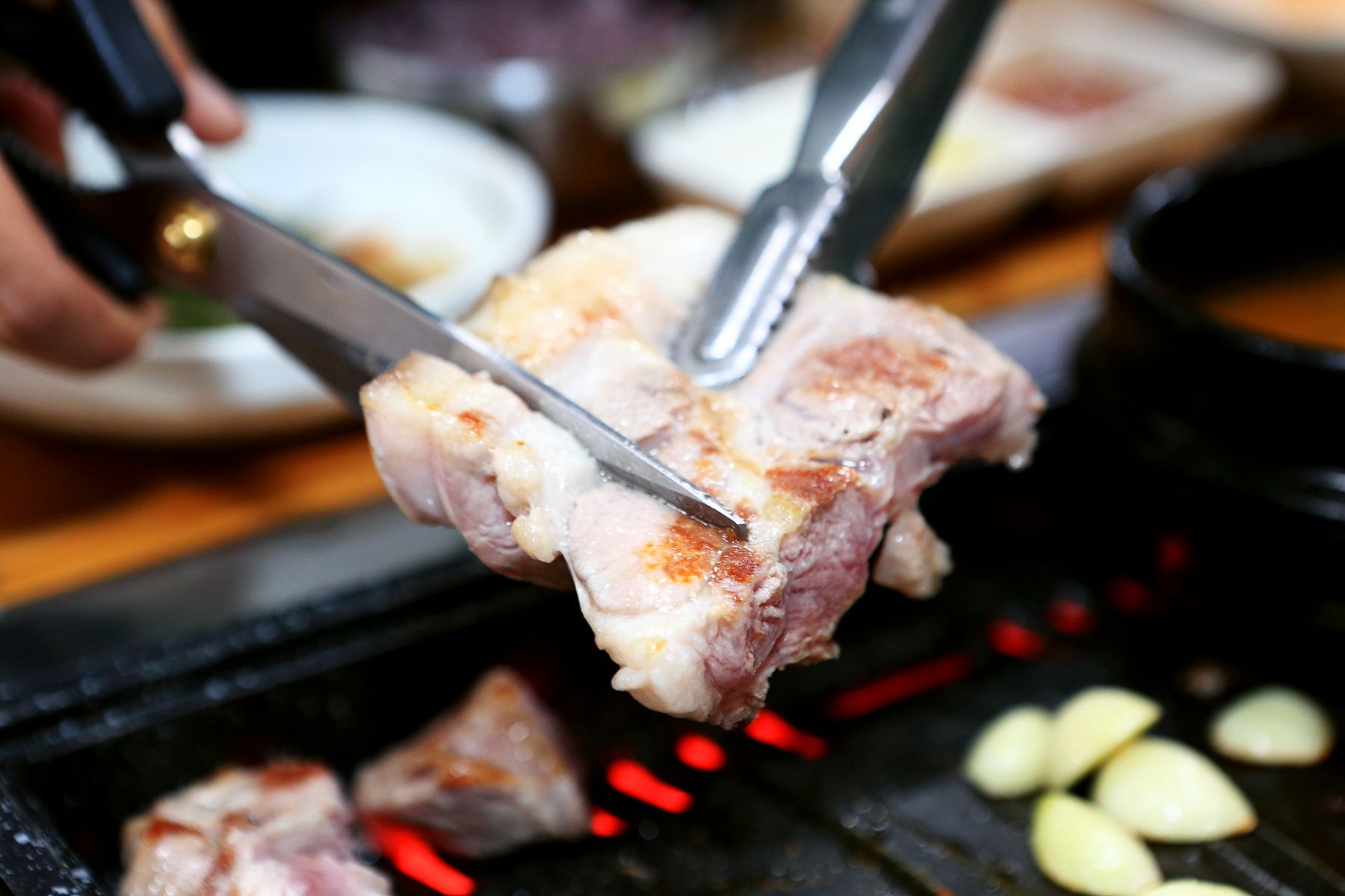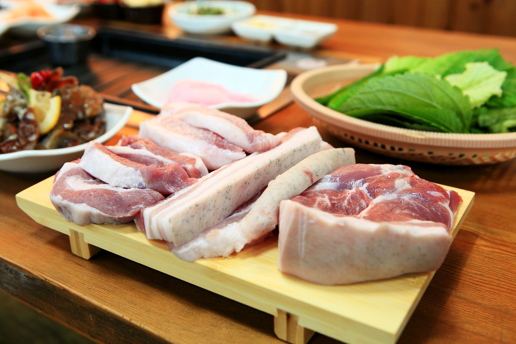 노릿노릿 잘 익힌 고기는 먹기 좋은 크기로 잘라 제공되는 싱싱한 야채에 쌈을 싸서 드시거나