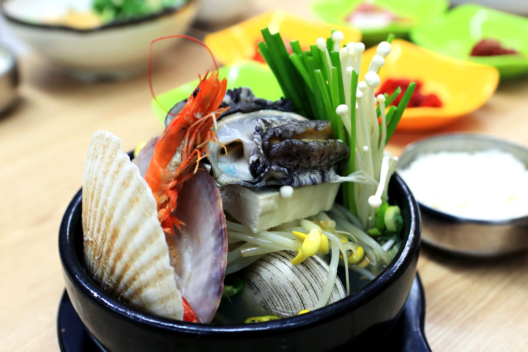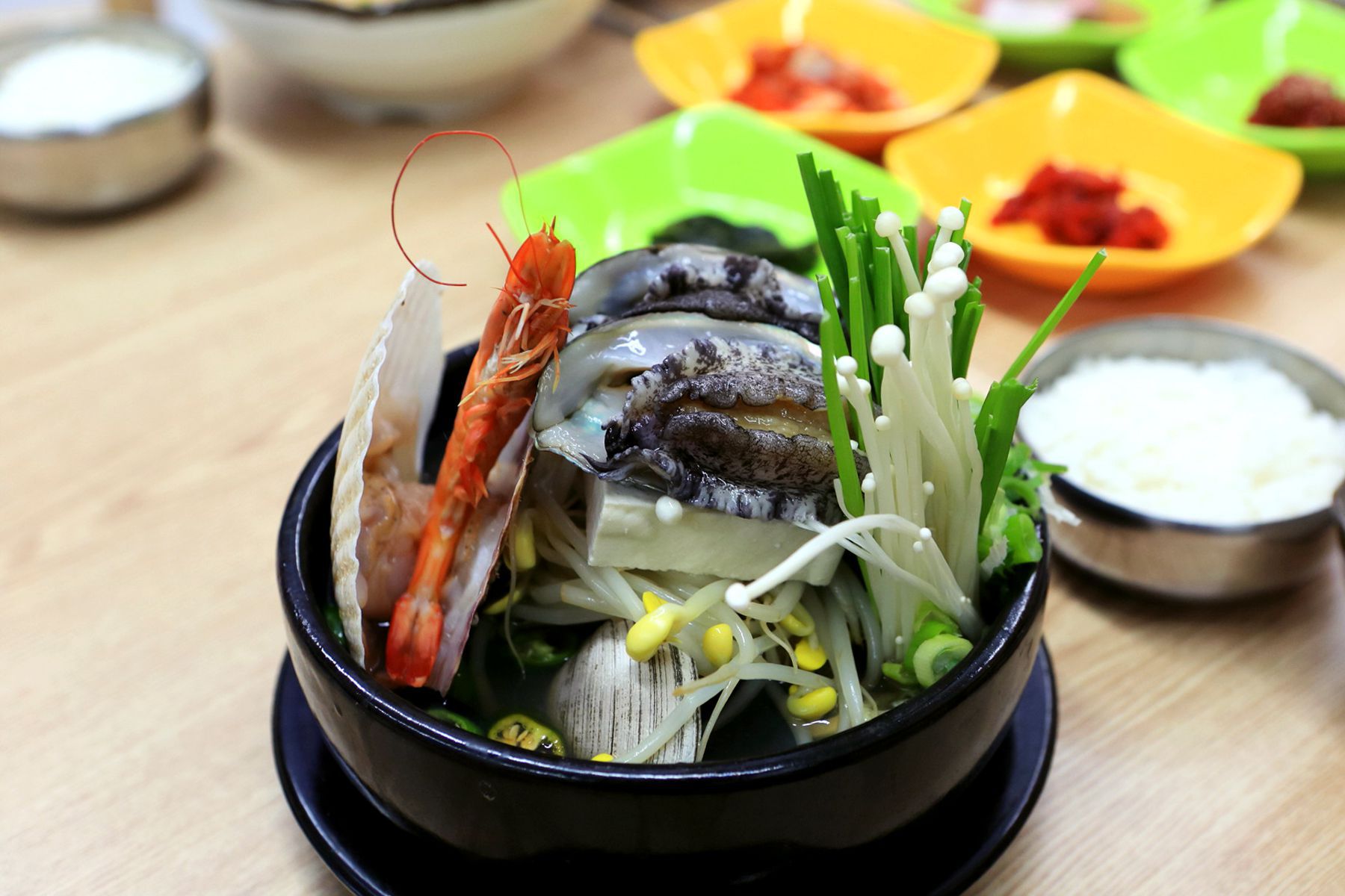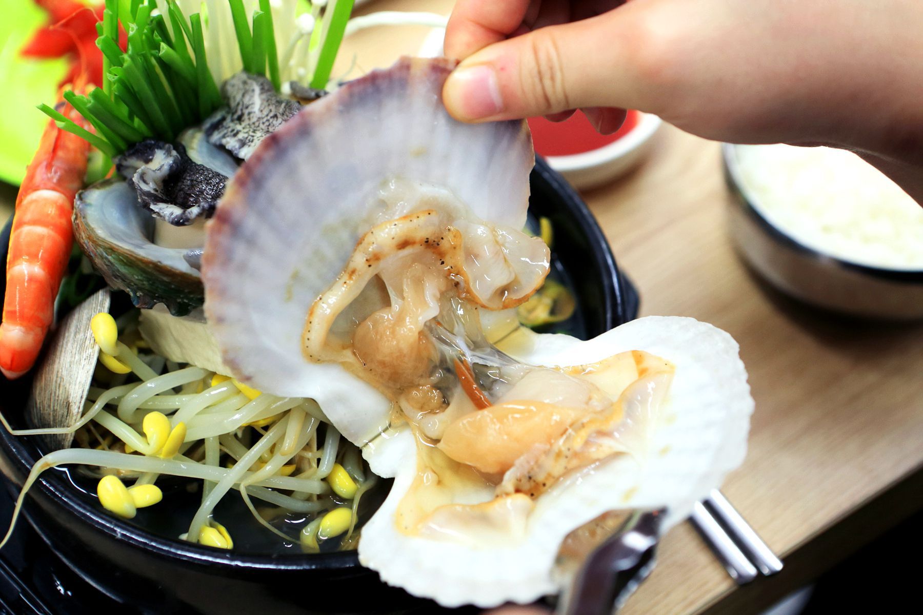 뜨거운 뚝배기의 열기로 익혀진 식감좋은 전복의 풍부한 맛과 영양 그리고 신선함이 한눈에 보이는 가리비,새우등