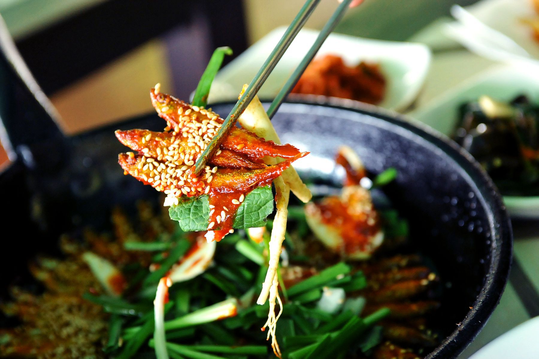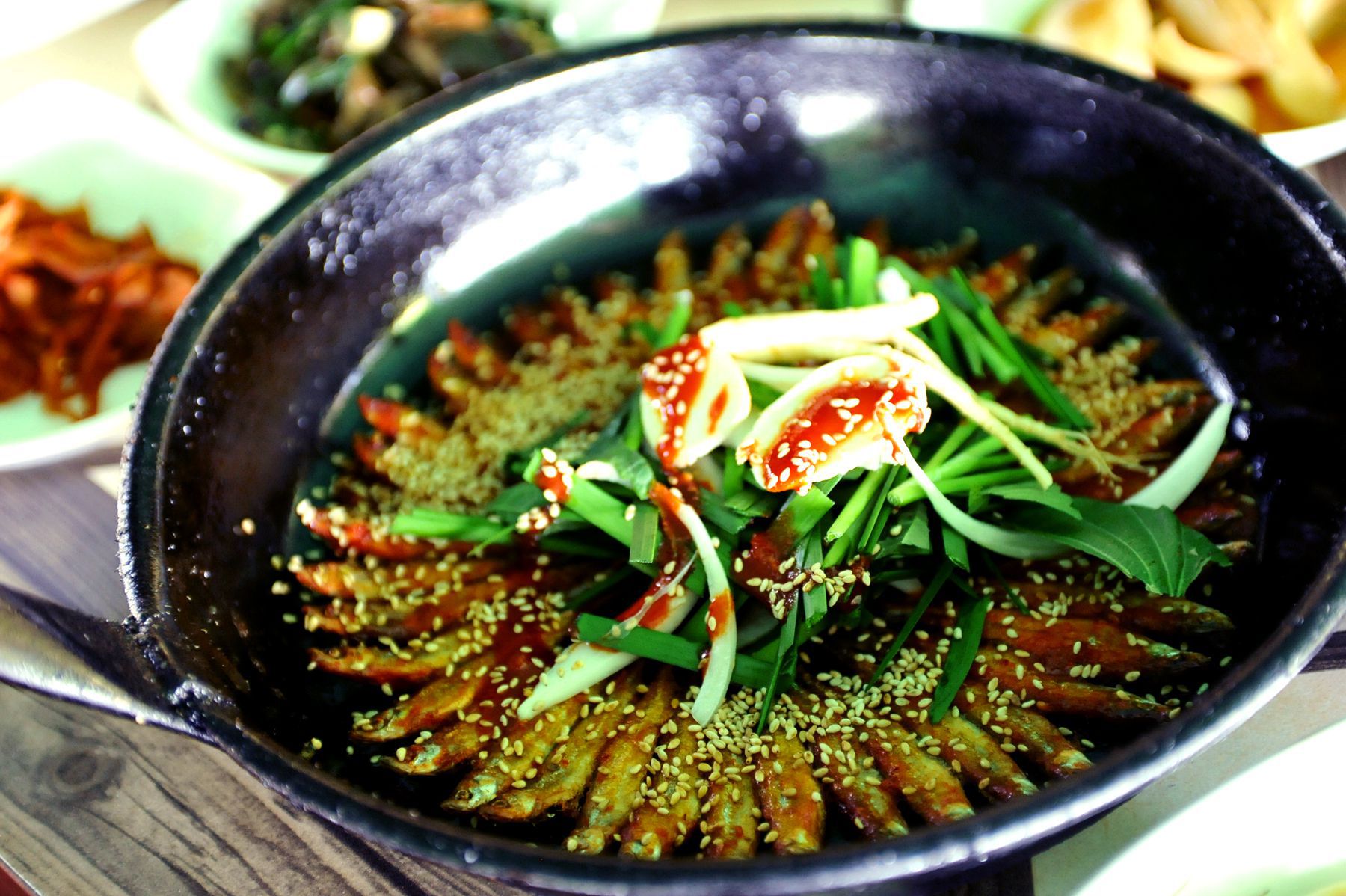 작은 민물고기를 팬에 동그랗게 담아 튀긴 후 누구나 좋아하는 고추장양념에 조린 음식인 도리뱅뱅이는