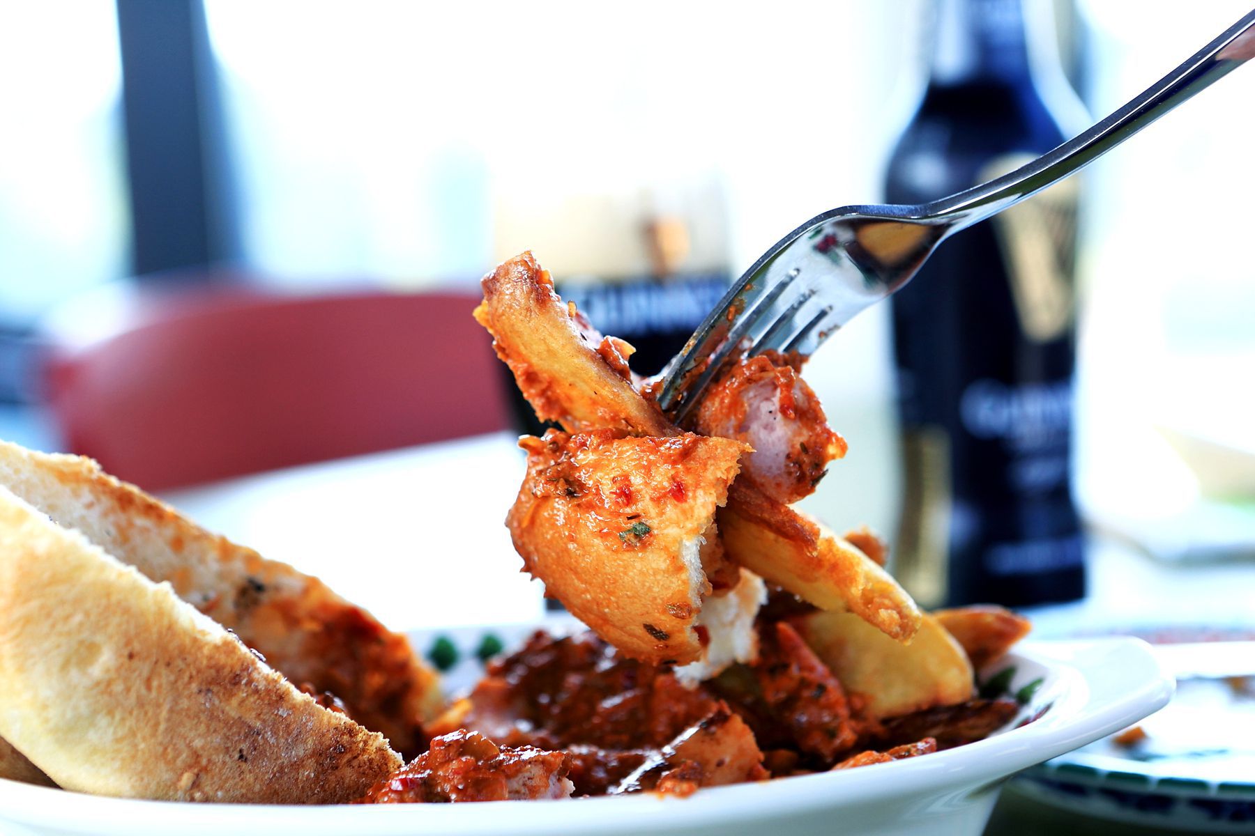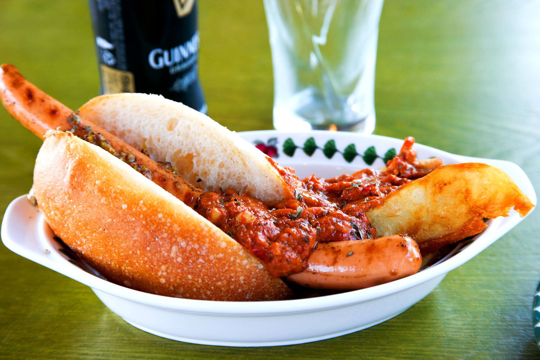 매콤한 토마토소스와 바삭한 감자튀김 그리고 육즙 가득한 소시지와 고소한 빵이 곁들여진