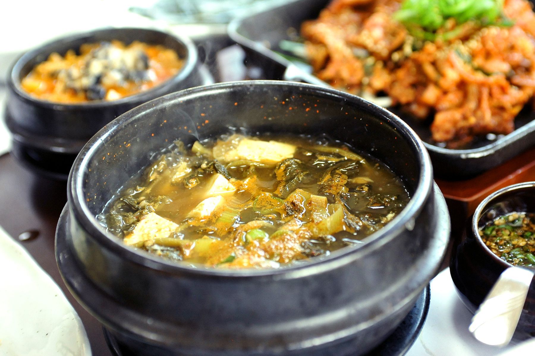 구수한 시래기 된장국과 함께 쌈밤정식의대표메뉴 우렁이 가득든 짭조름한 강된장,