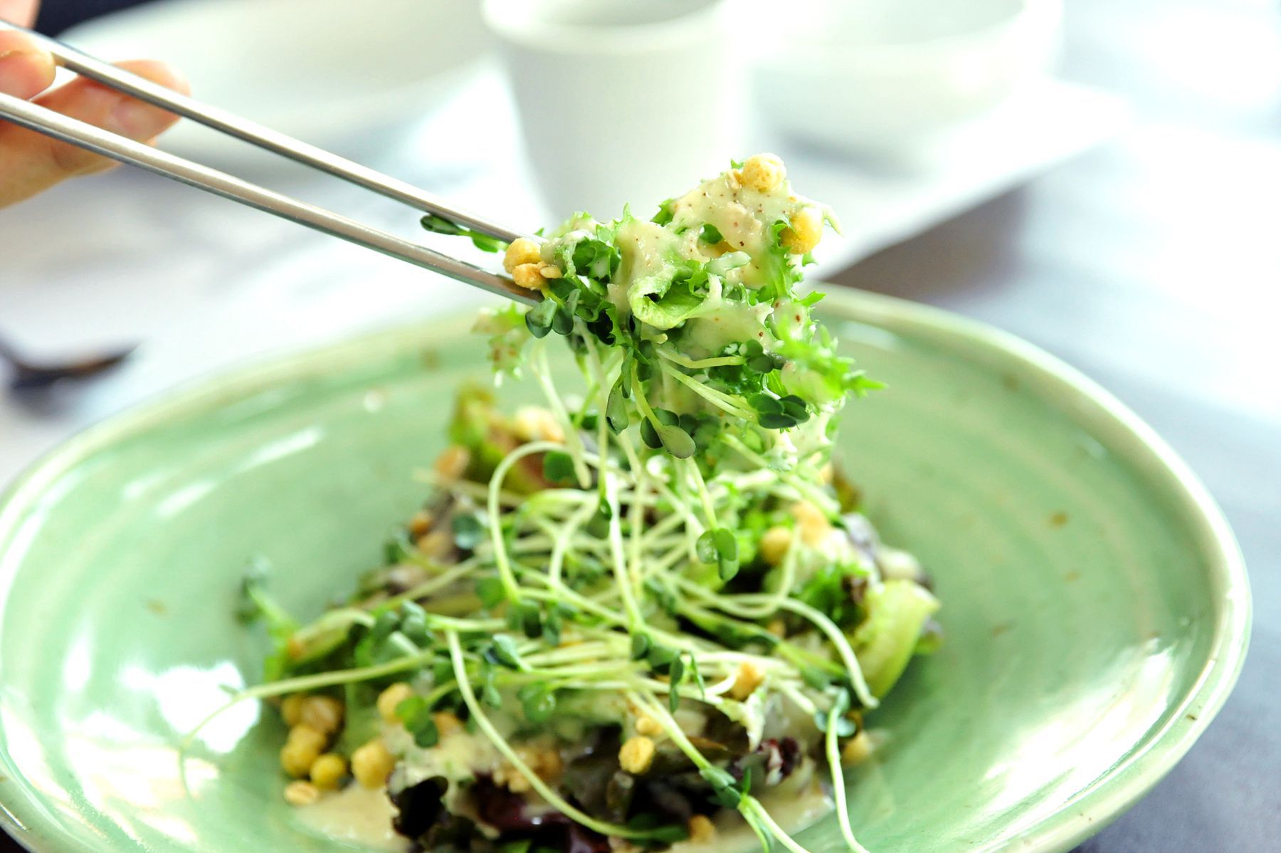 강된장쌈밥 밥꽃정식을 주문하시면 1차로 약초와 함께 신선한 야채샐러드가 나온 후